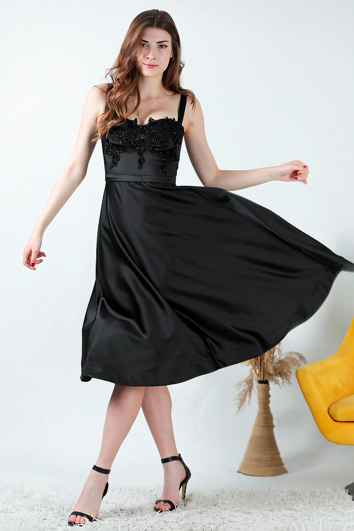 Kadın Midi Boy Saten Abiye Siyah