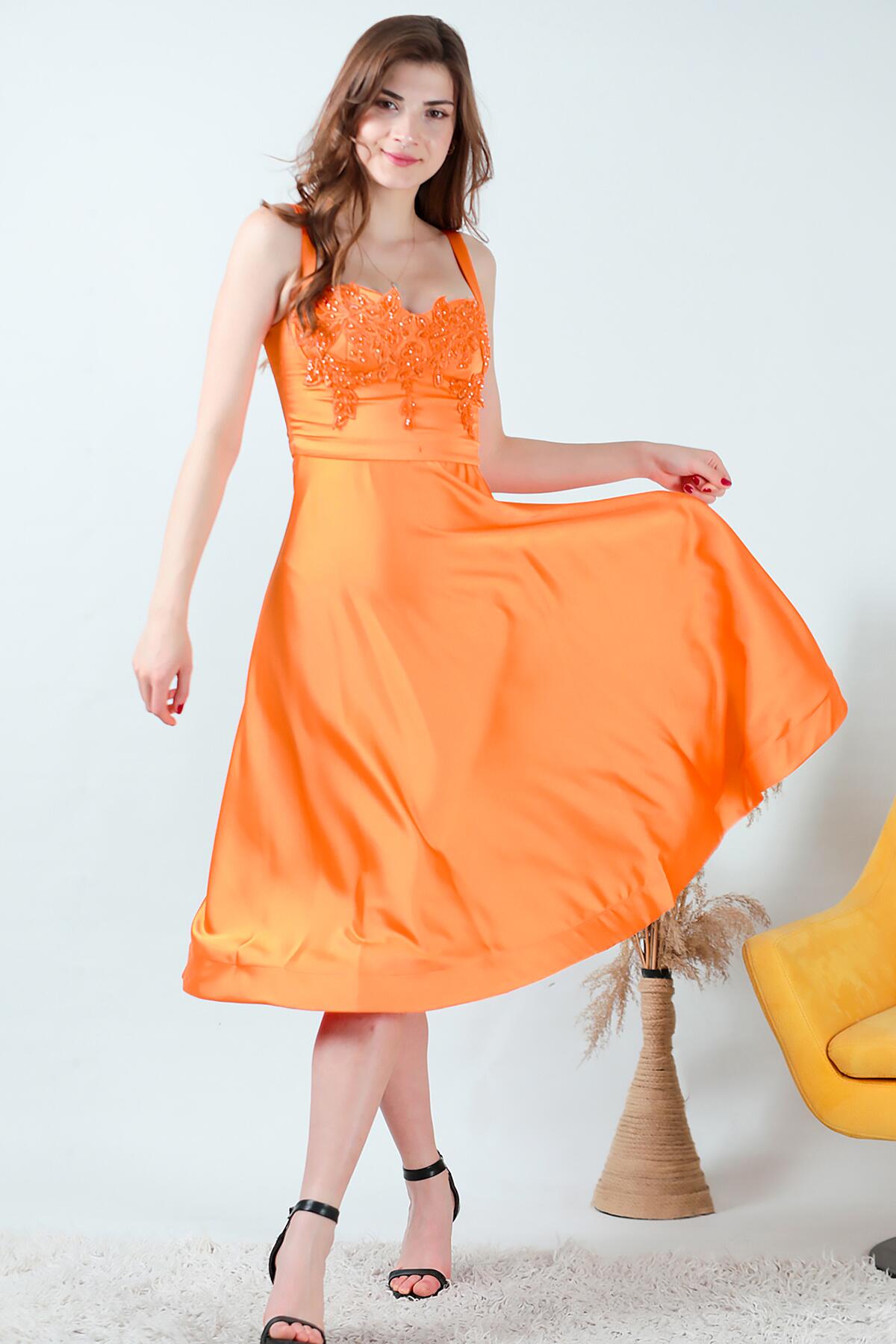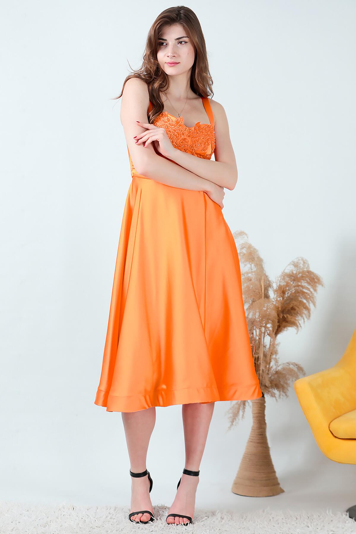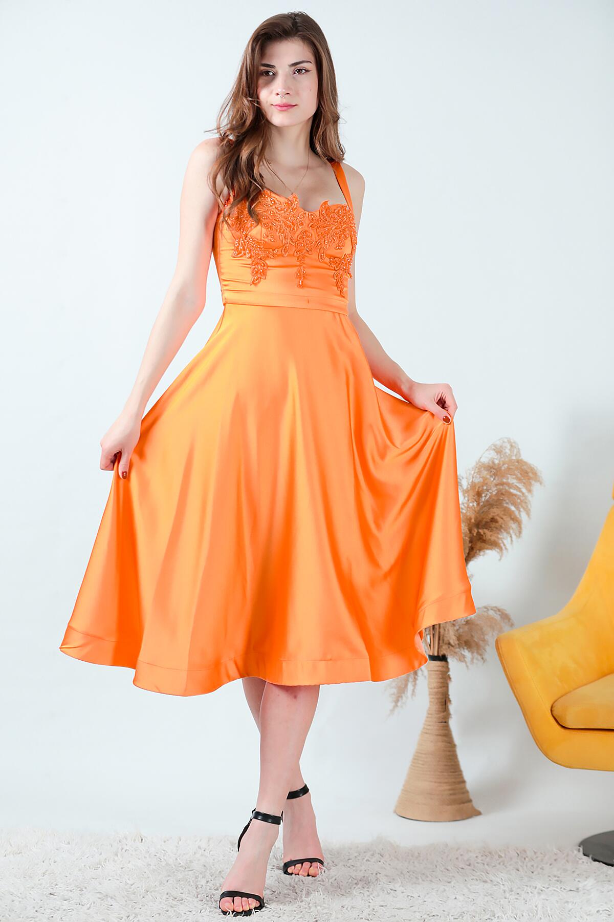 Kadın Midi Boy Saten Abiye Turuncu