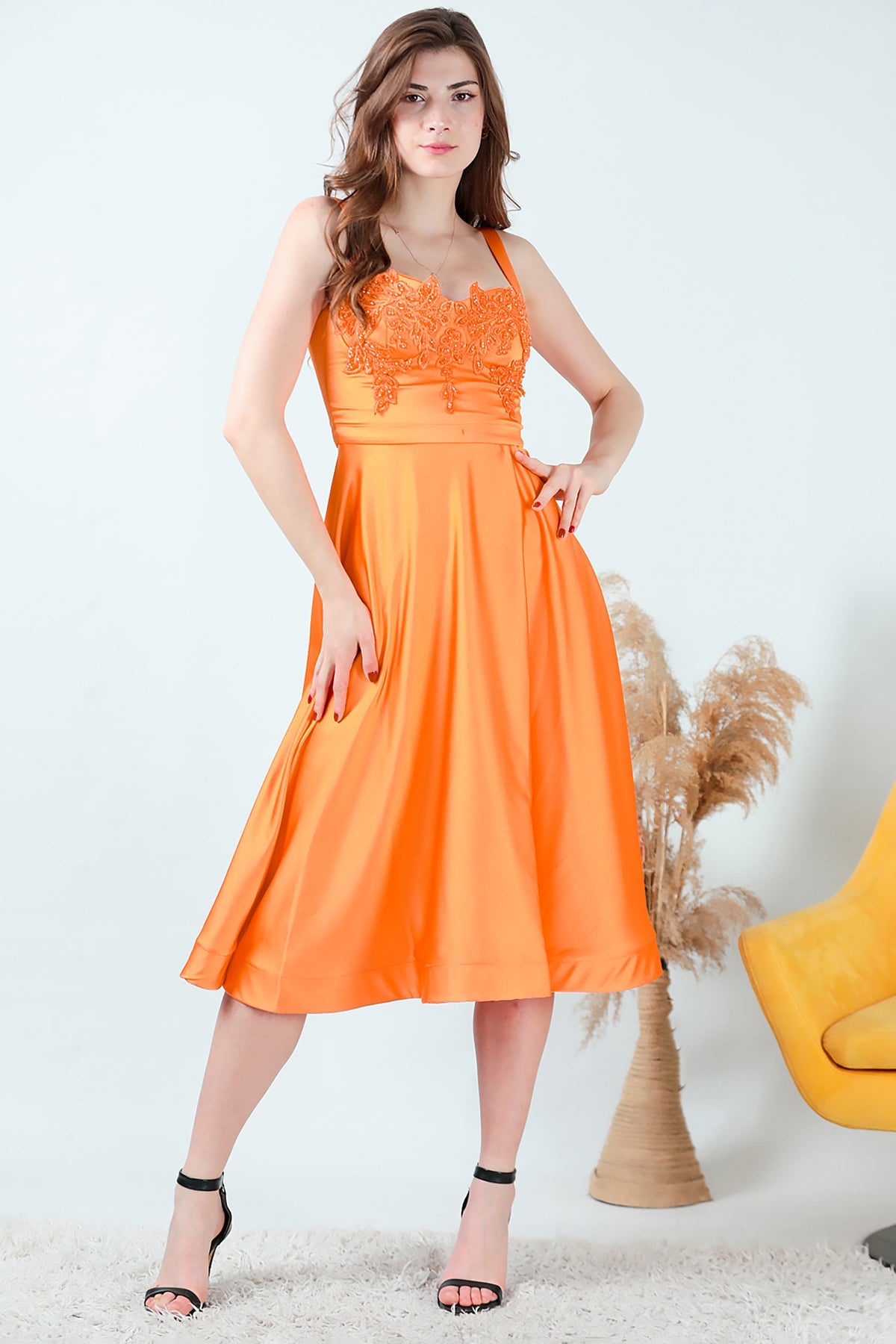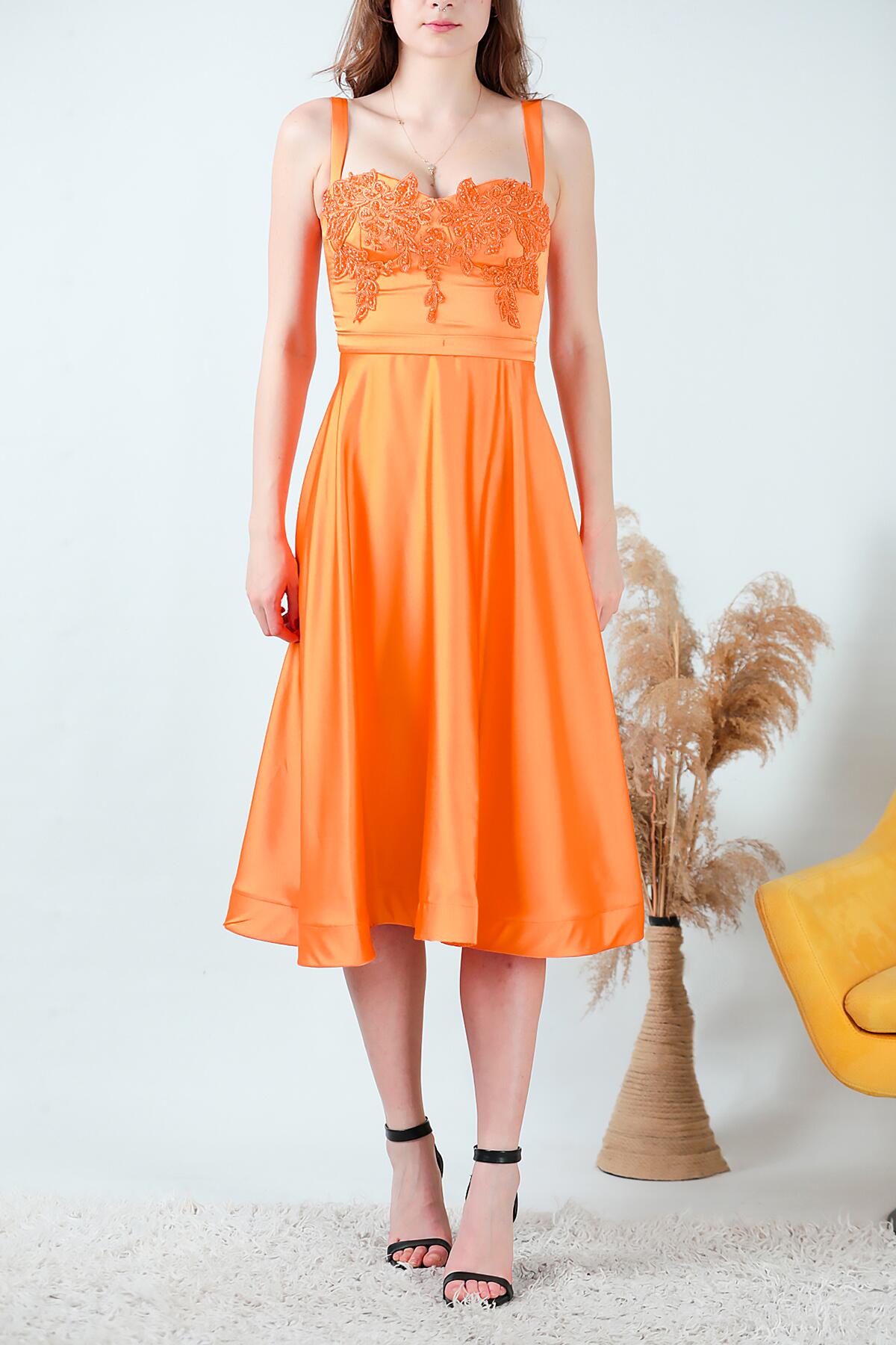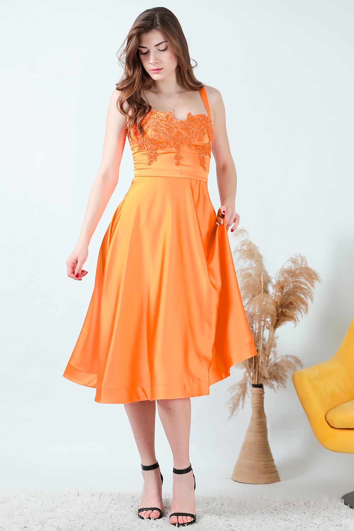Kadın Midi Boy Saten Abiye Turuncu