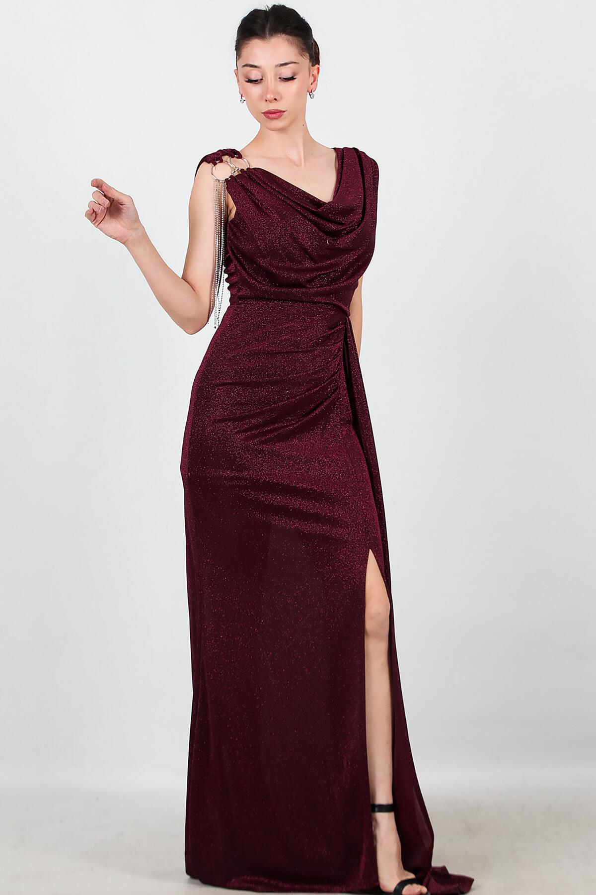Kadın Omuz Aksesuar Detay Kolsuz Uzun Abiye Bordo