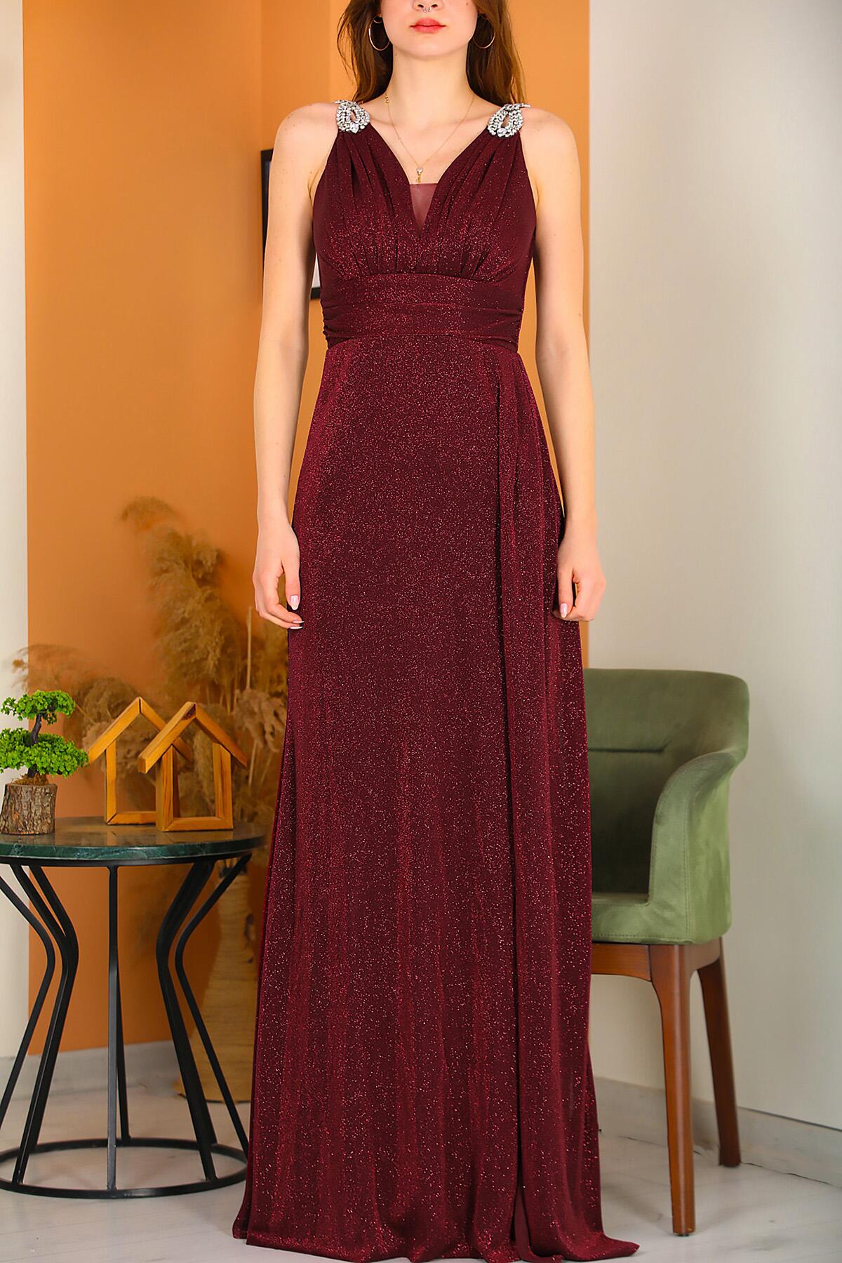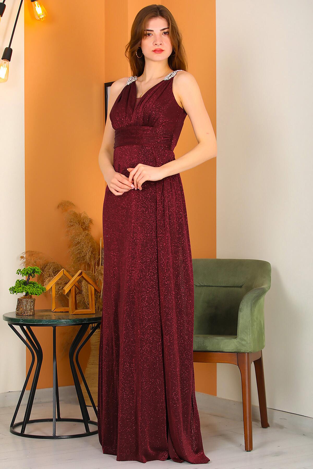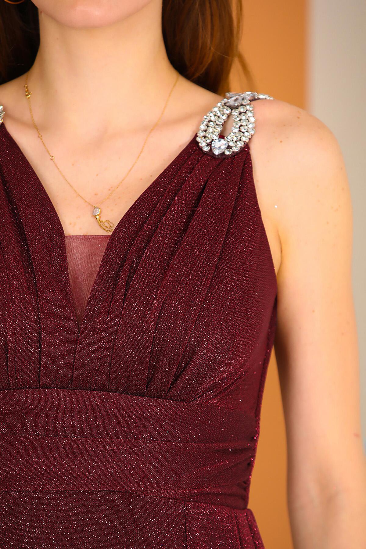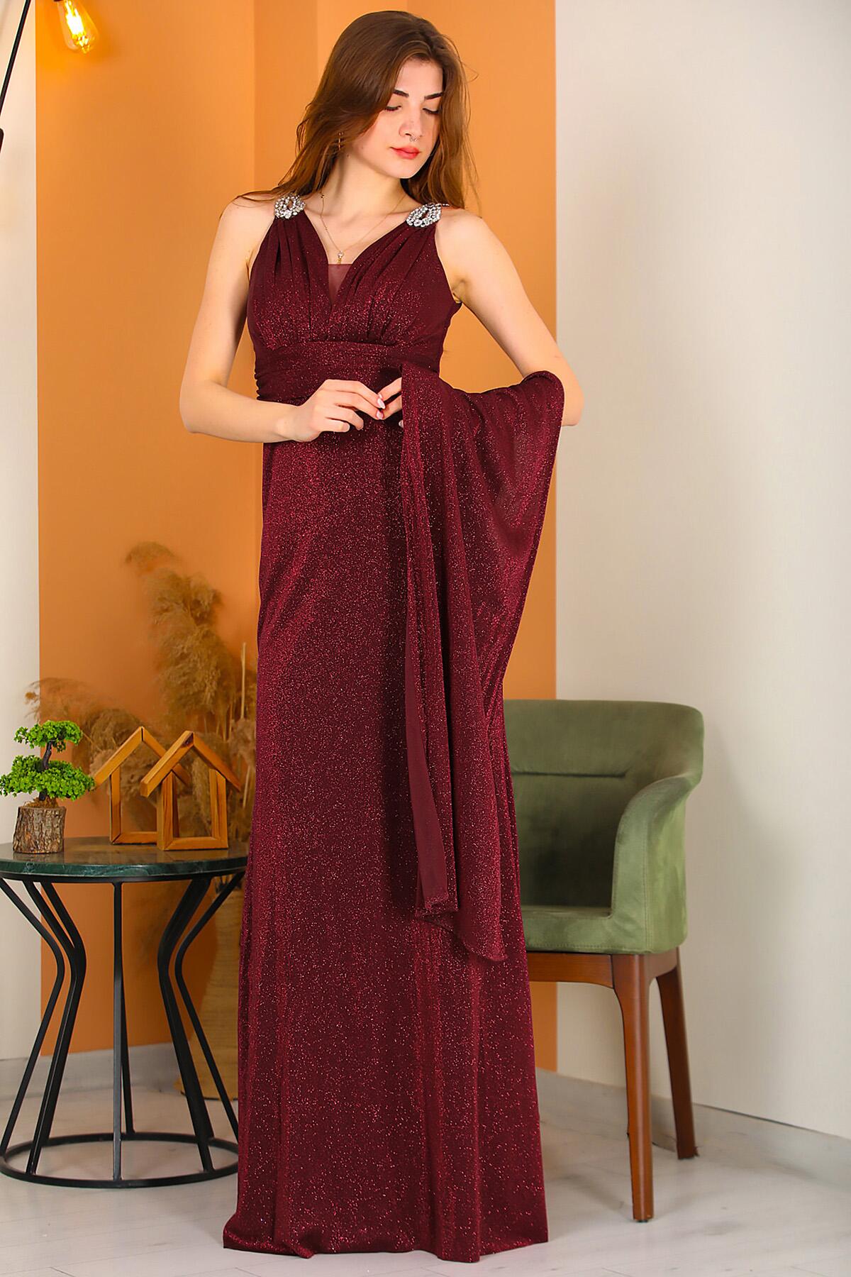 Kadın Omuz Aksesuarlı Uzun Simli Abiye Bordo