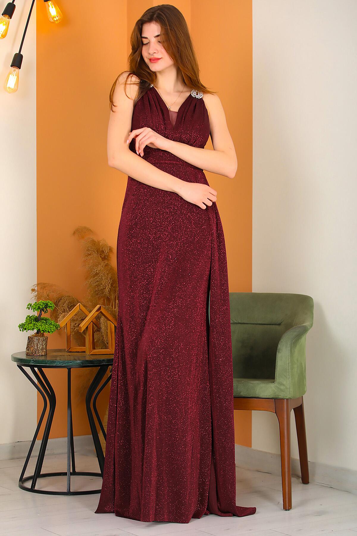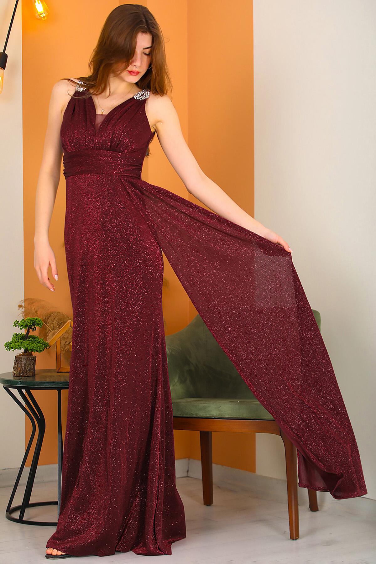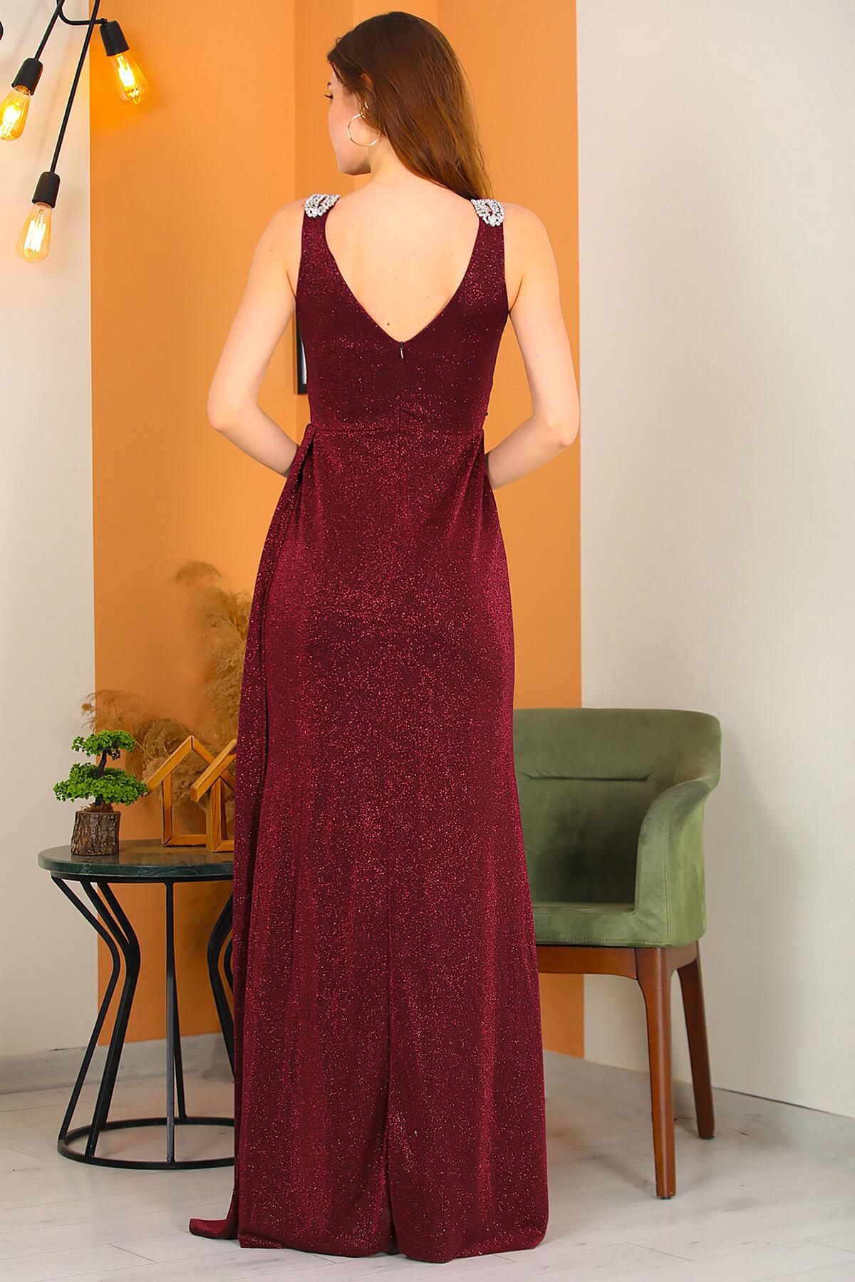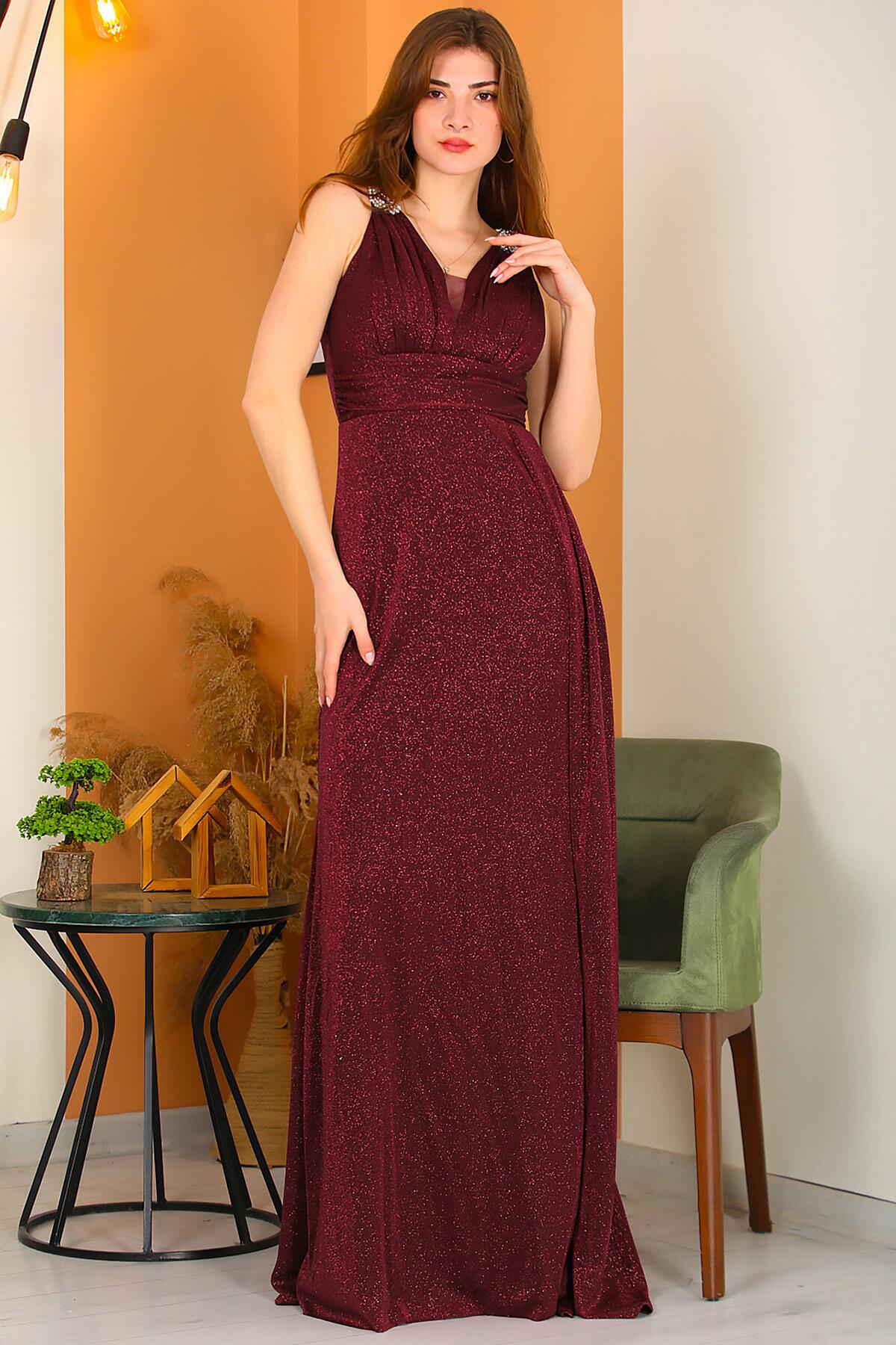 Kadın Omuz Aksesuarlı Uzun Simli Abiye Bordo
