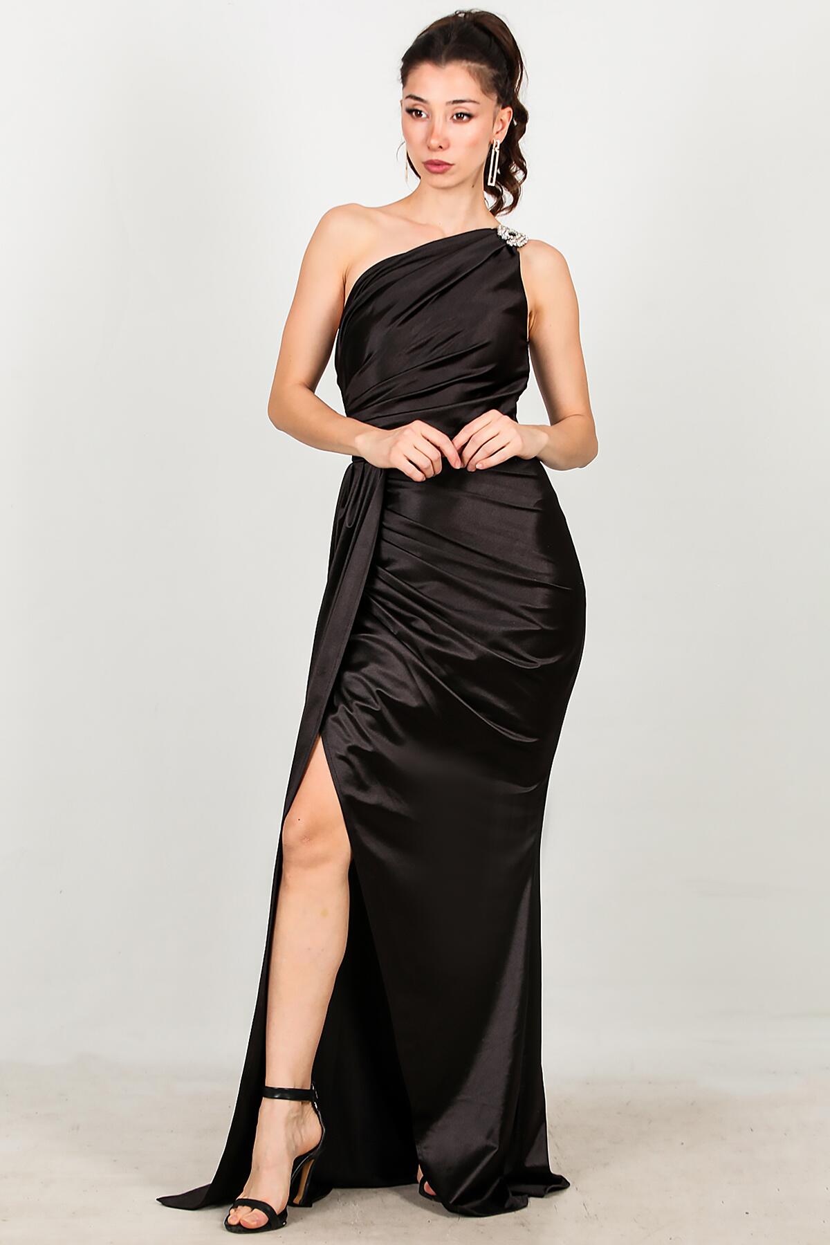 Kadın Omuz Aksesuarlı Uzun Saten Abiye Siyah