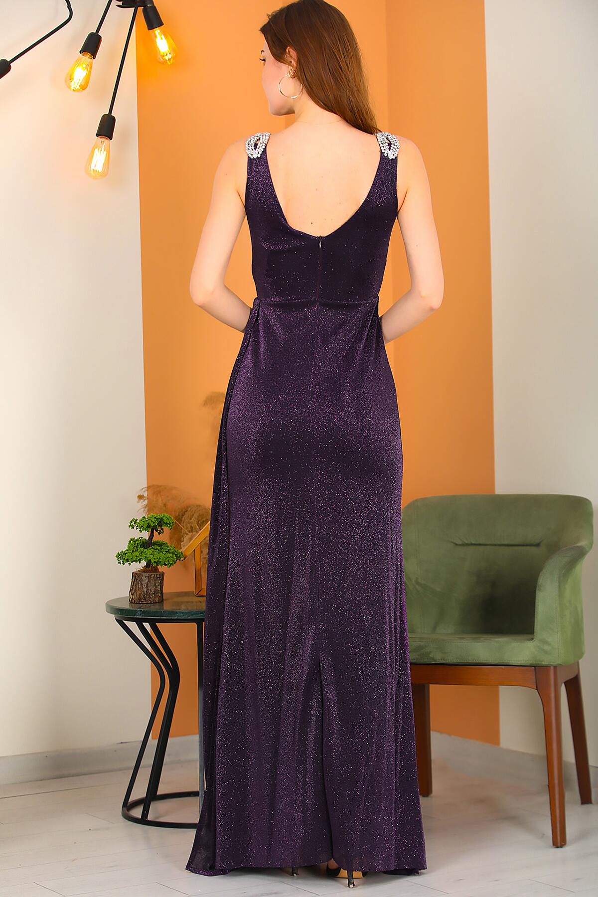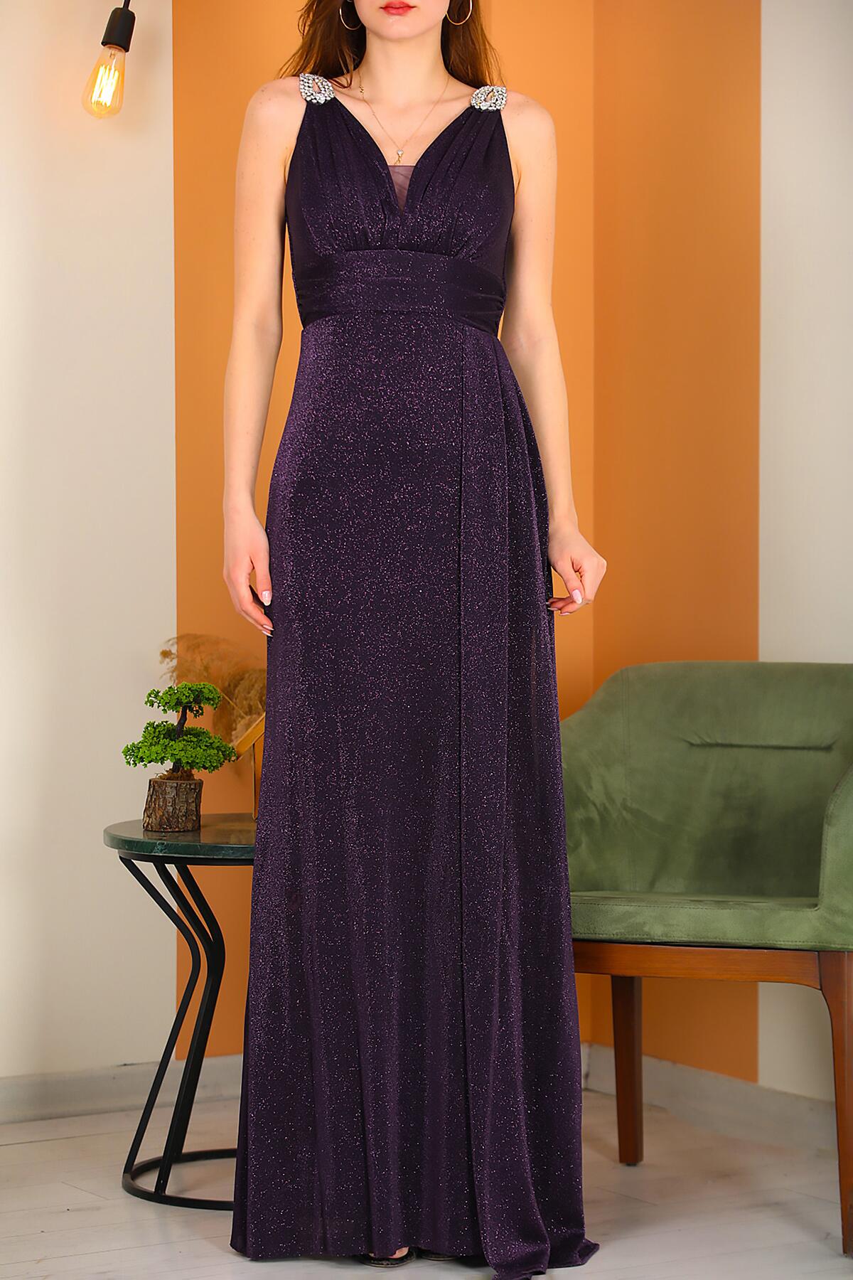 Kadın Omuz Aksesuarlı Uzun Simli Abiye Mor