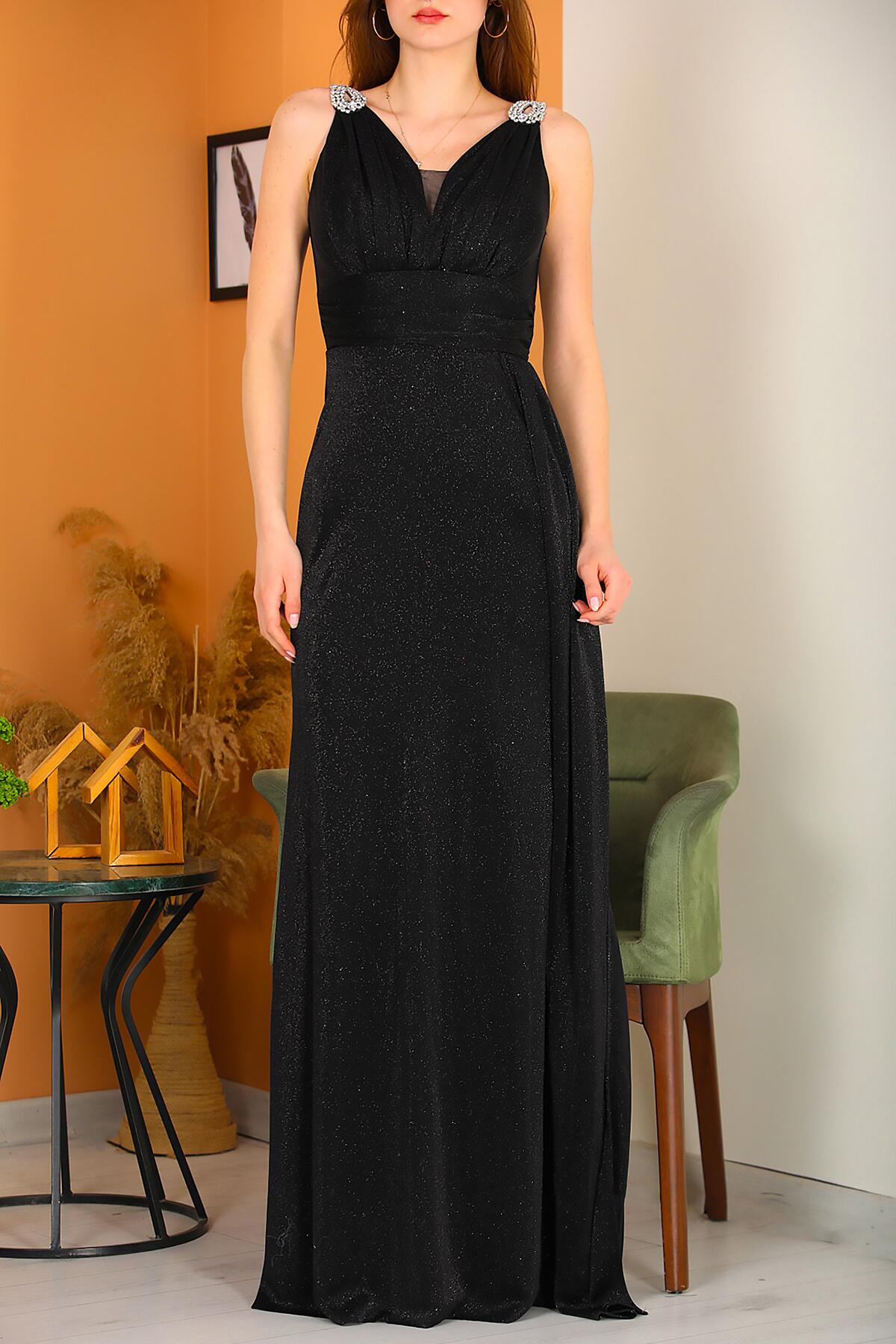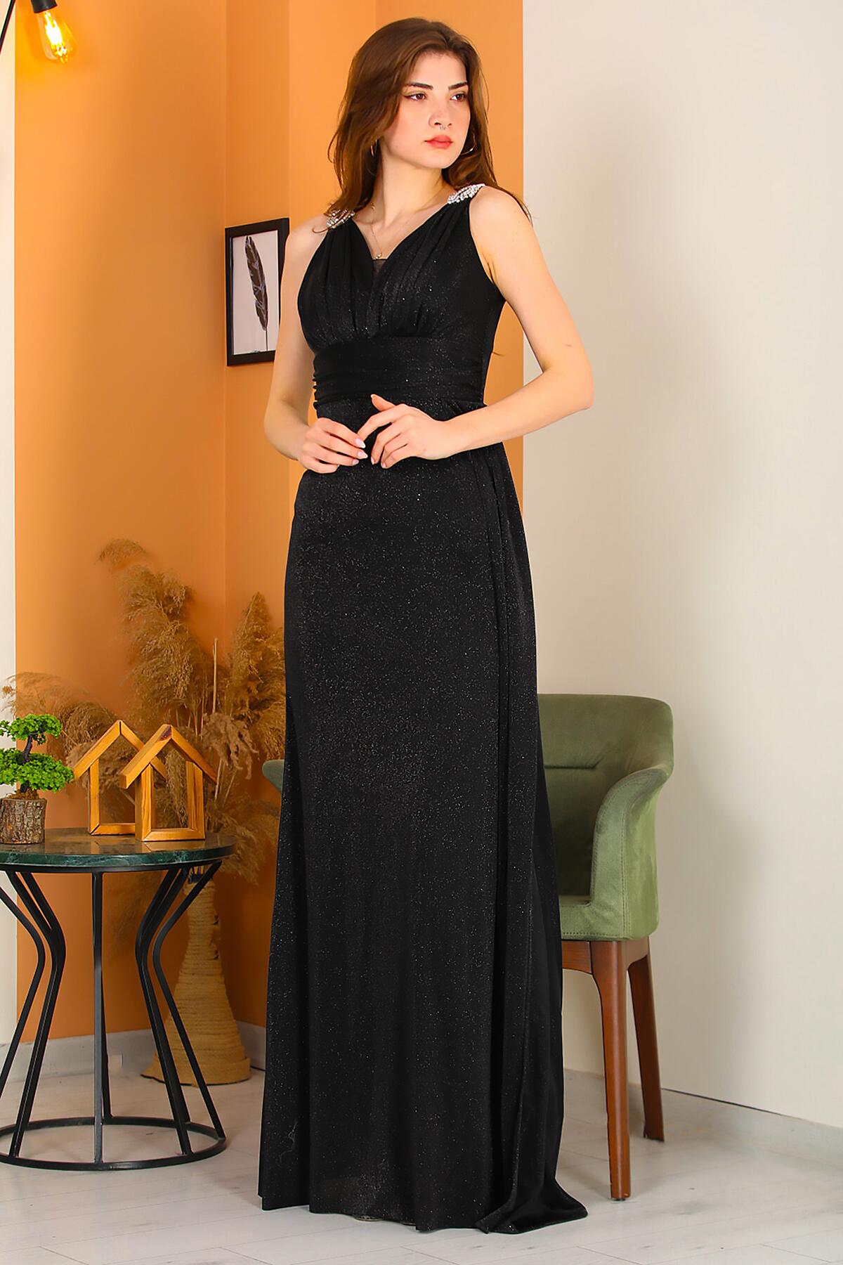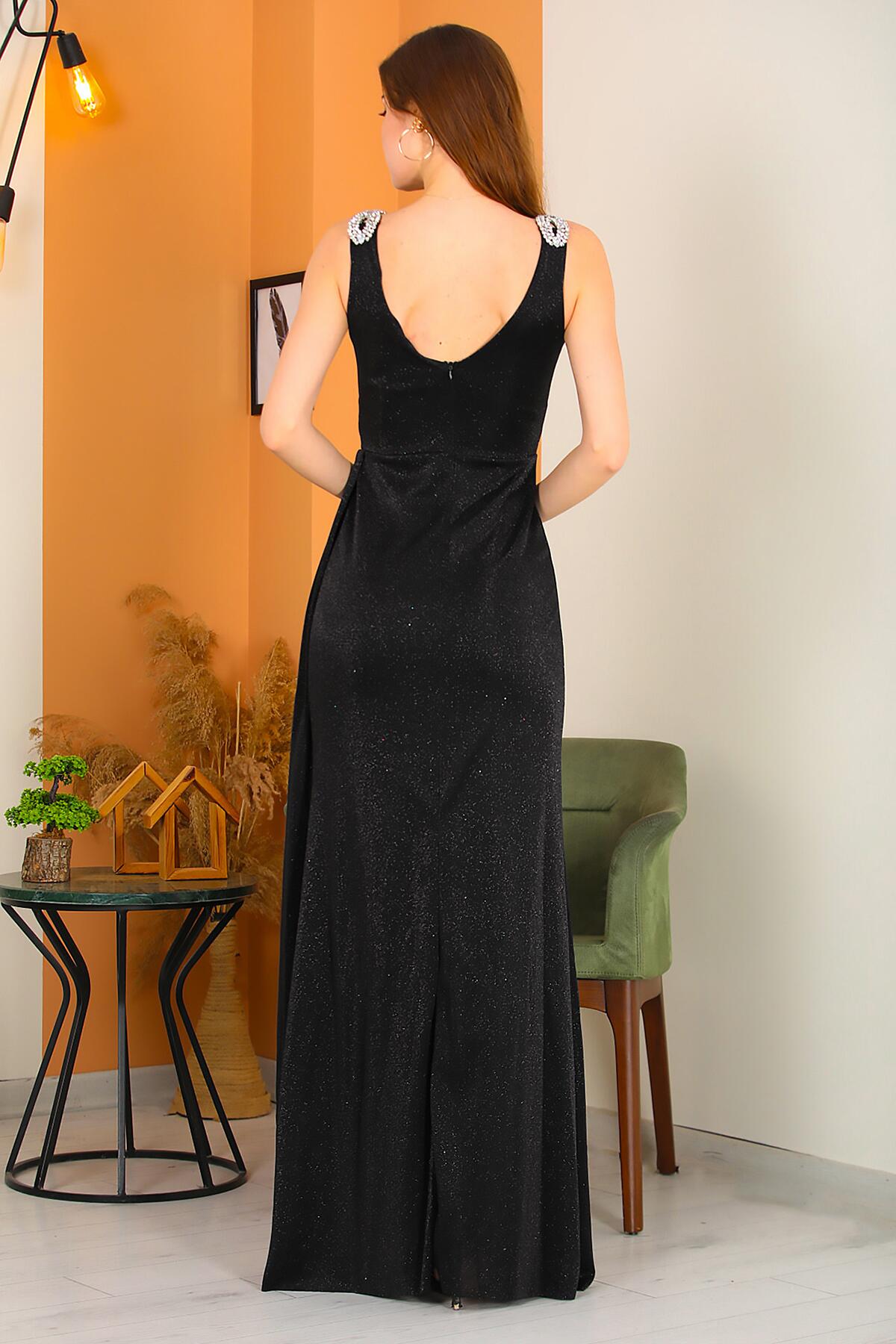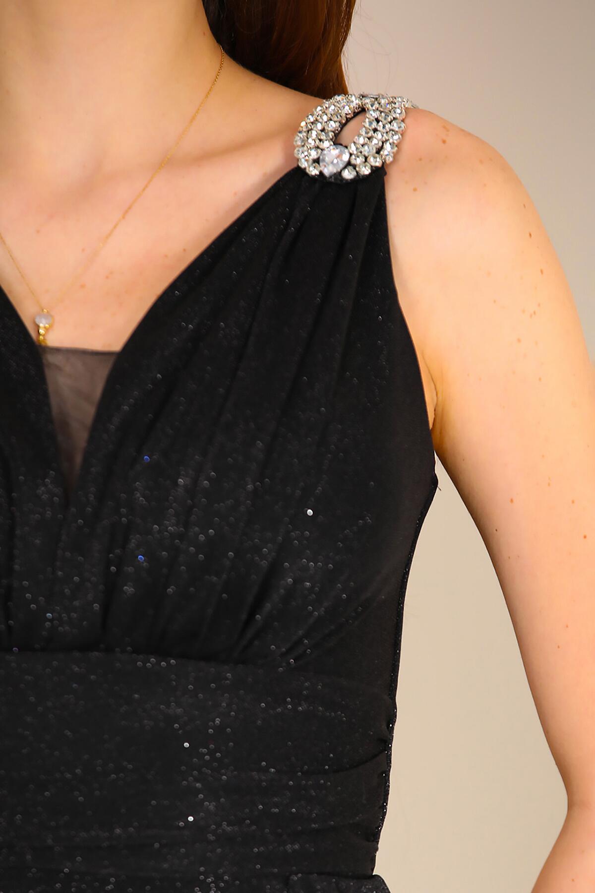 Kadın Omuz Aksesuarlı Uzun Simli Abiye Siyah