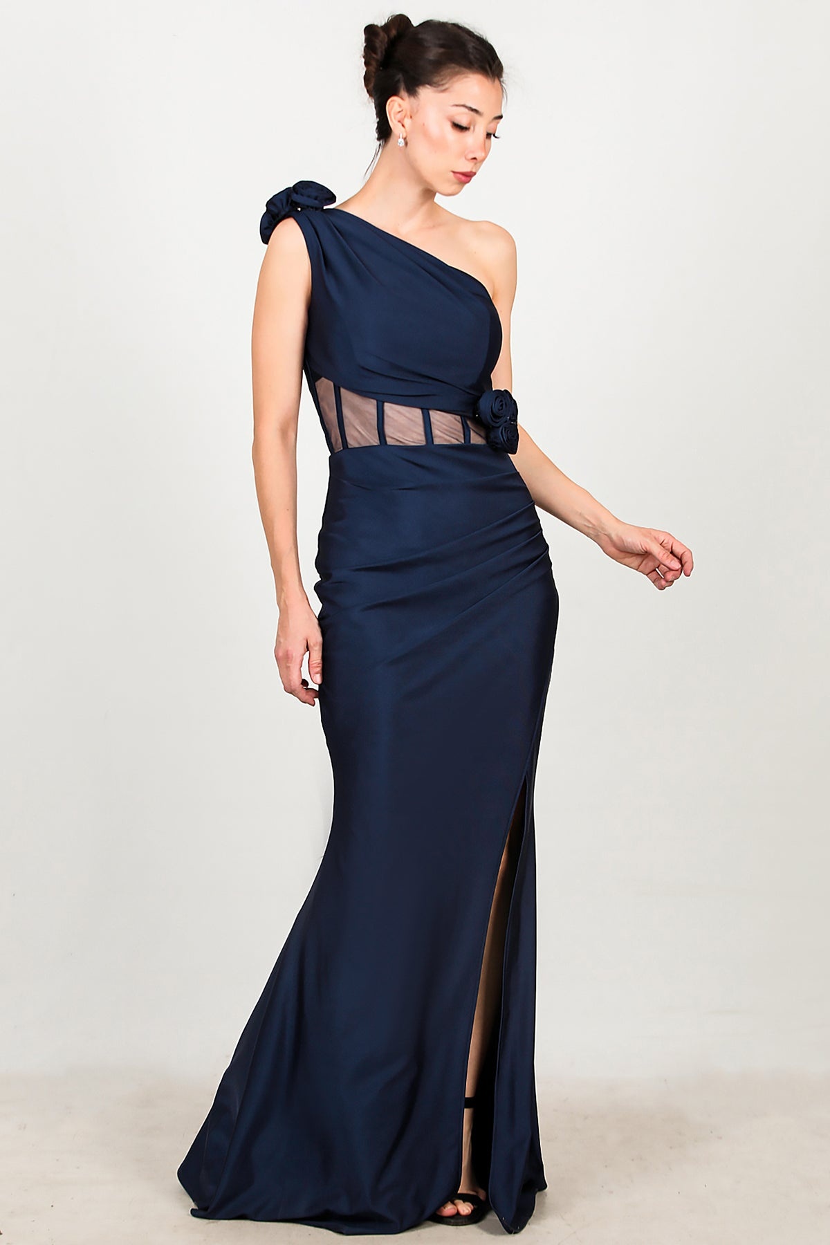 Kadın Omuz Bel Gül Detay Uzun Abiye Lacivert