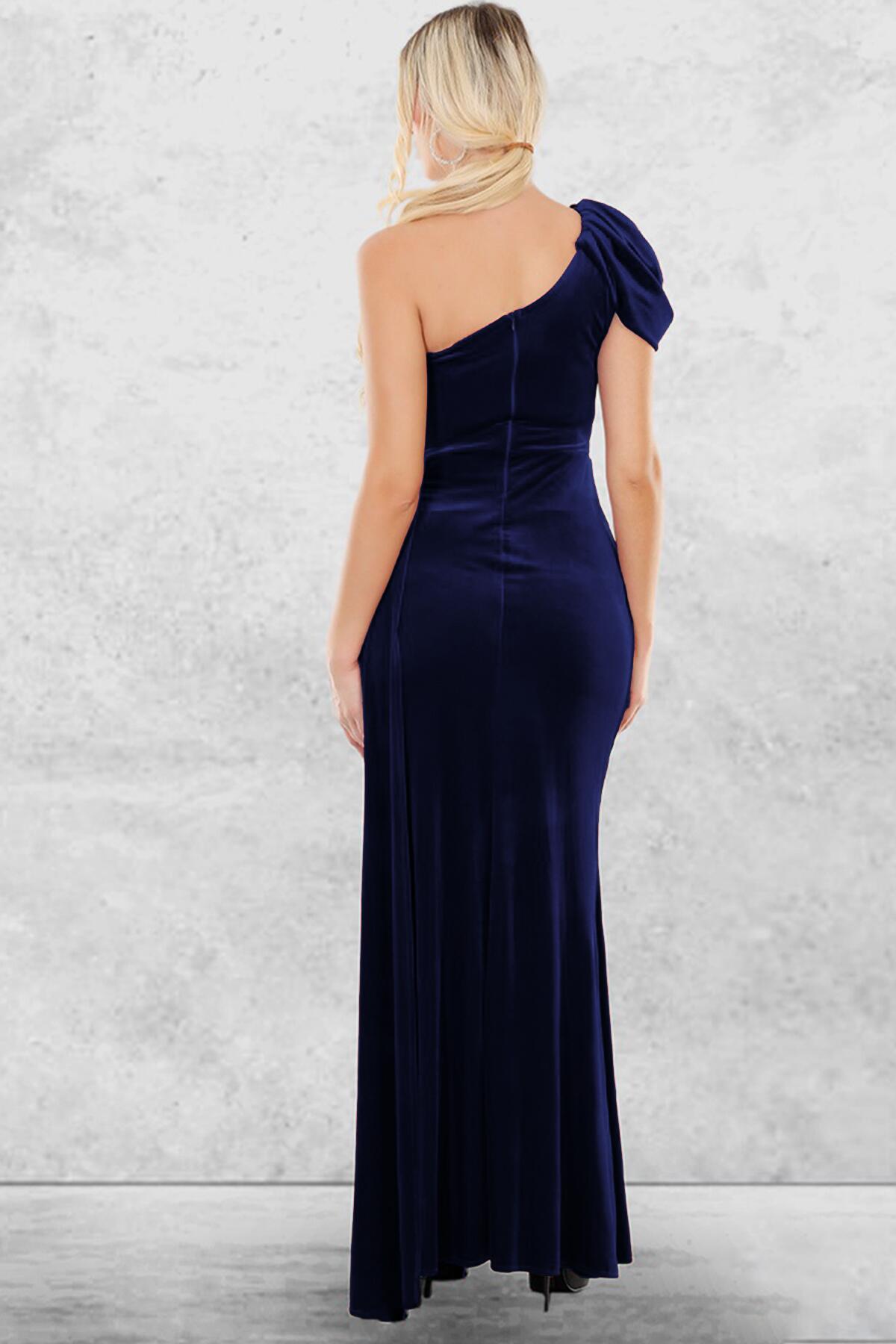 Kadın Omuz Detay Pileli Uzun Kadife Abiye Elbise Lacivert