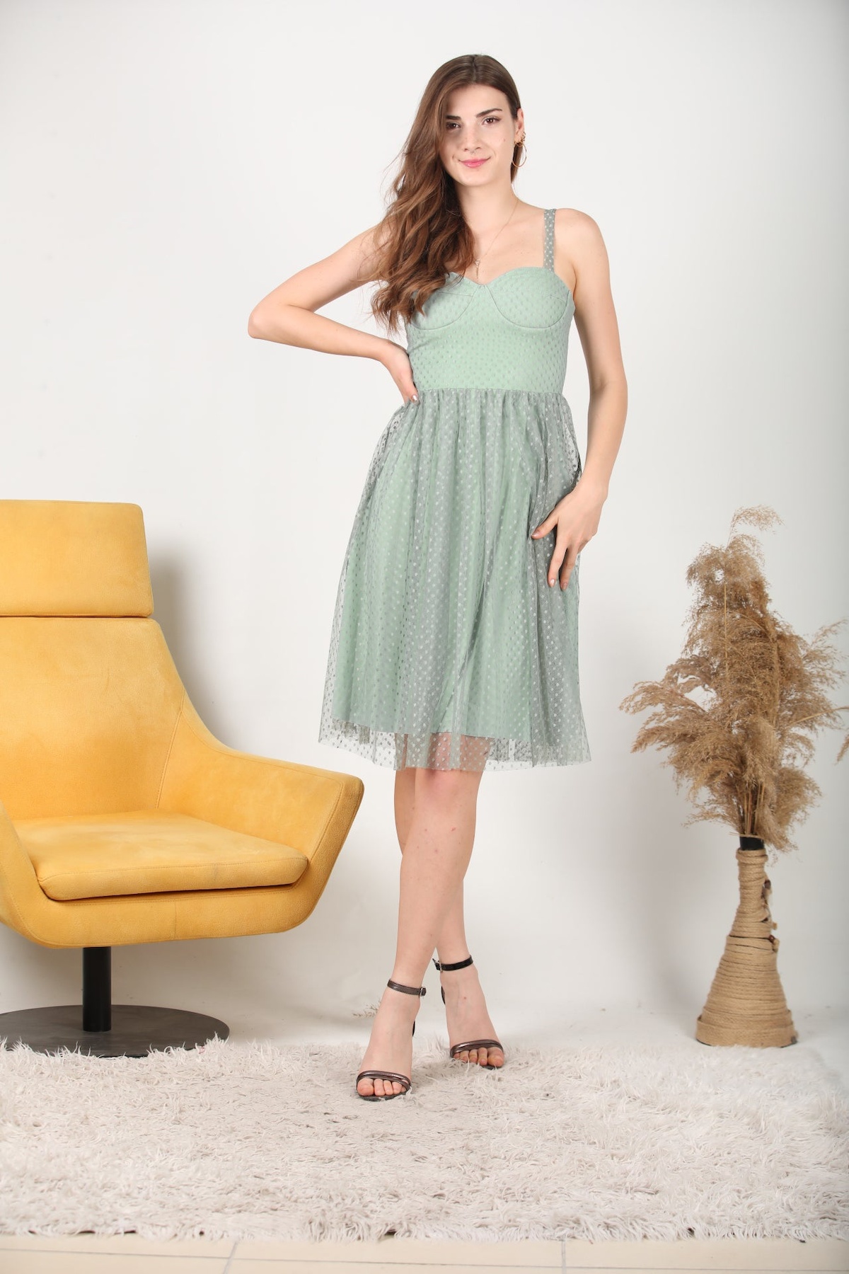 Kadın Puantiyeli Tül Elbise Çağla Yeşili