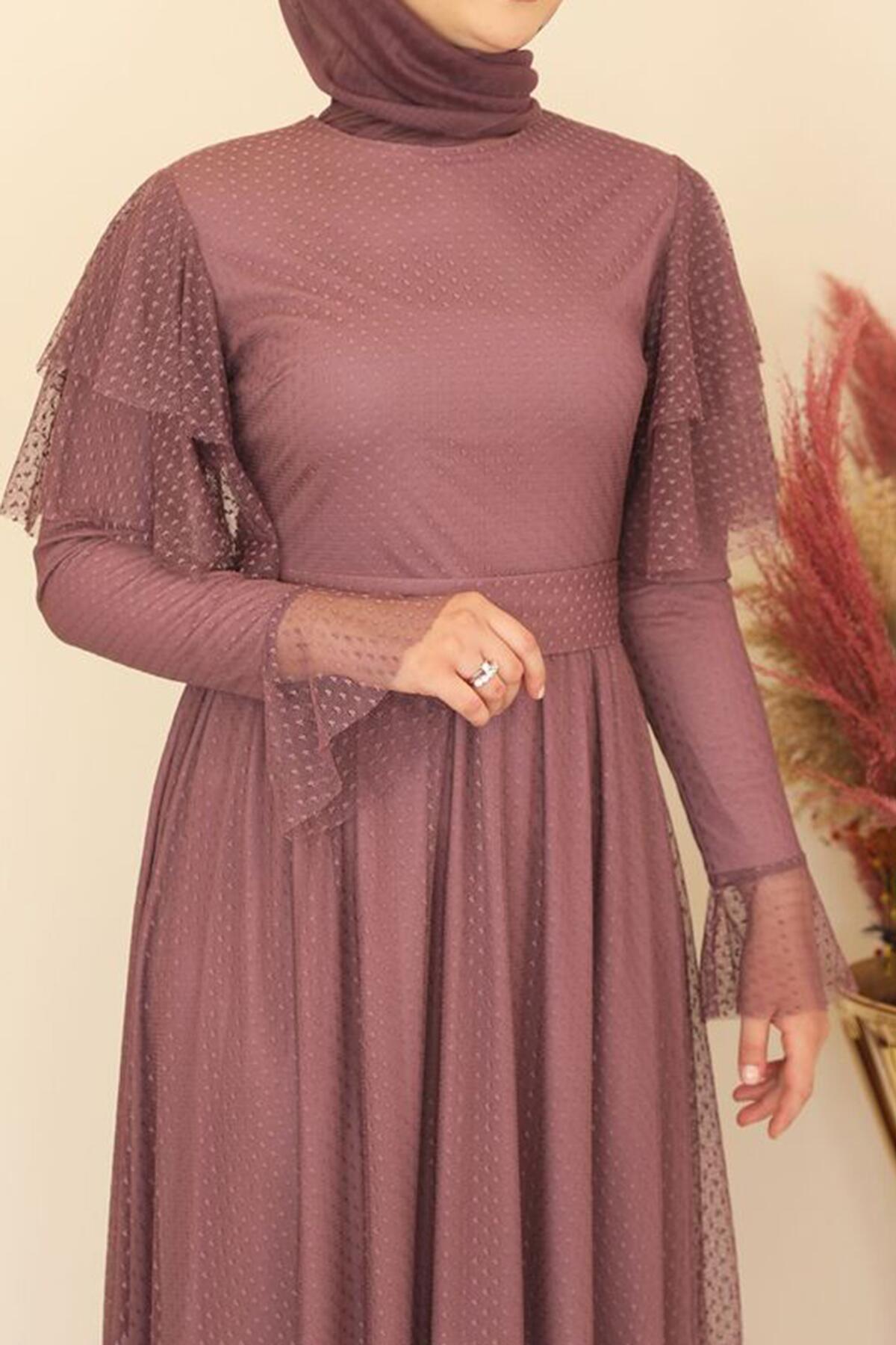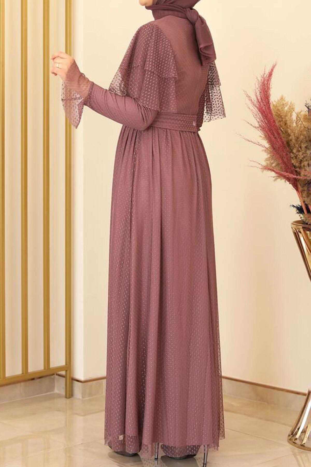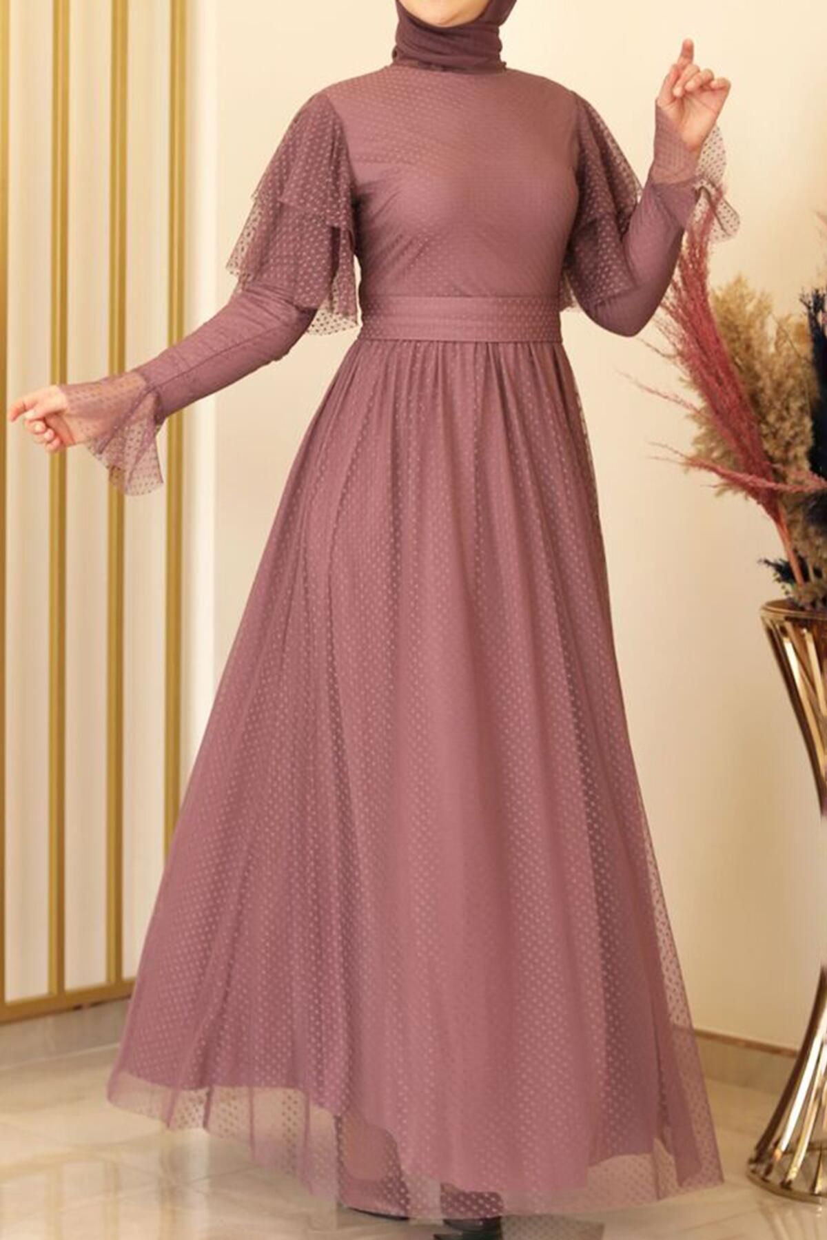 Kadın Puantiyeli Uzun Tül Abiye Gül Kurusu