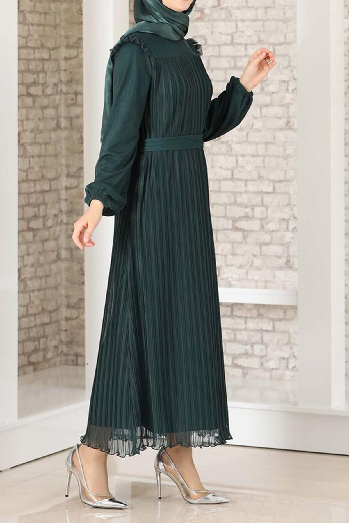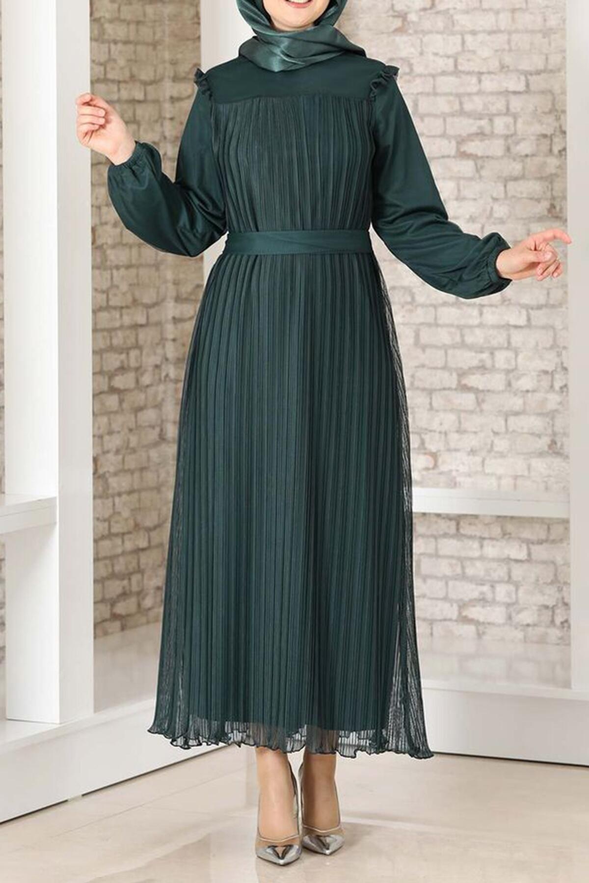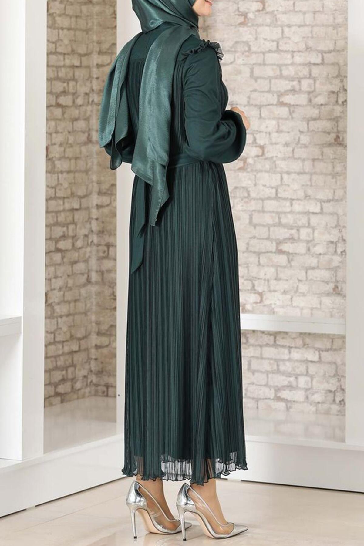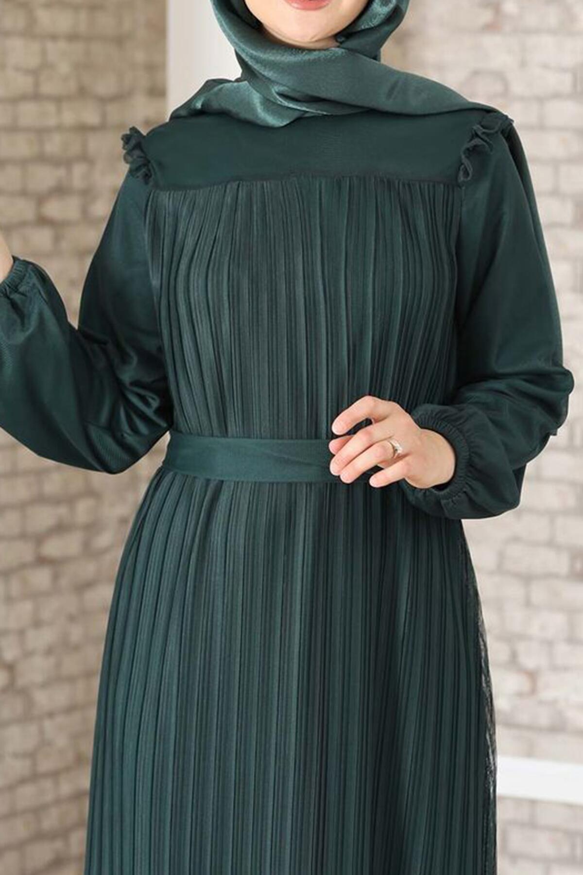 Kadın Robalı Boydan Pileli Tül Abiye Zümrüt