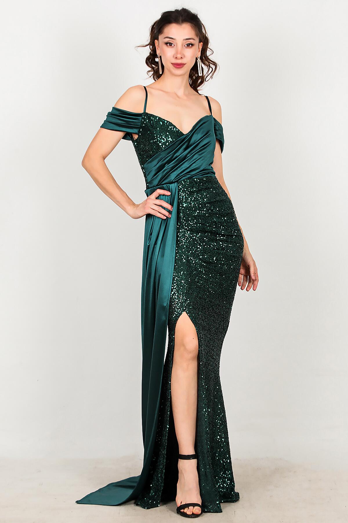Kadın Saten Detay Düşük Omuz Pullu Abiye Zümrüt