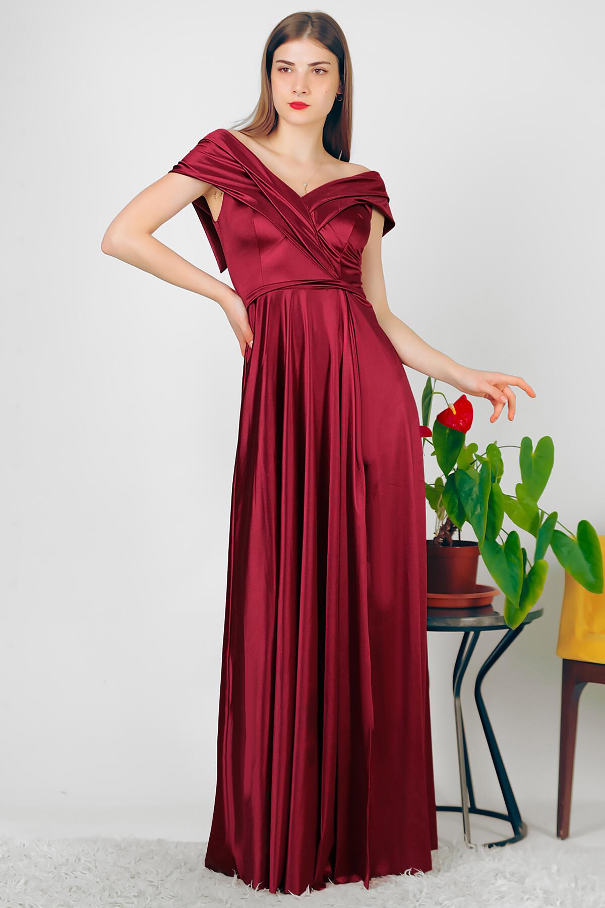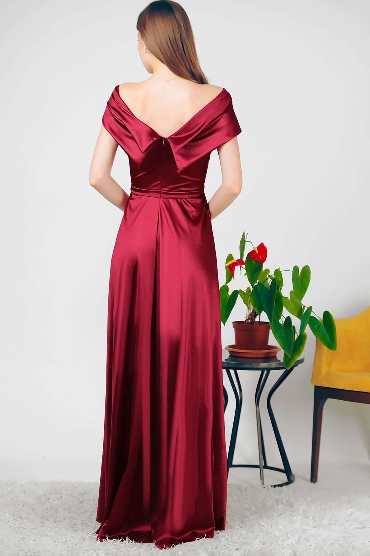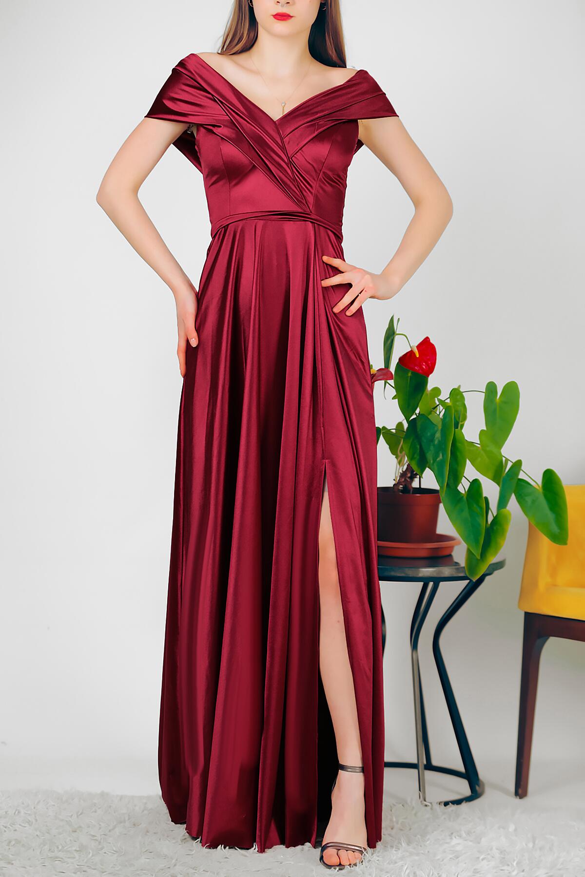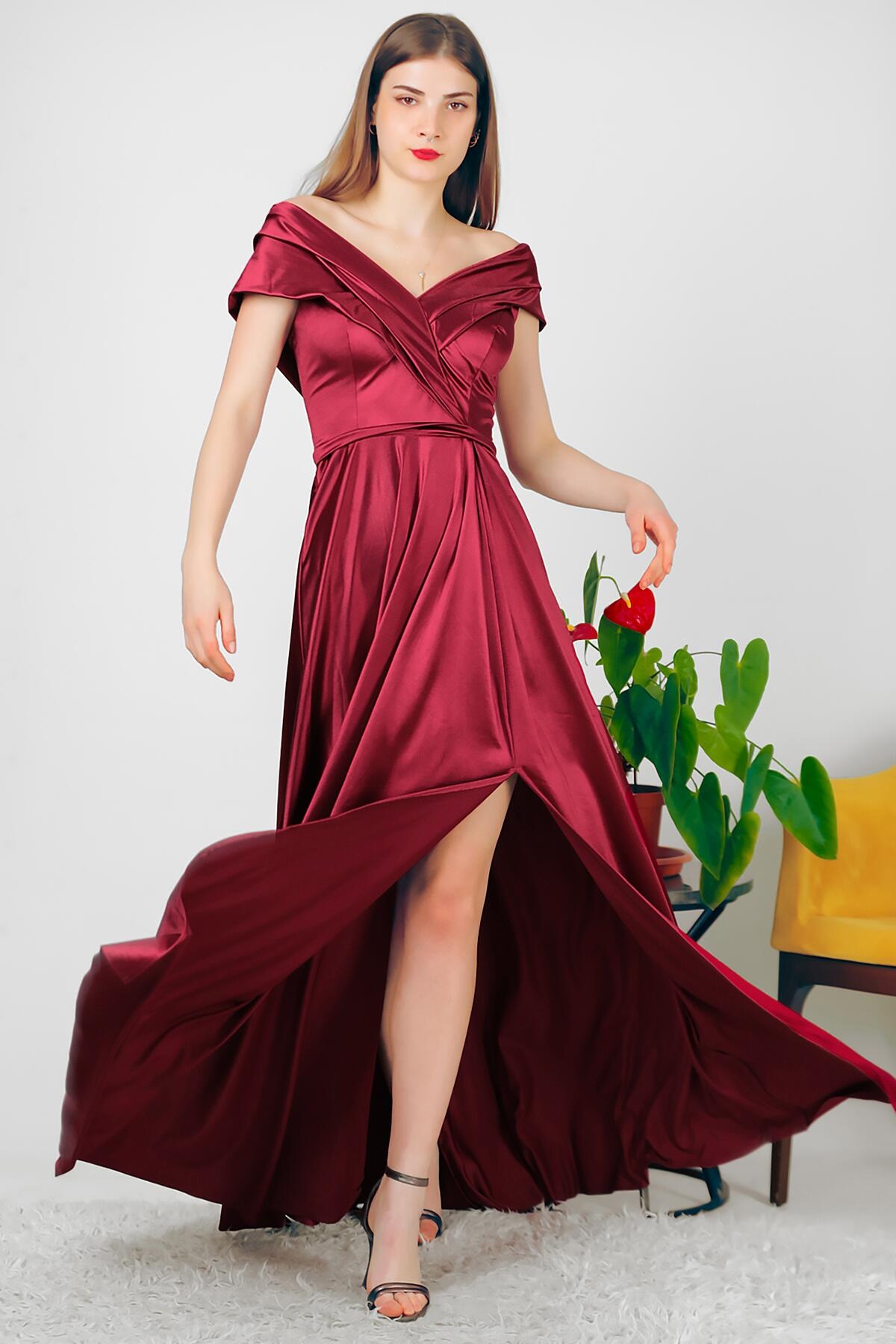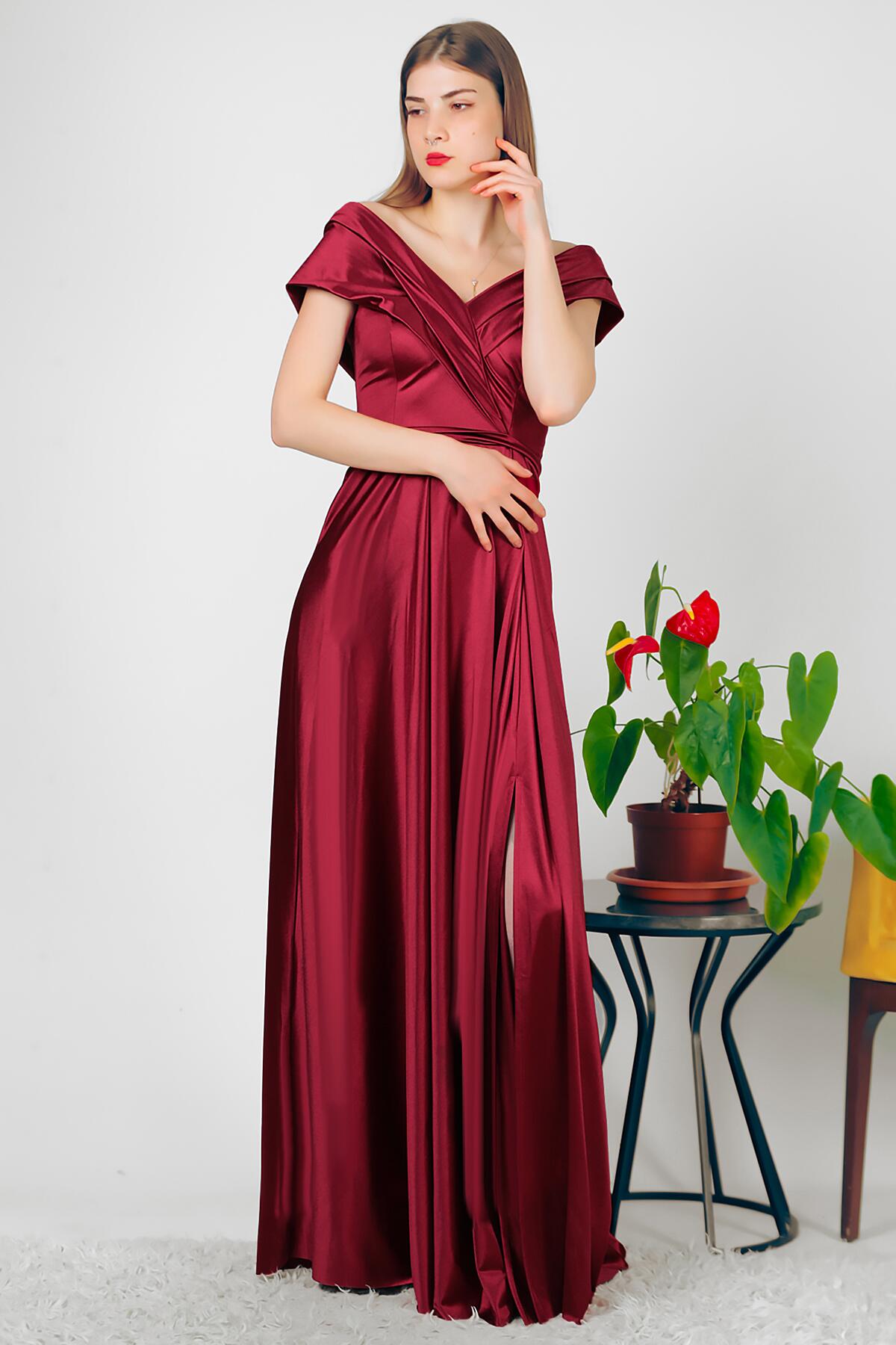 Kadın Saten Kayık Yaka Uzun Abiye Bordo