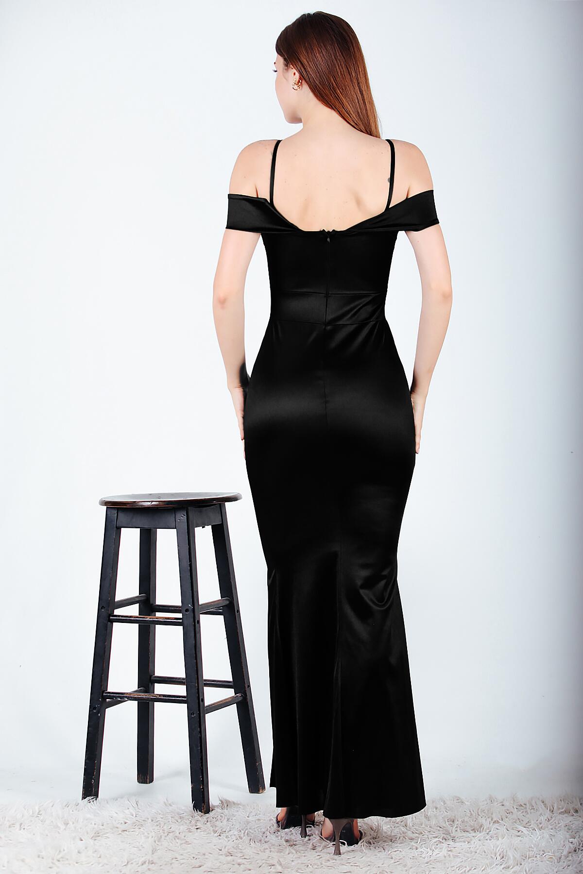 Kadın Saten Uzun Yırtmaçlı Abiye Elbise Siyah