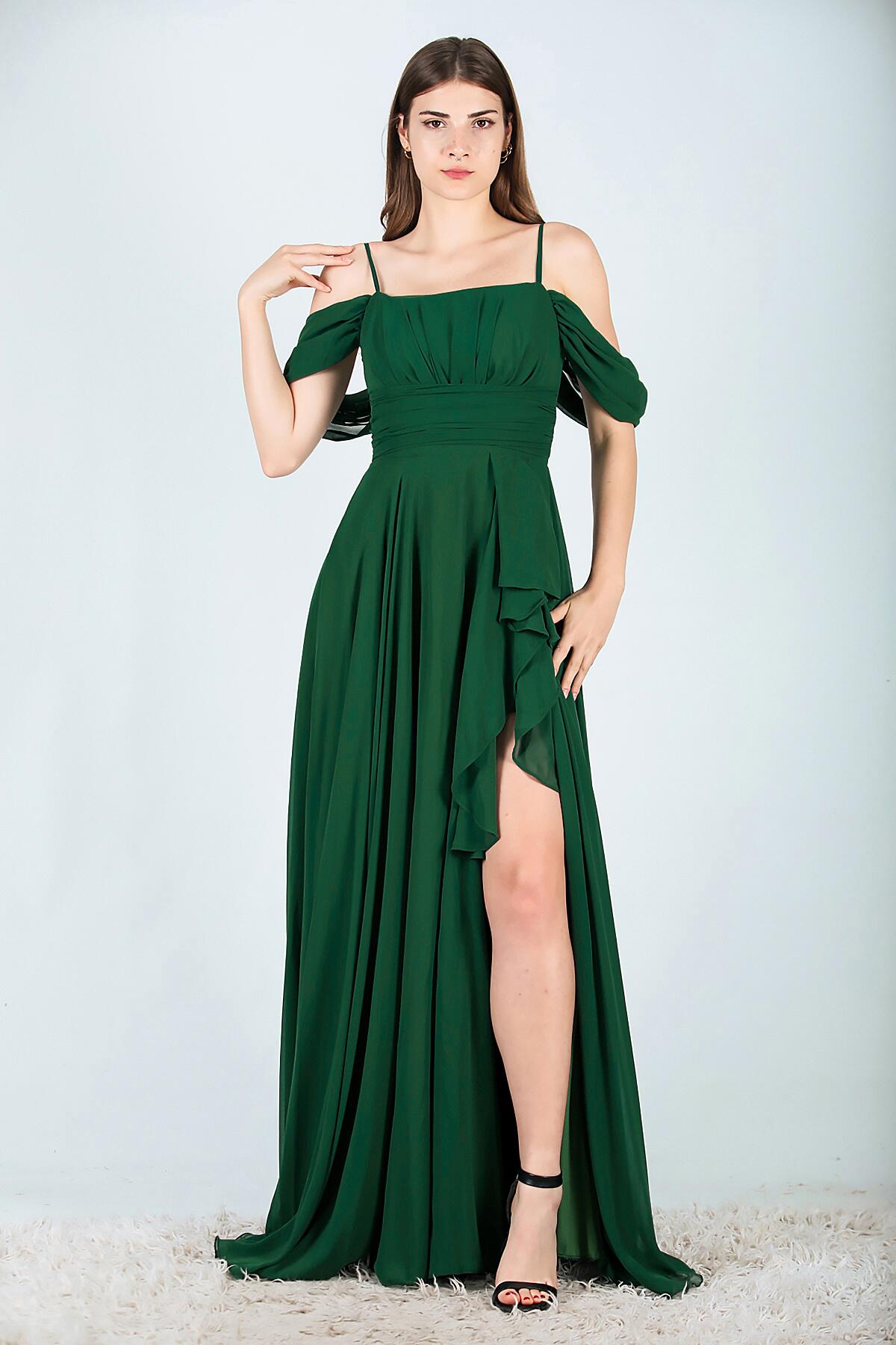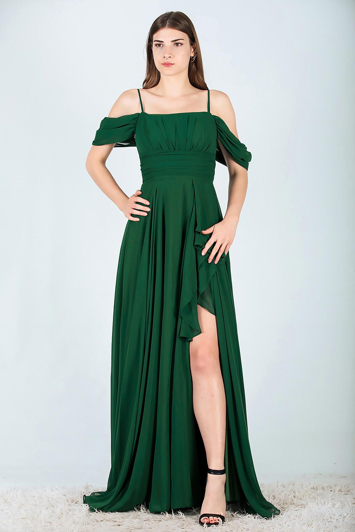 Kadın Şifon Uzun Abiye Elbise Zümrüt