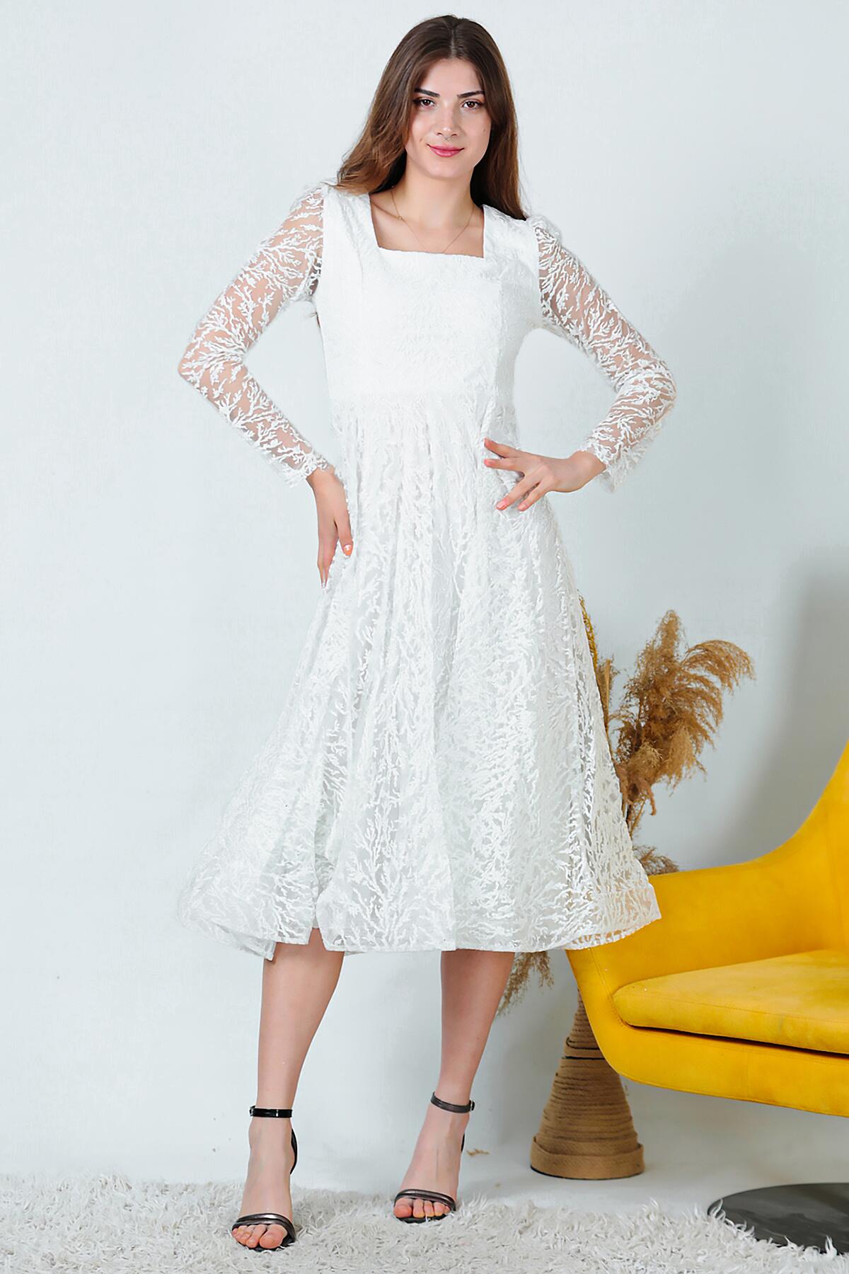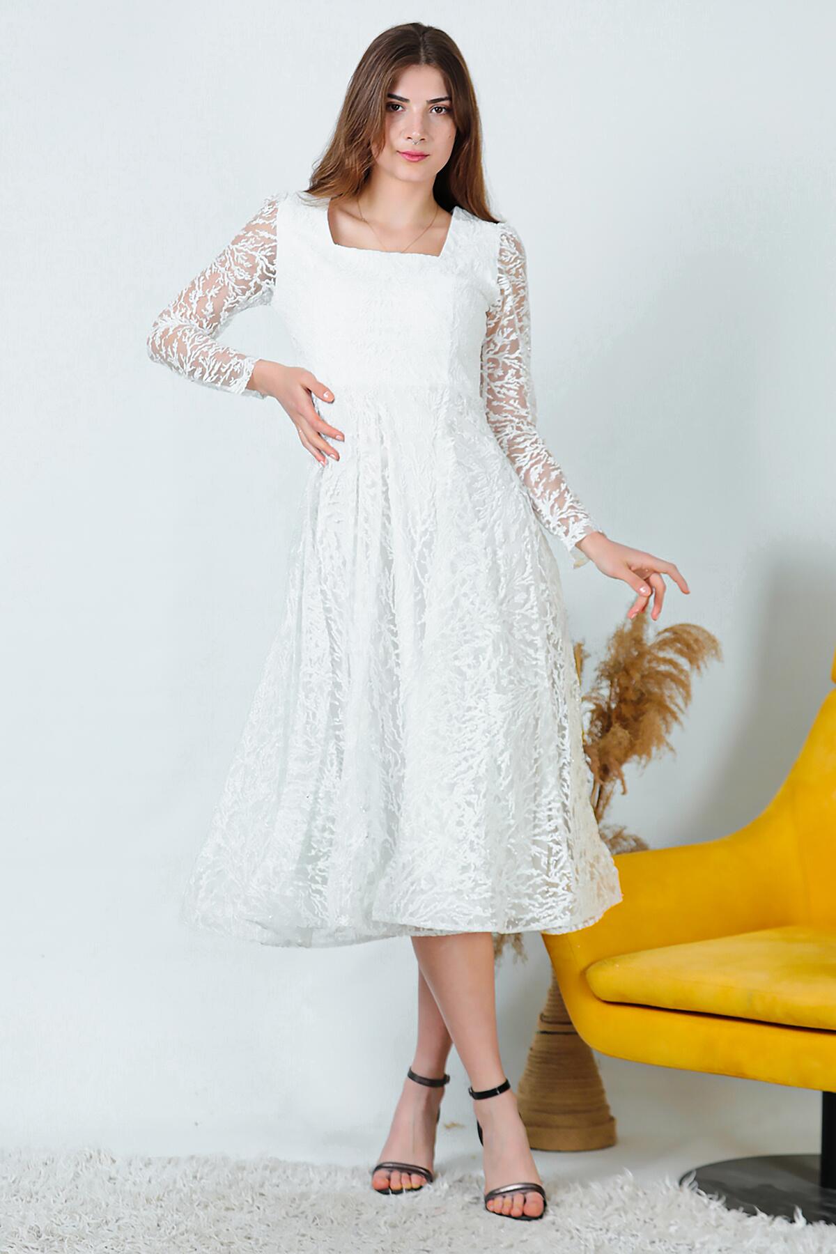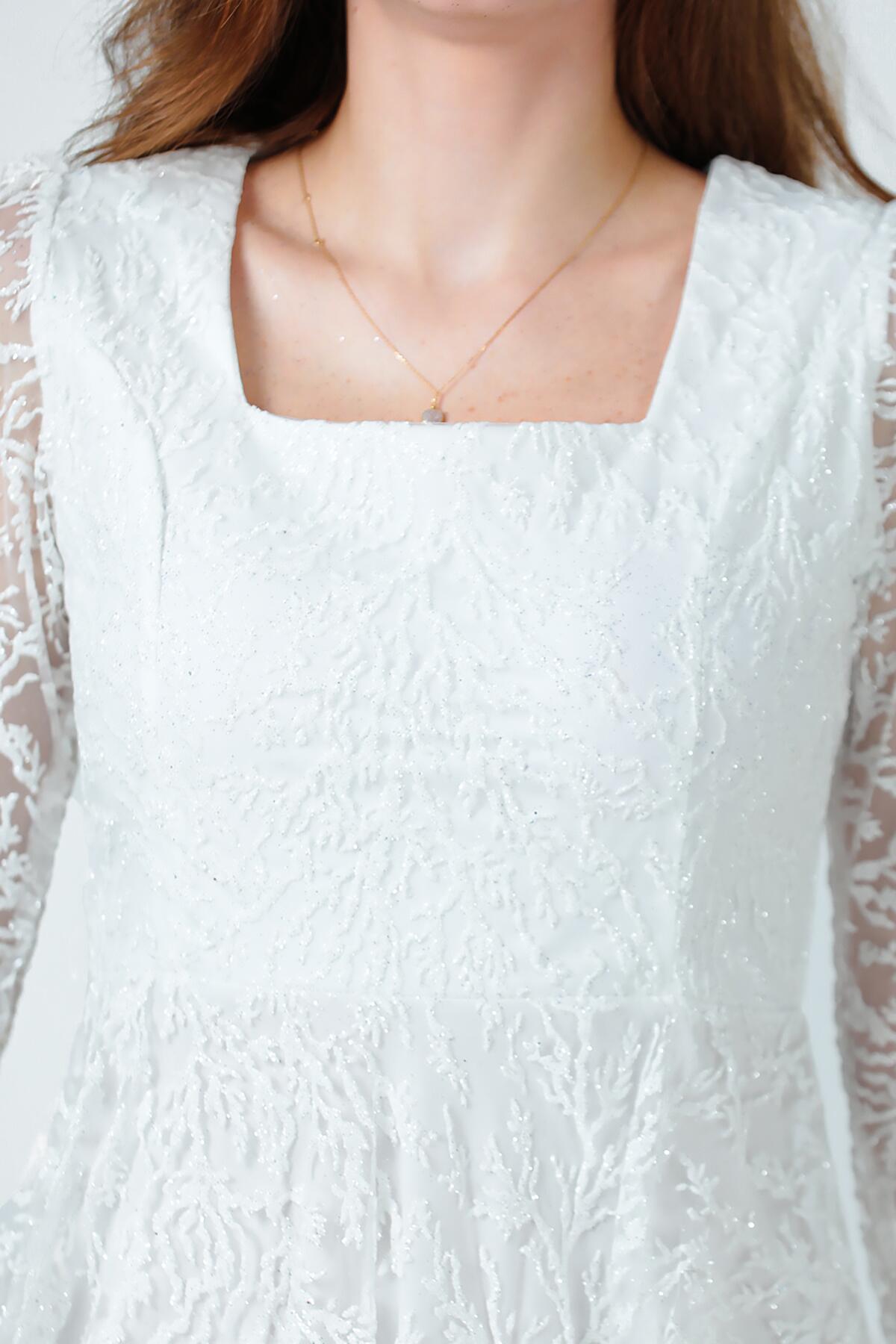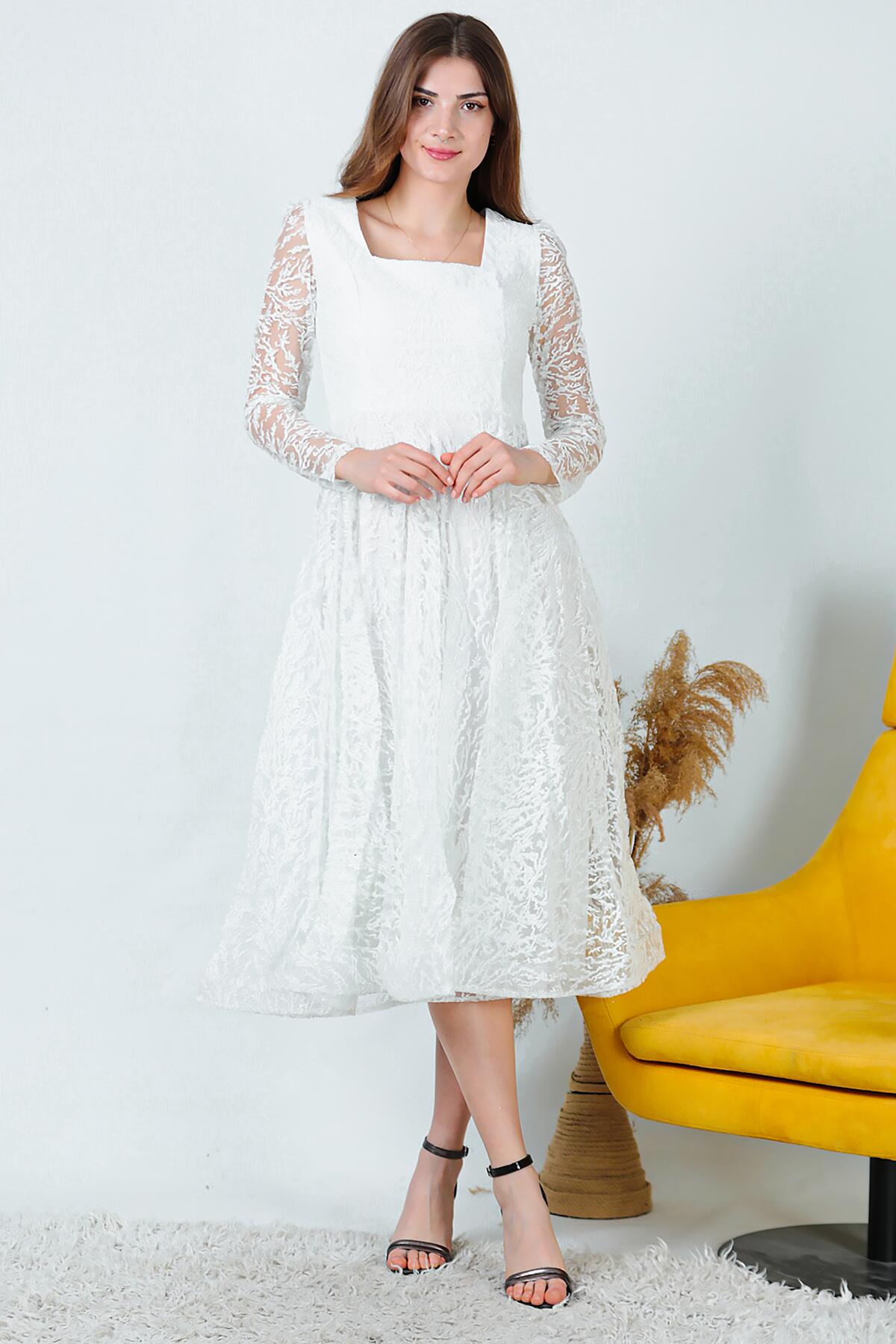 Kadın Simli Midi Boy Abiye Elbise Ekru