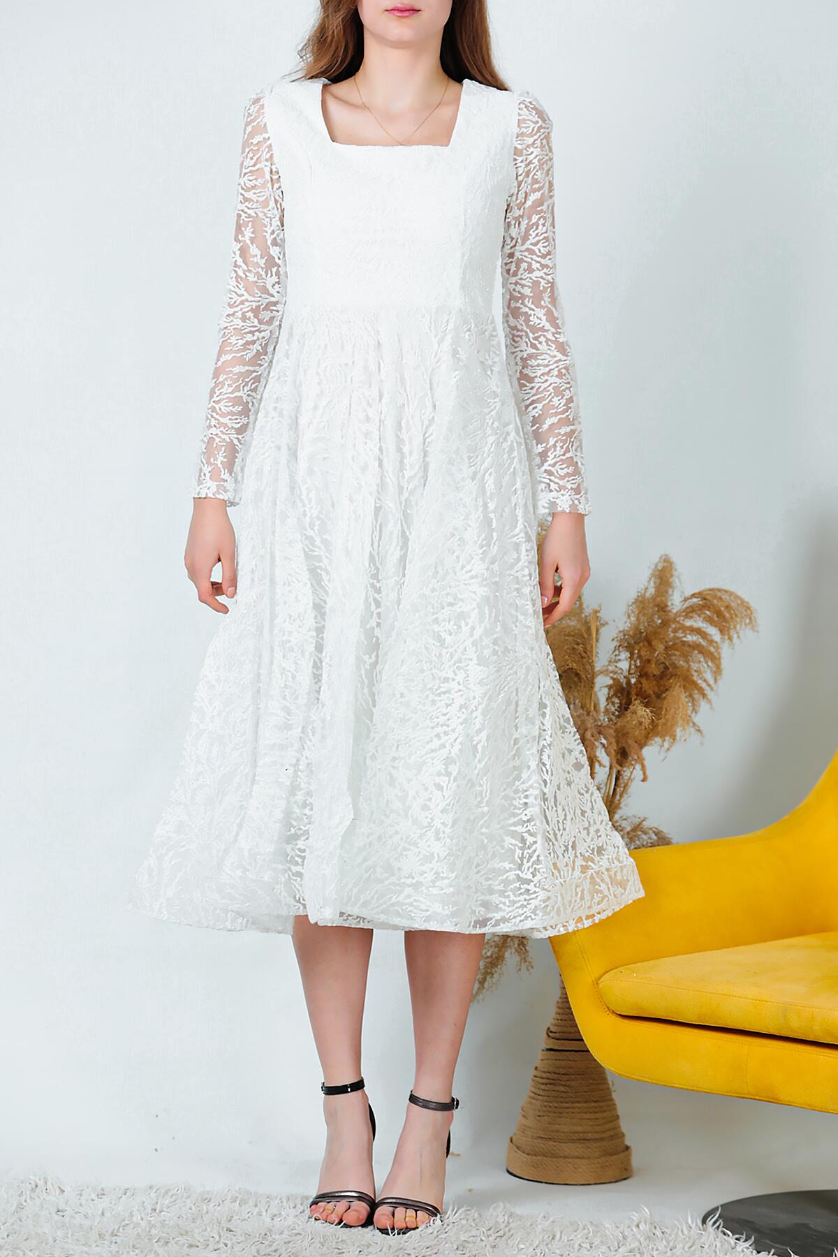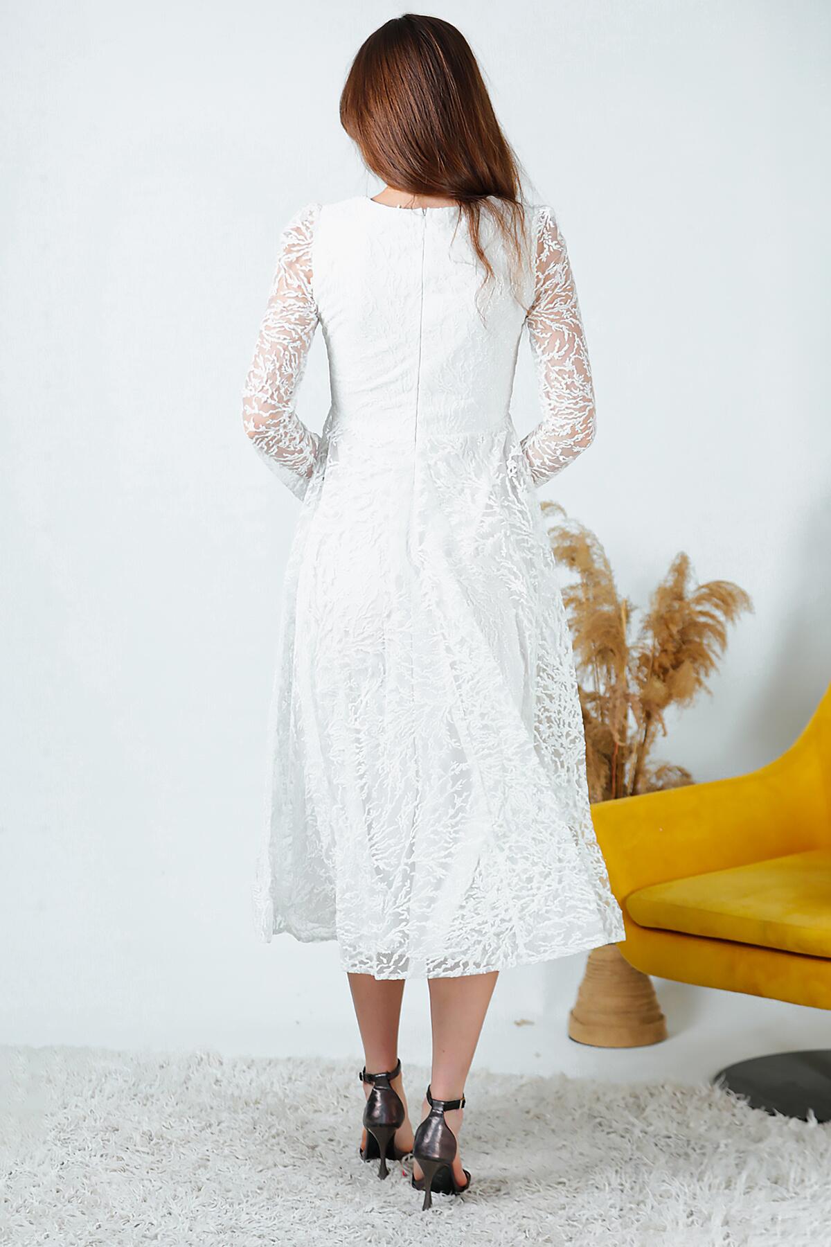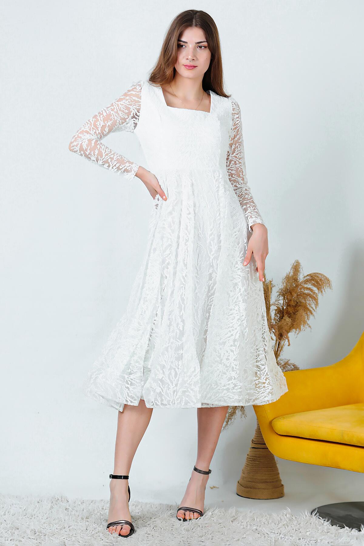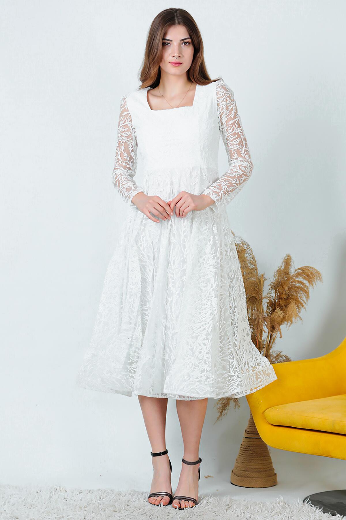 Kadın Simli Midi Boy Abiye Elbise Ekru