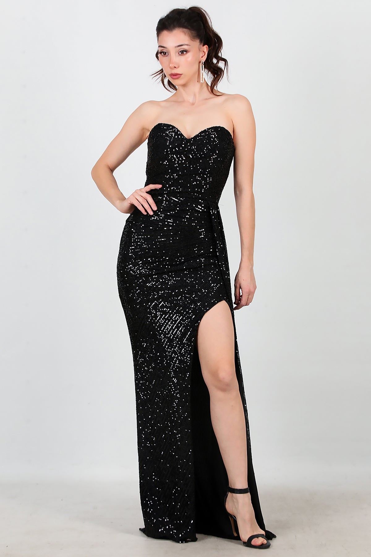 Kadın Staplez Uzun Pullu Abiye Siyah