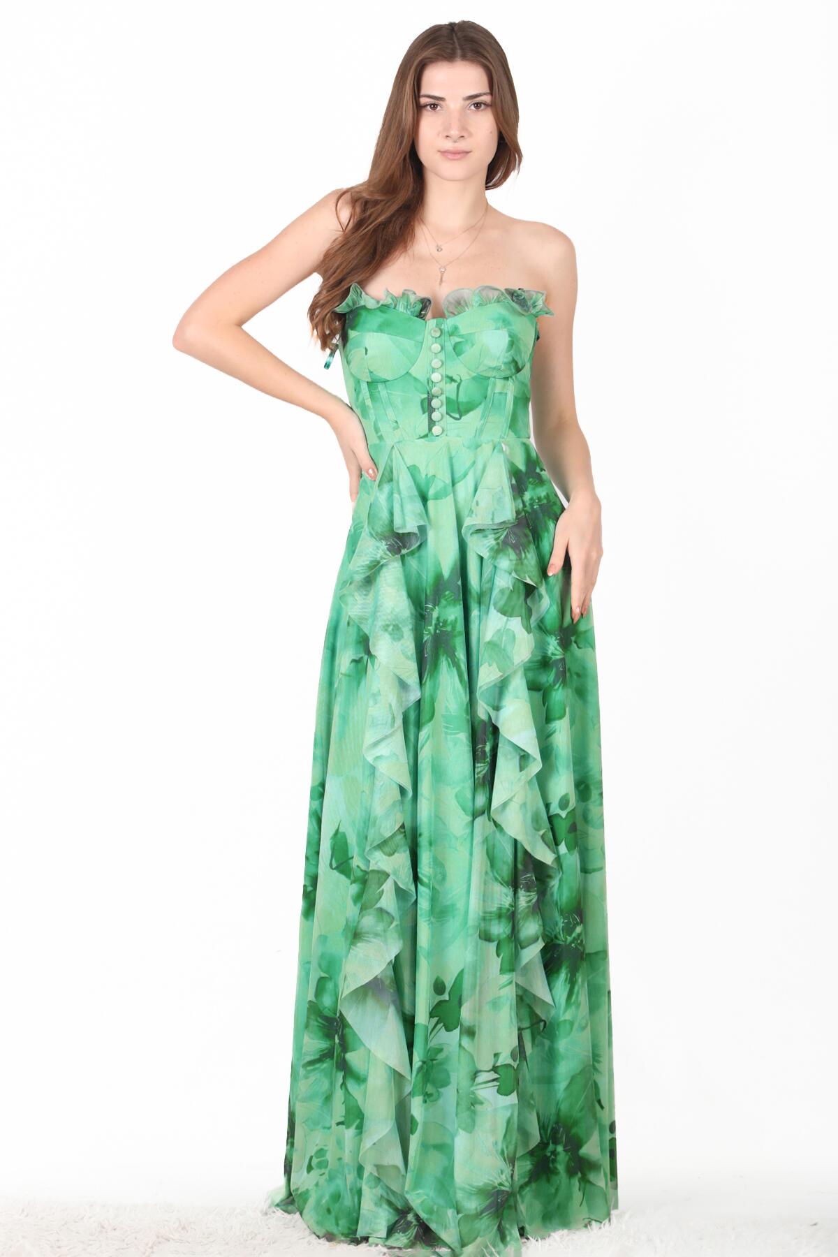 Kadın Straplez Tül Uzun Abiye Elbise Yeşil