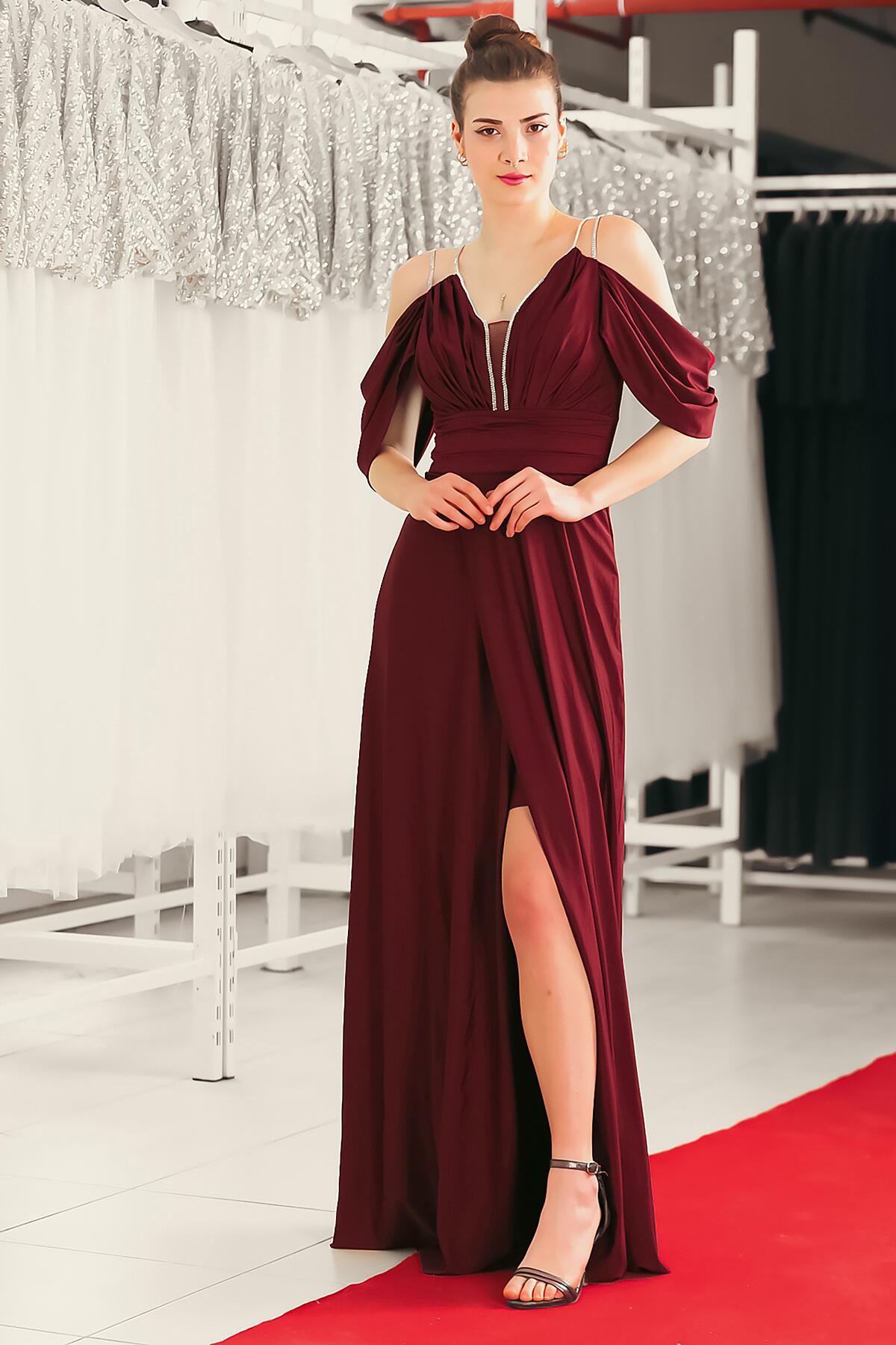 Kadın Taş Detaylı Uzun Abiye Bordo