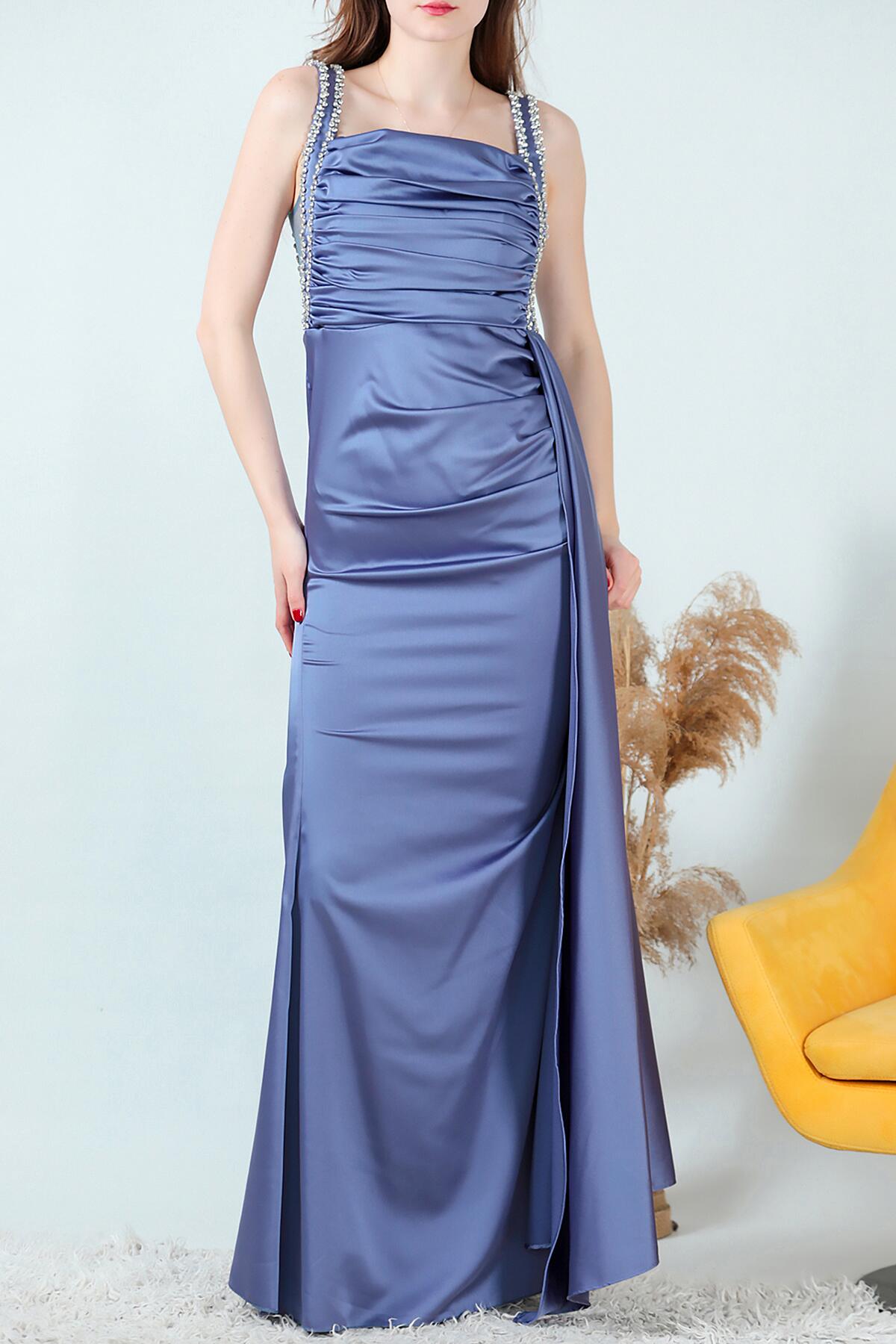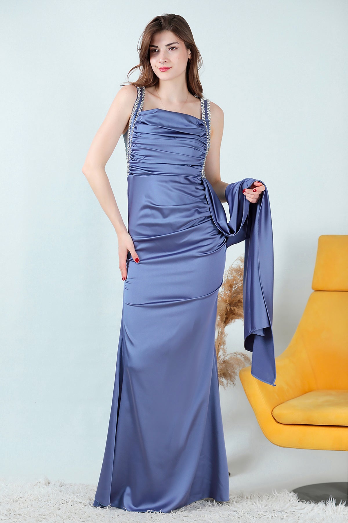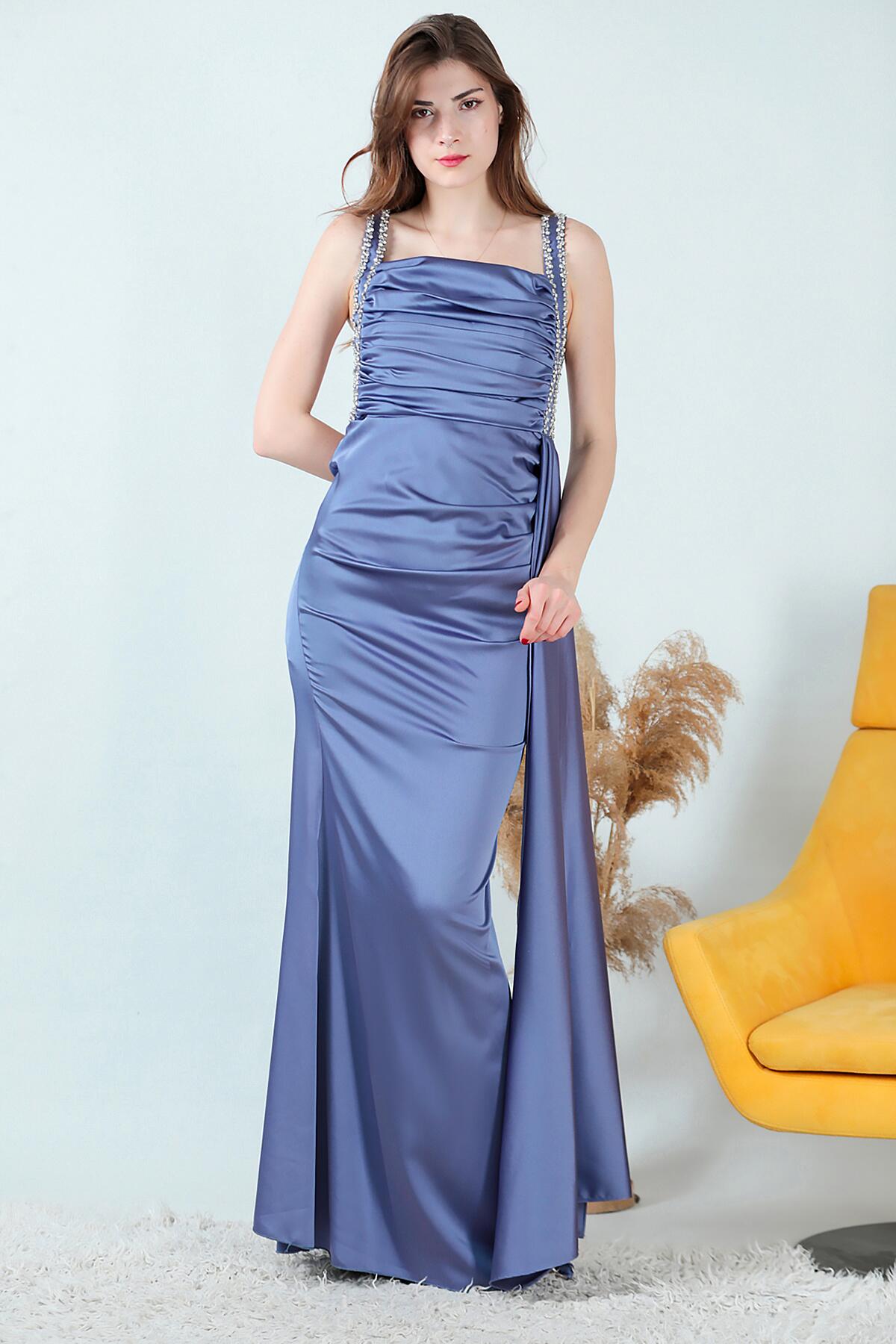 Kadın Taşlı Saten Uzun Abiye İndigo