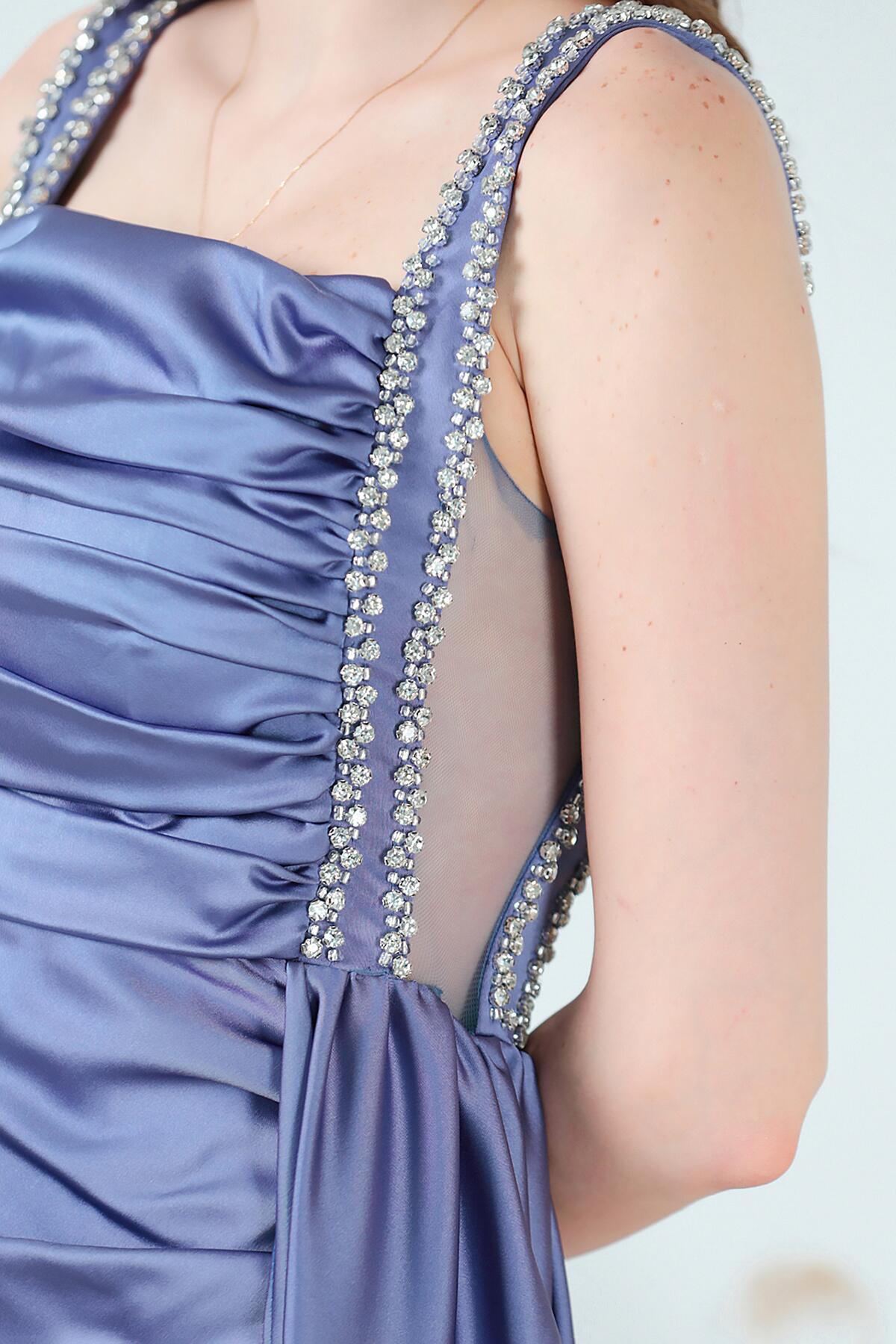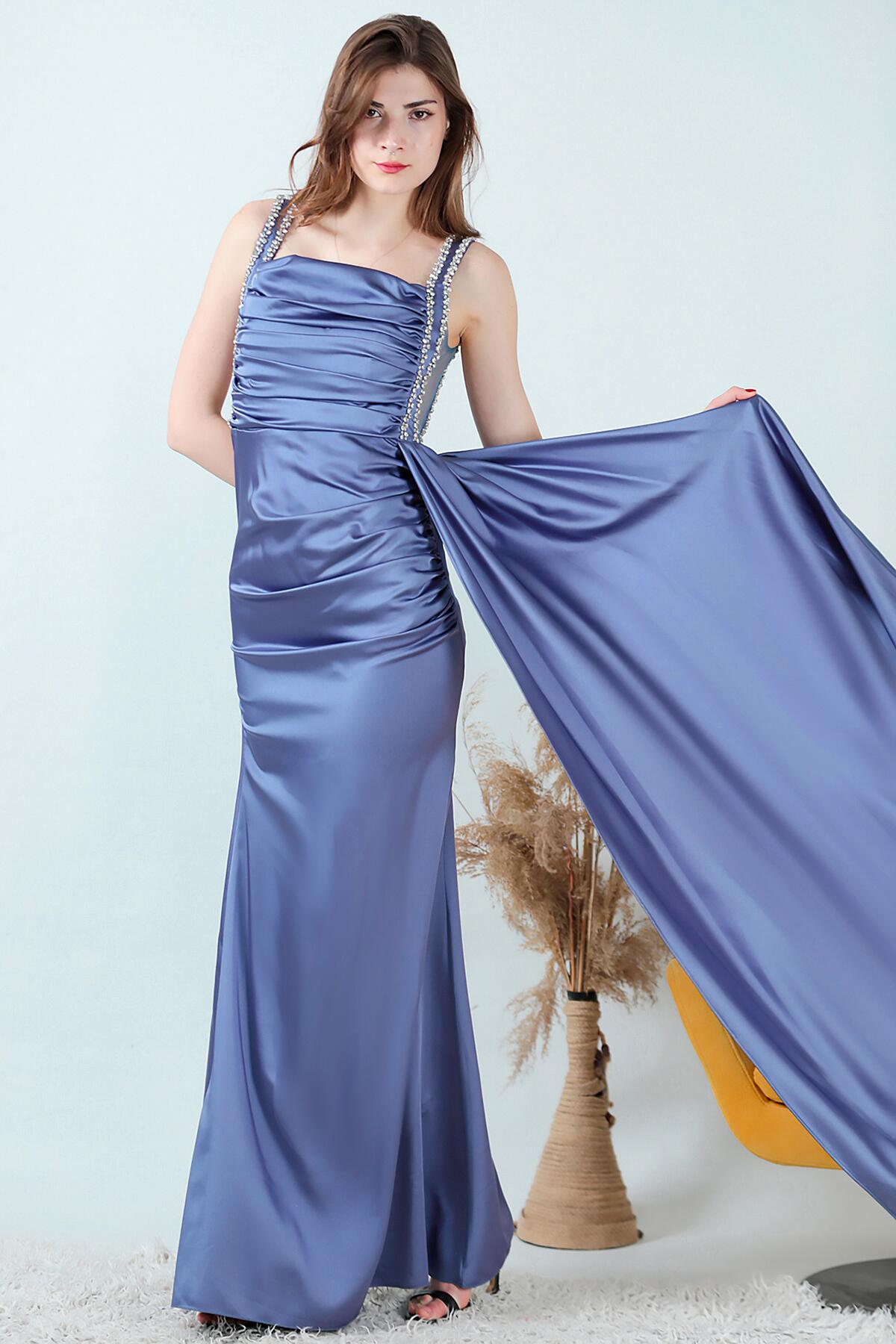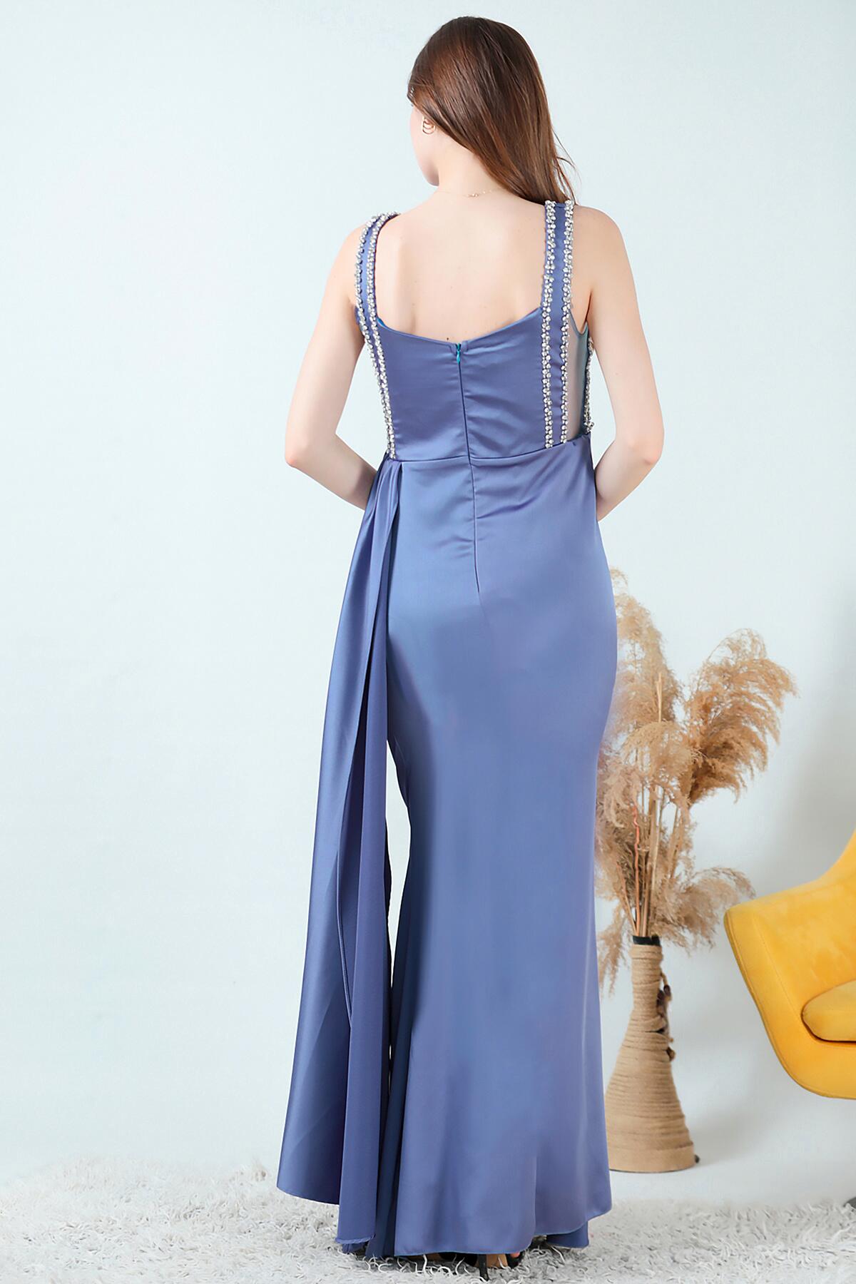 Kadın Taşlı Saten Uzun Abiye İndigo