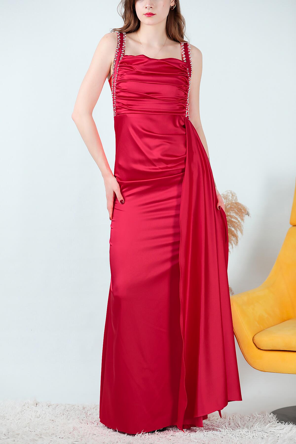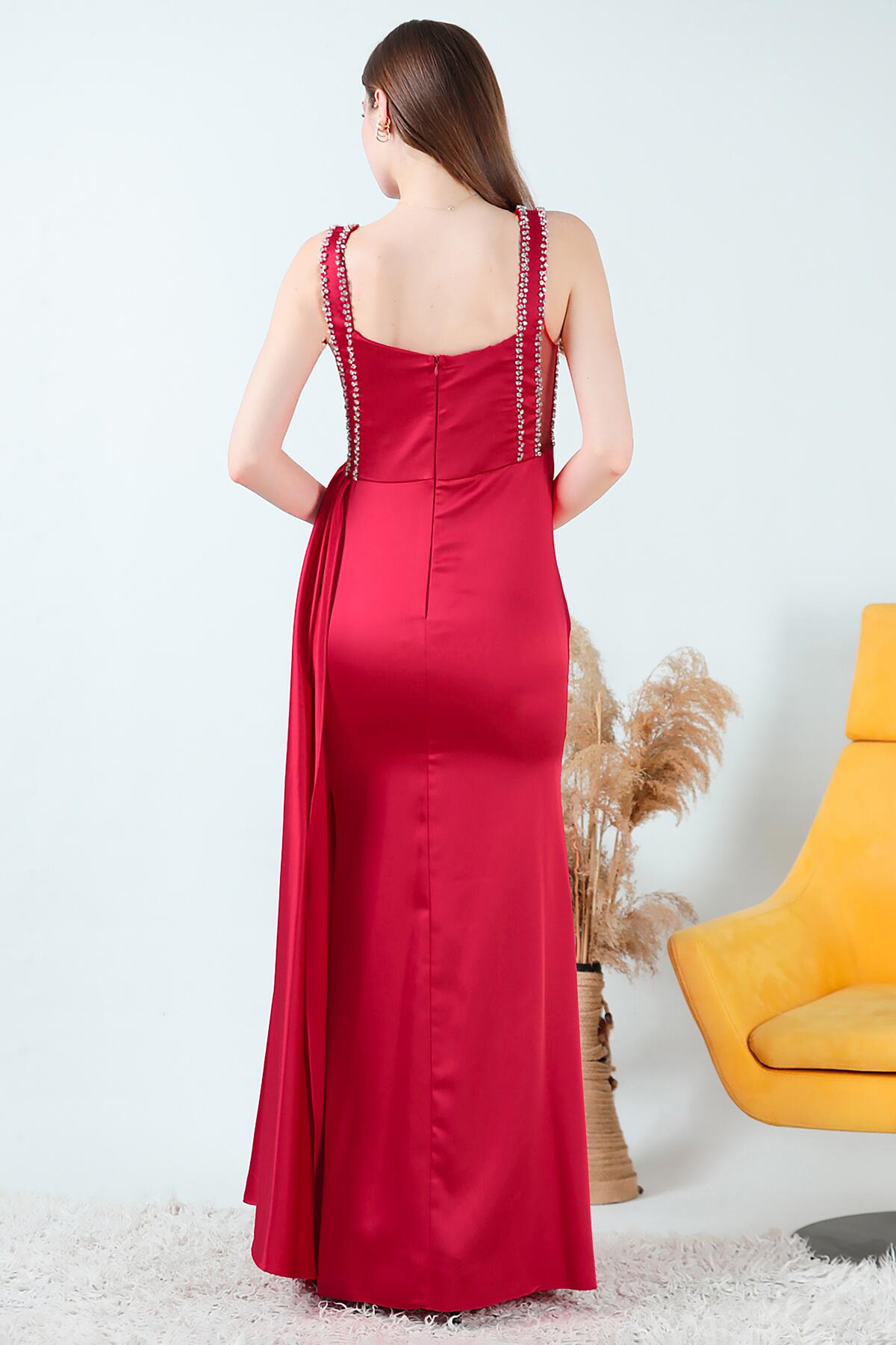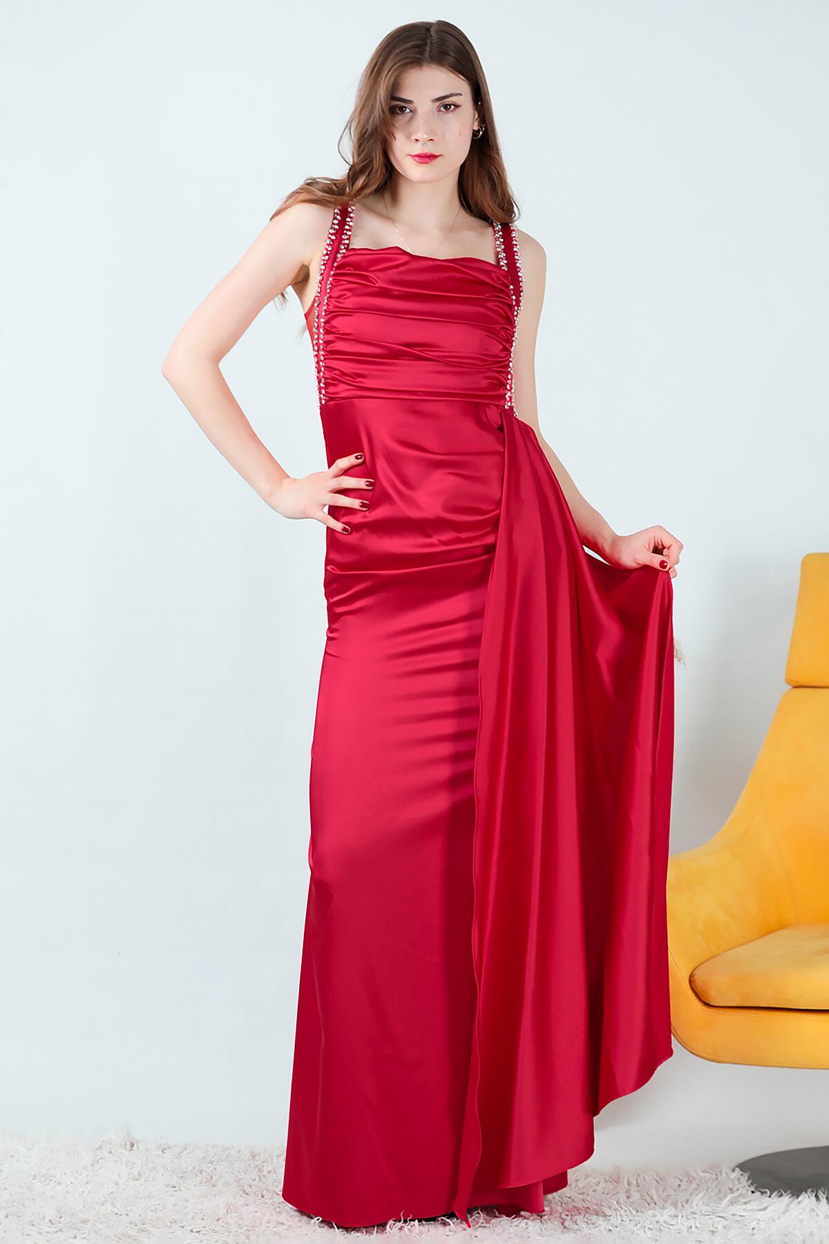 Kadın Taşlı Saten Uzun Abiye Kırmızı