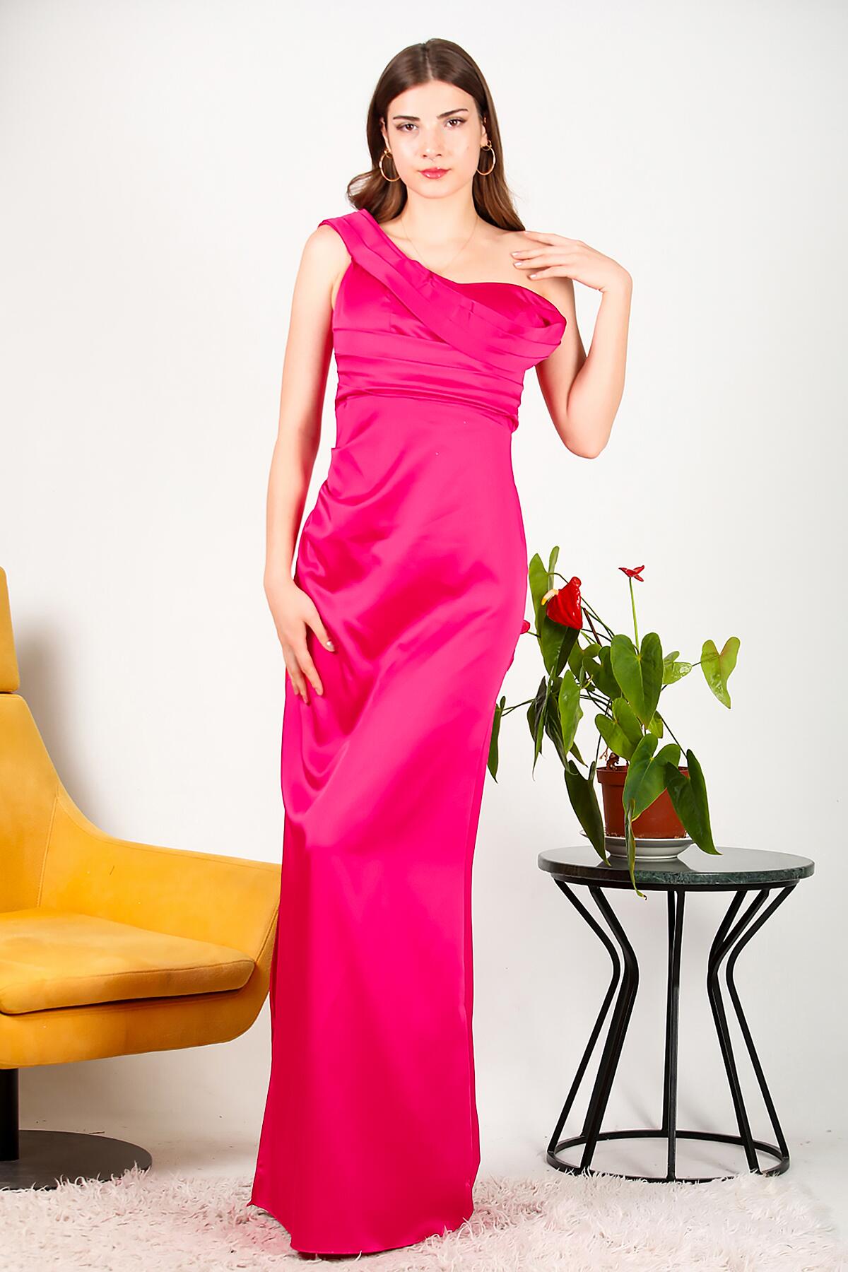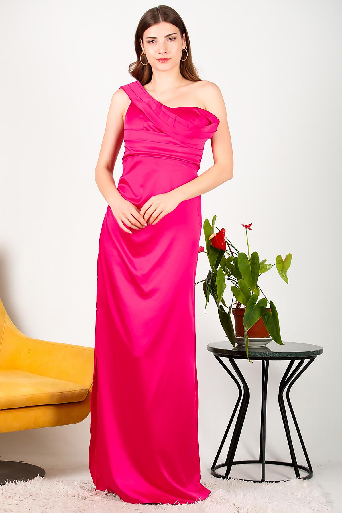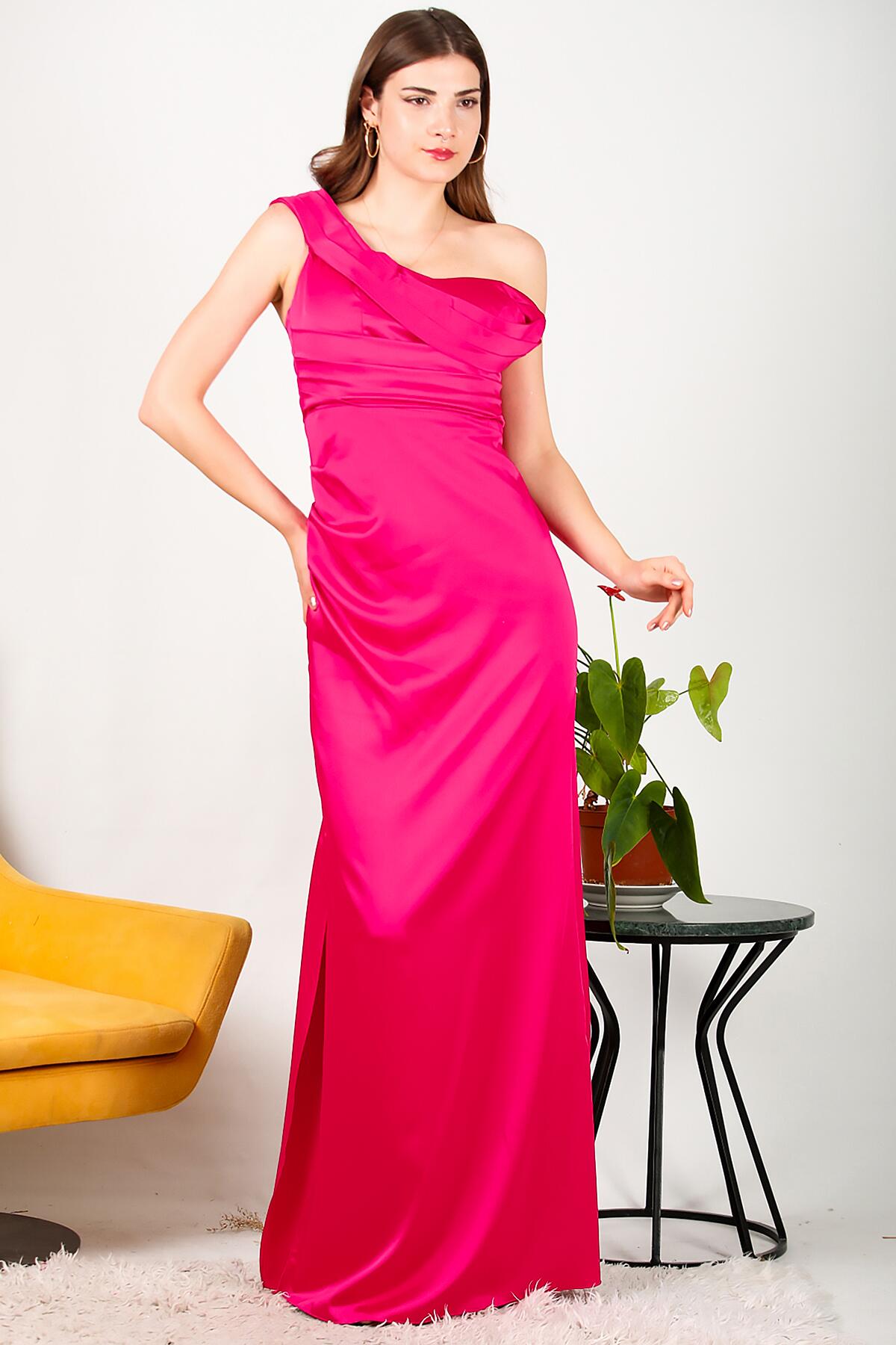 Kadın Tek Omuz Saten Abiye Fuşya