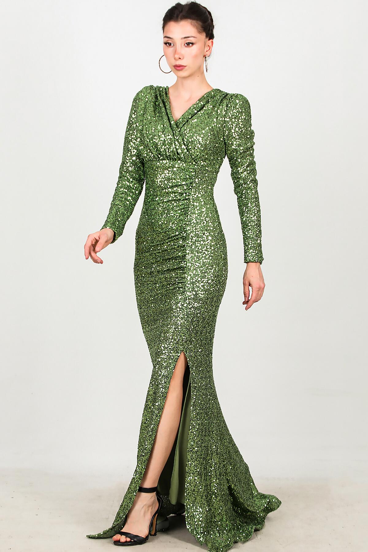 Kadın Uzun Kol Yırtmaçlı Uzun Abiye Yeşil