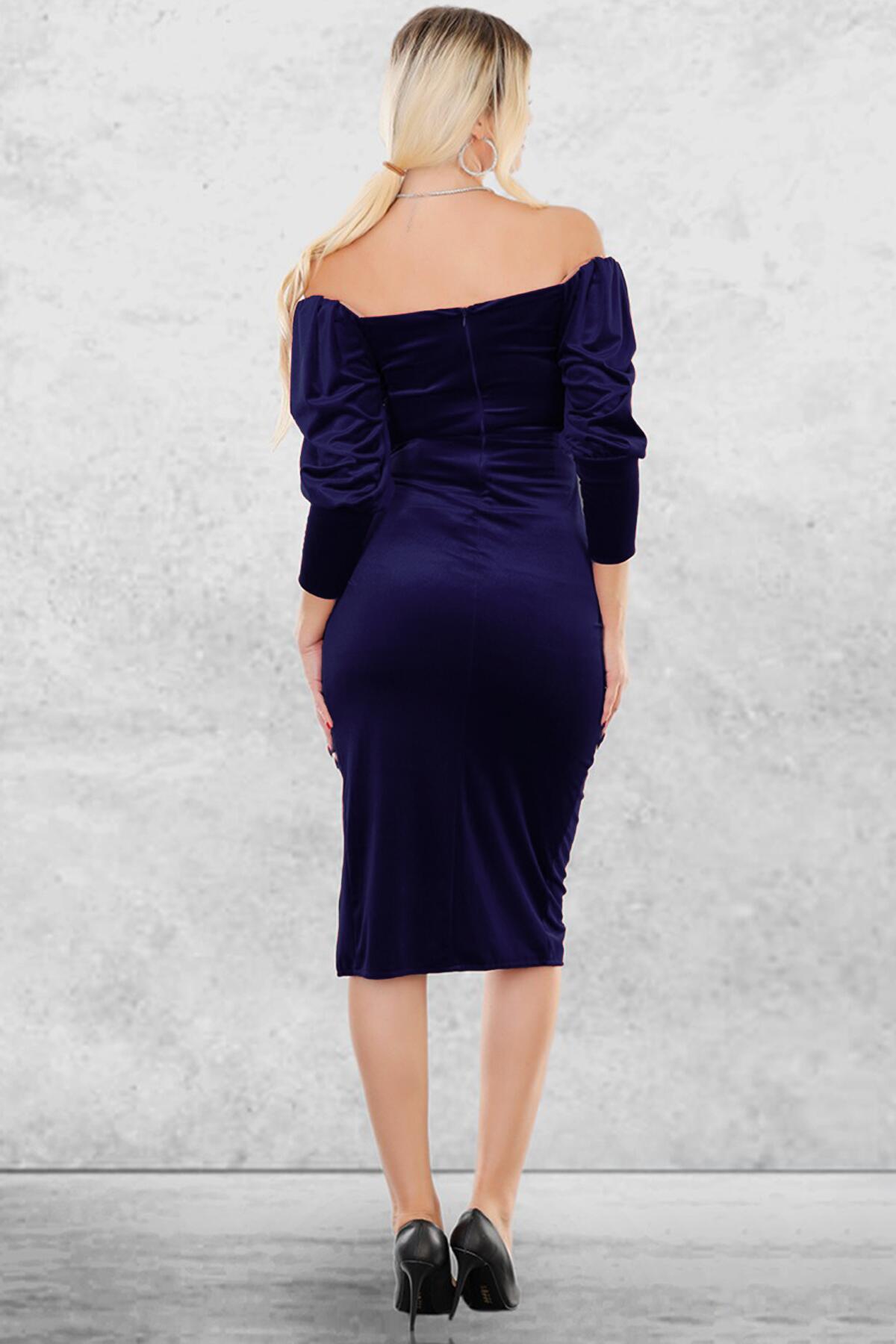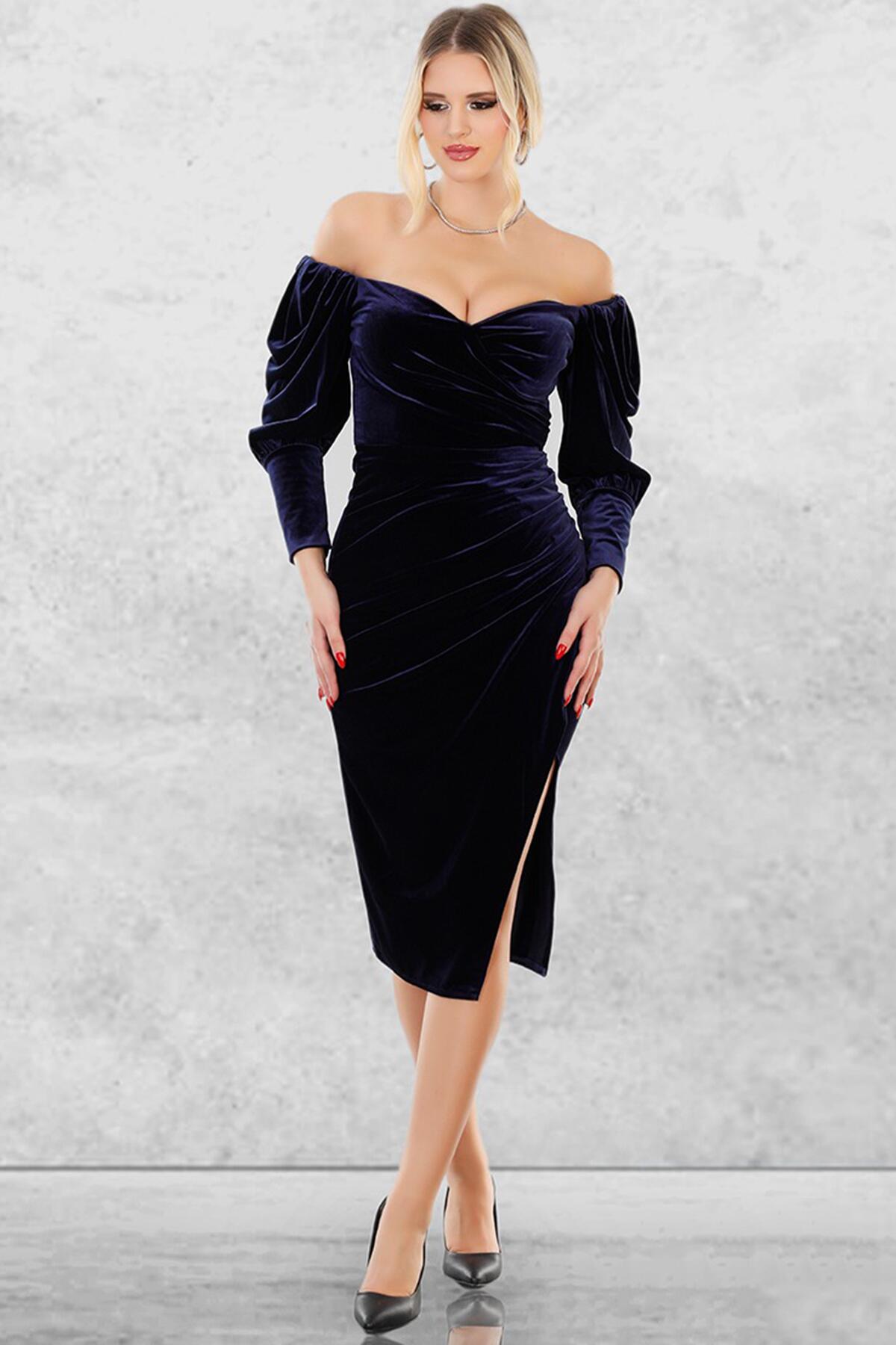 Kadın Uzun Manşetli Kol Pileli Kadife Elbise Lacivert