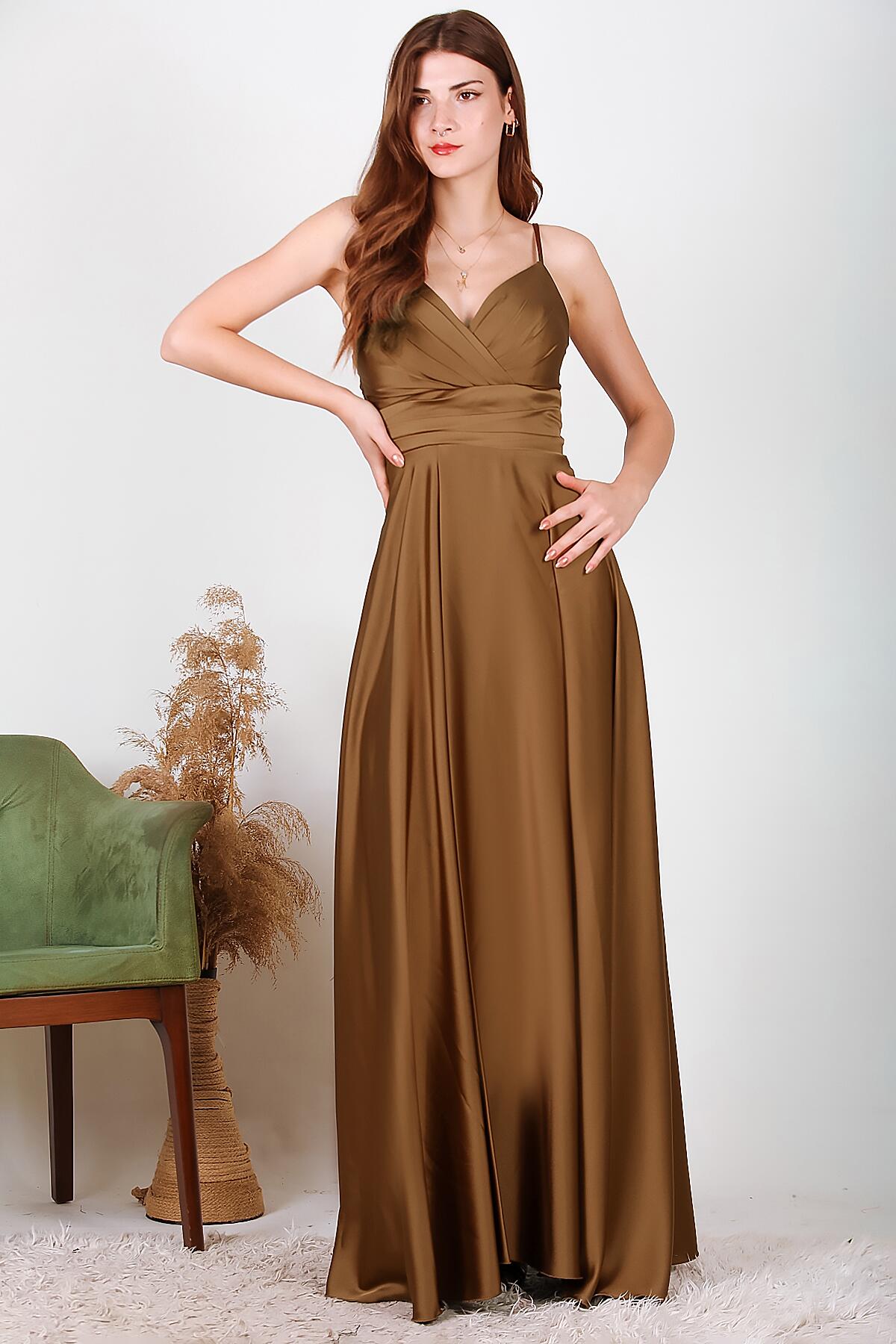 Kadın Uzun Saten Abiye Kahverengi