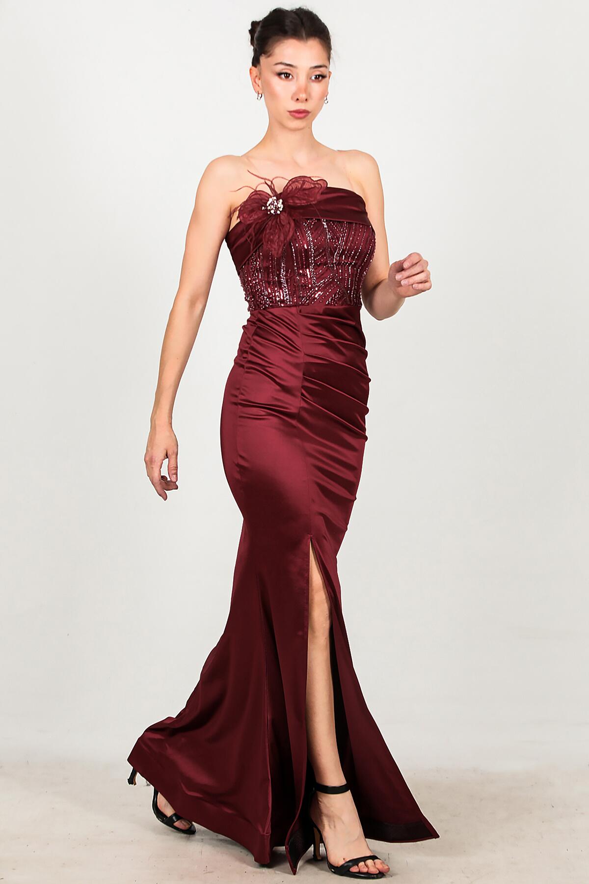 Kadın Yakası Broşlu Kolsuz Yırtmaçlı Uzun Abiye Bordo
