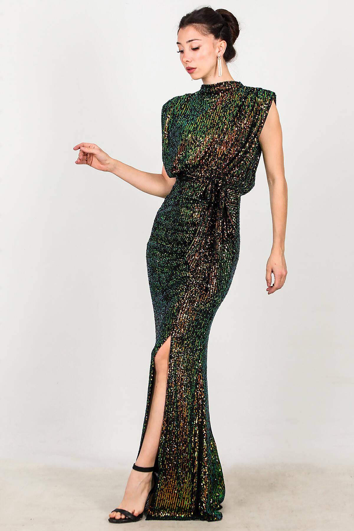 Kadın Yırtmaçlı Kuşaklı Uzun Abiye Yeşil