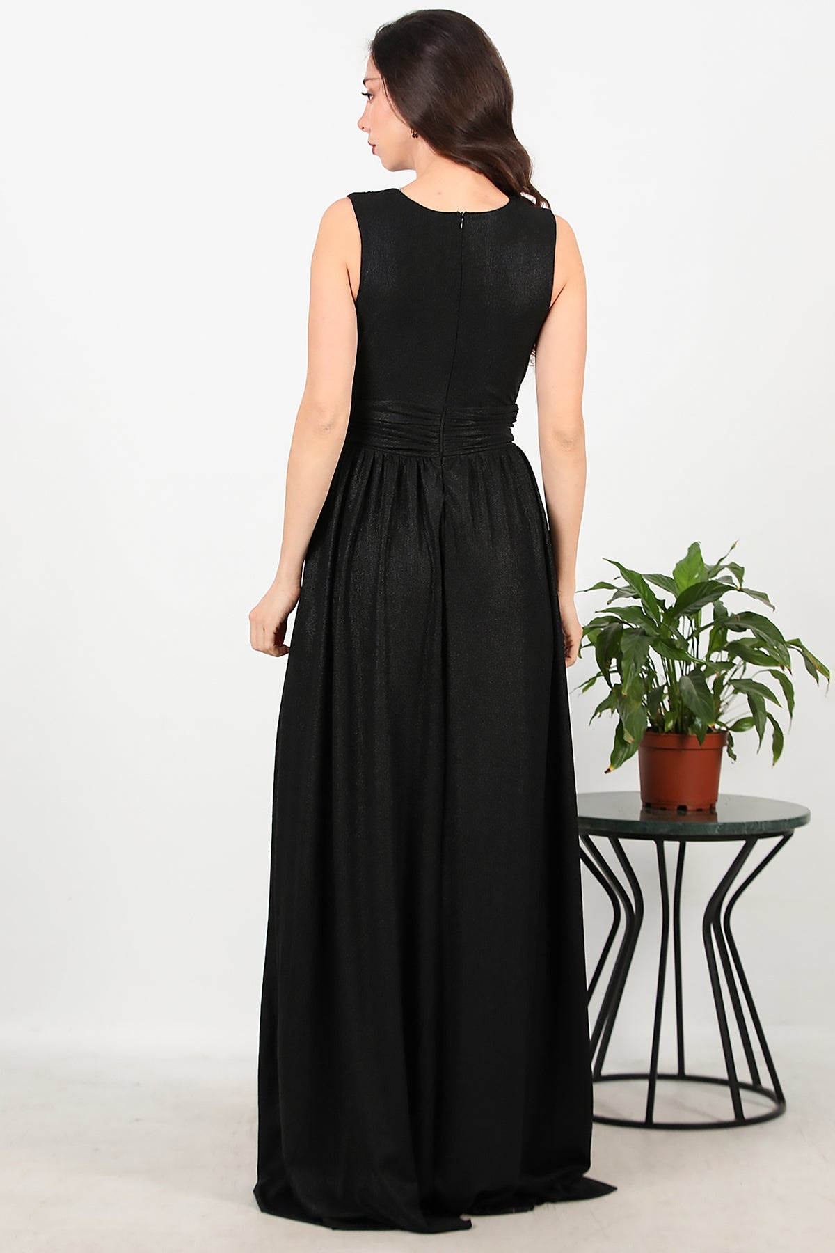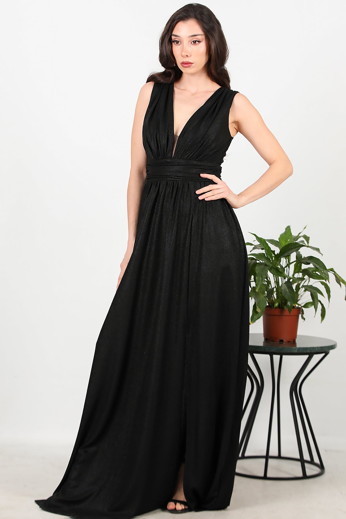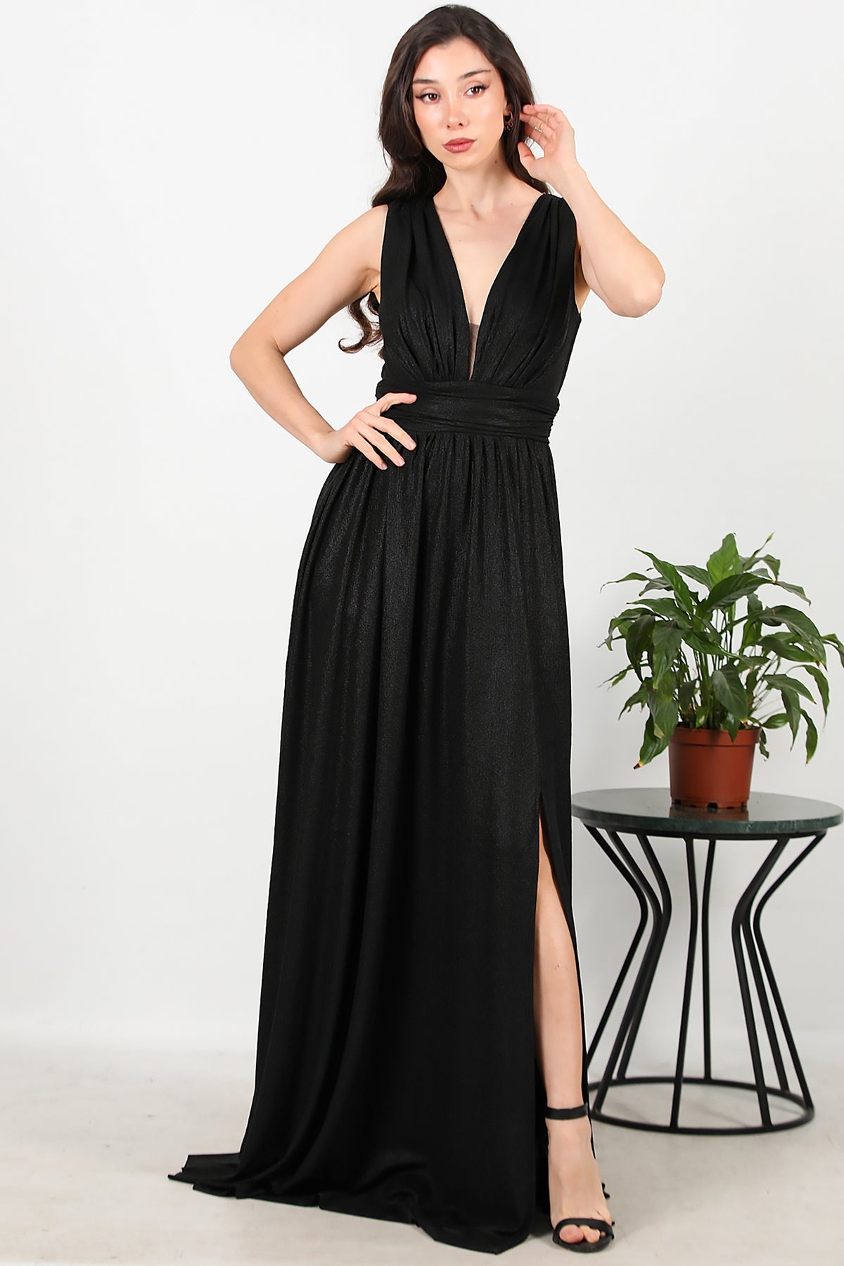 Kadın Yırtmaçlı Simli Uzun Abiye Siyah
