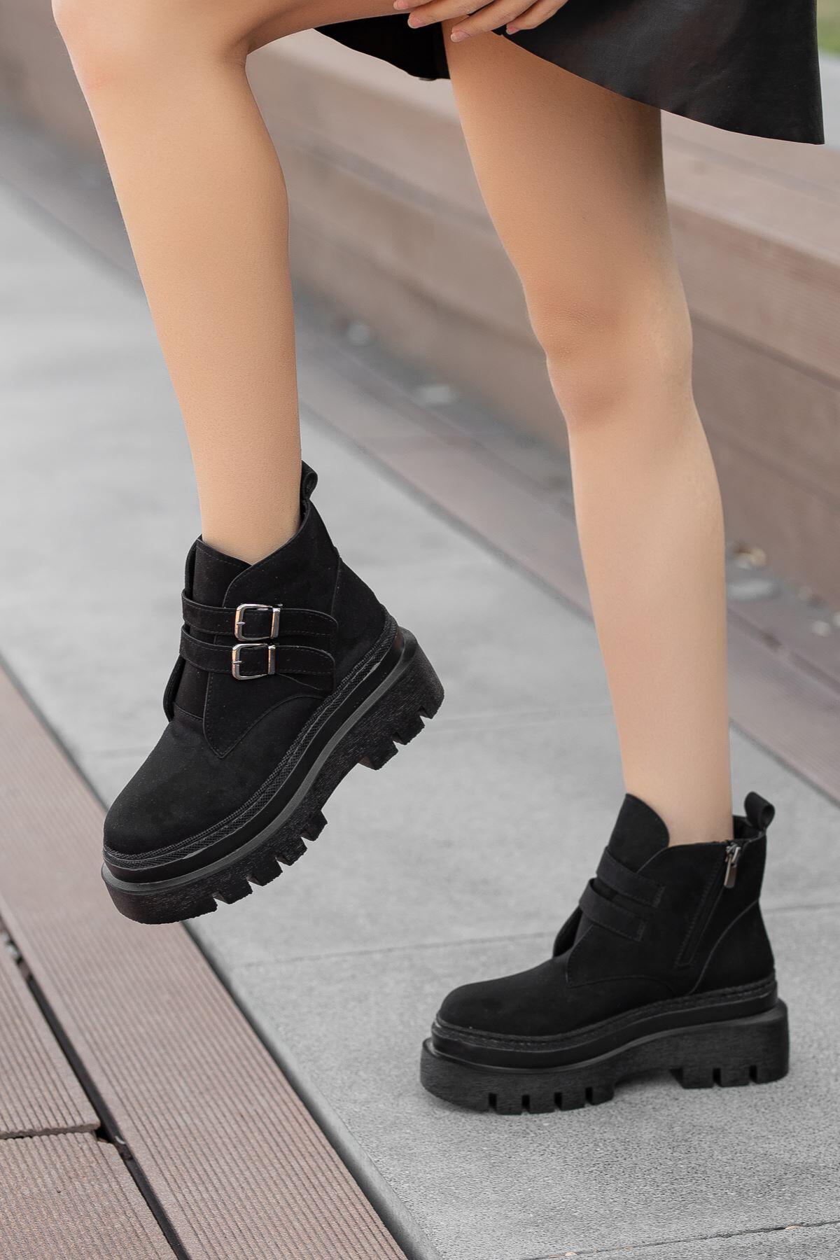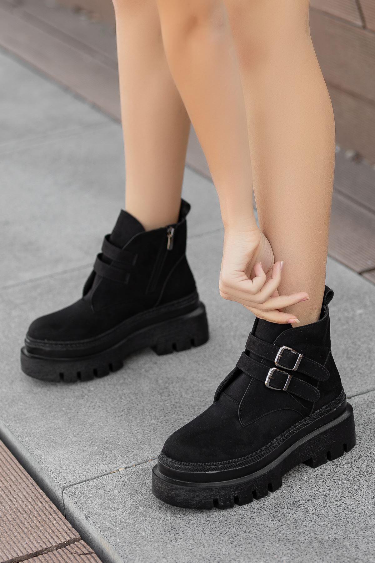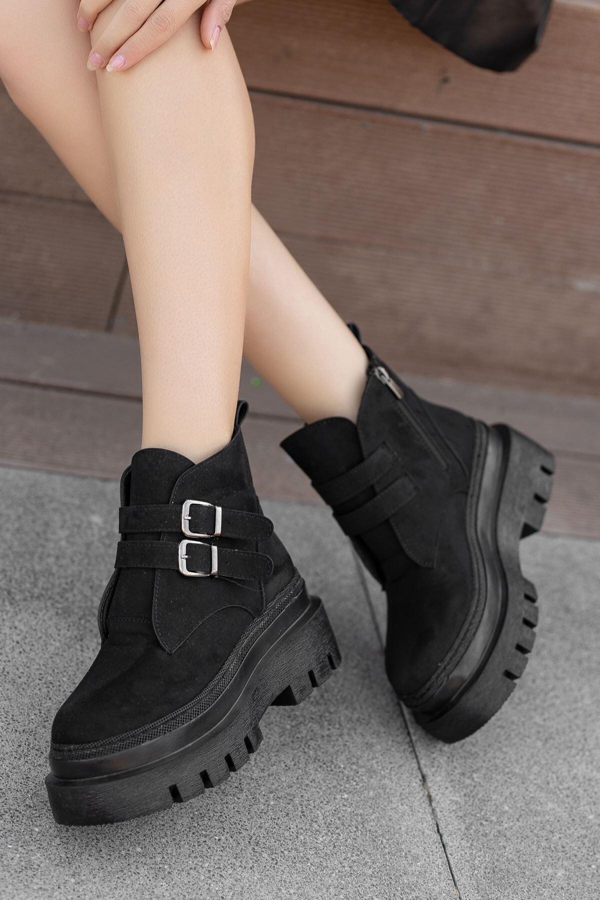 Hettie Siyah Süet Yüksek Topuk Detaylı Bağcıklı Kadın Bot Siyah
