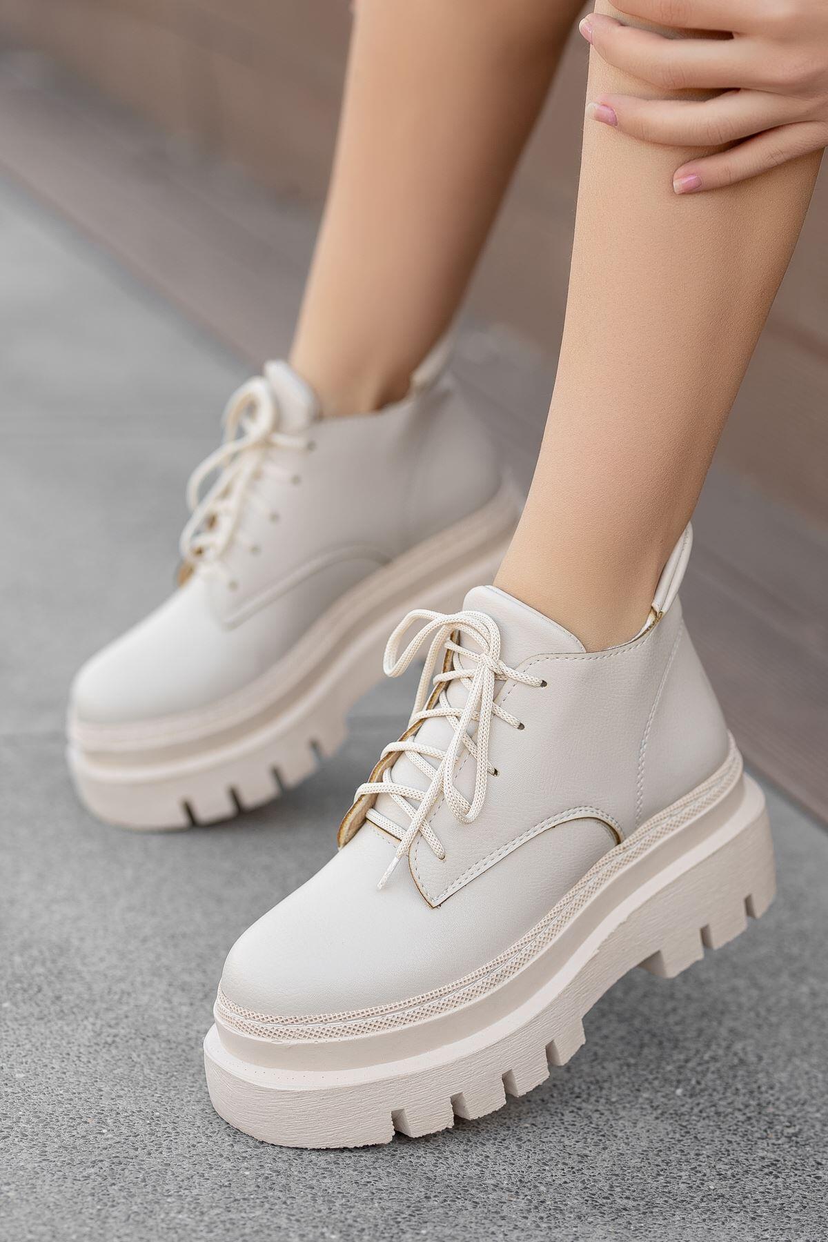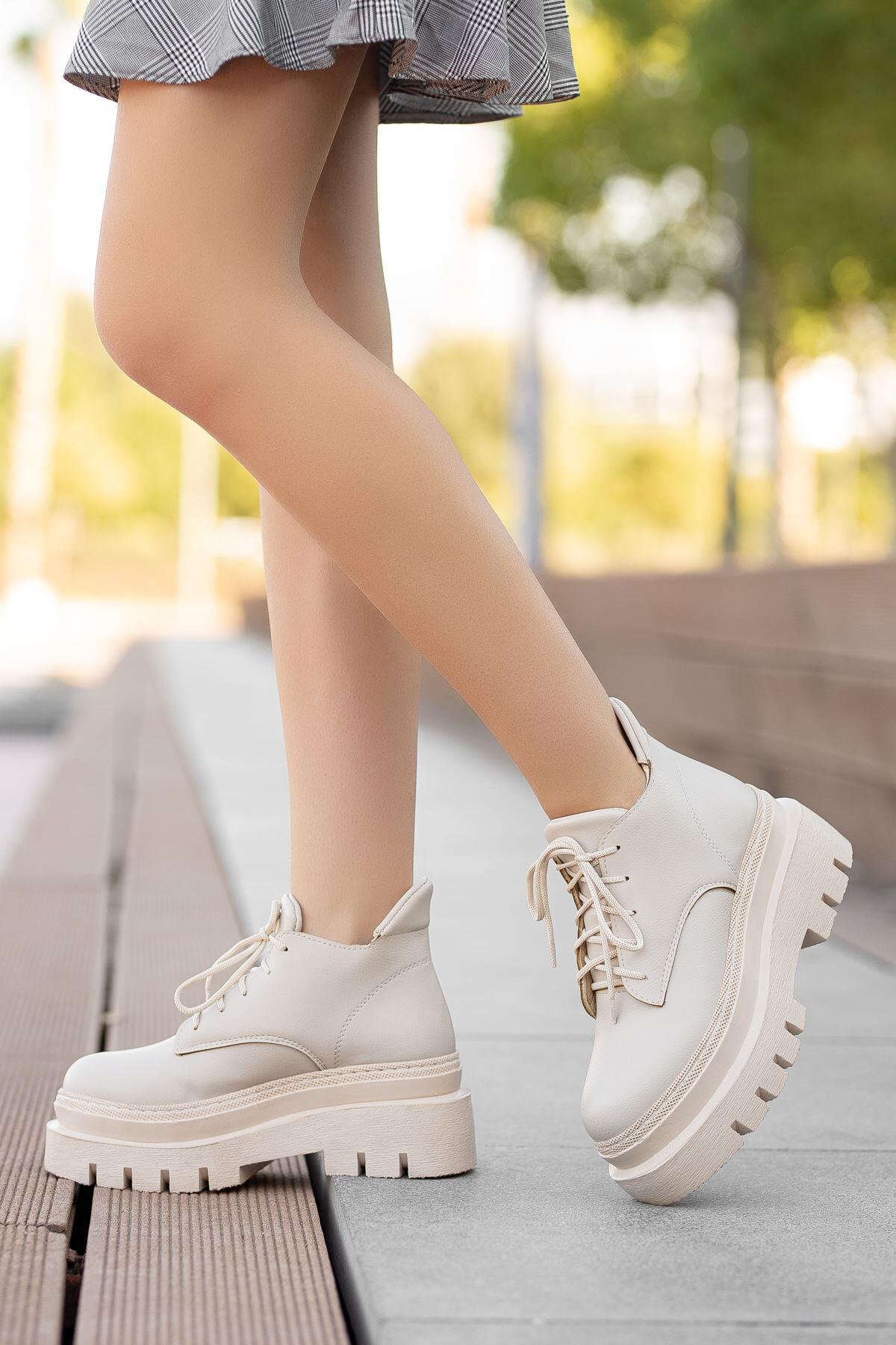 Jayle Krem Cilt Yüksek Topuk Detaylı Bağcıklı Kadın Bot Krem