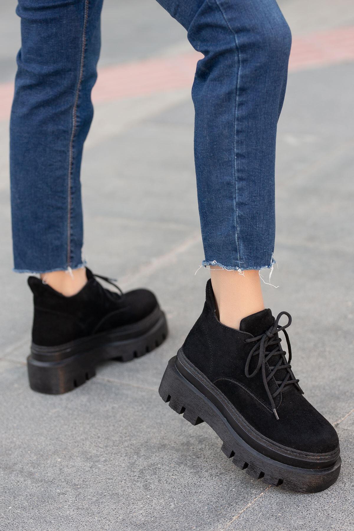 Jayle Siyah Süet Yüksek Topuk Detaylı Bağcıklı Kadın Bot Siyah