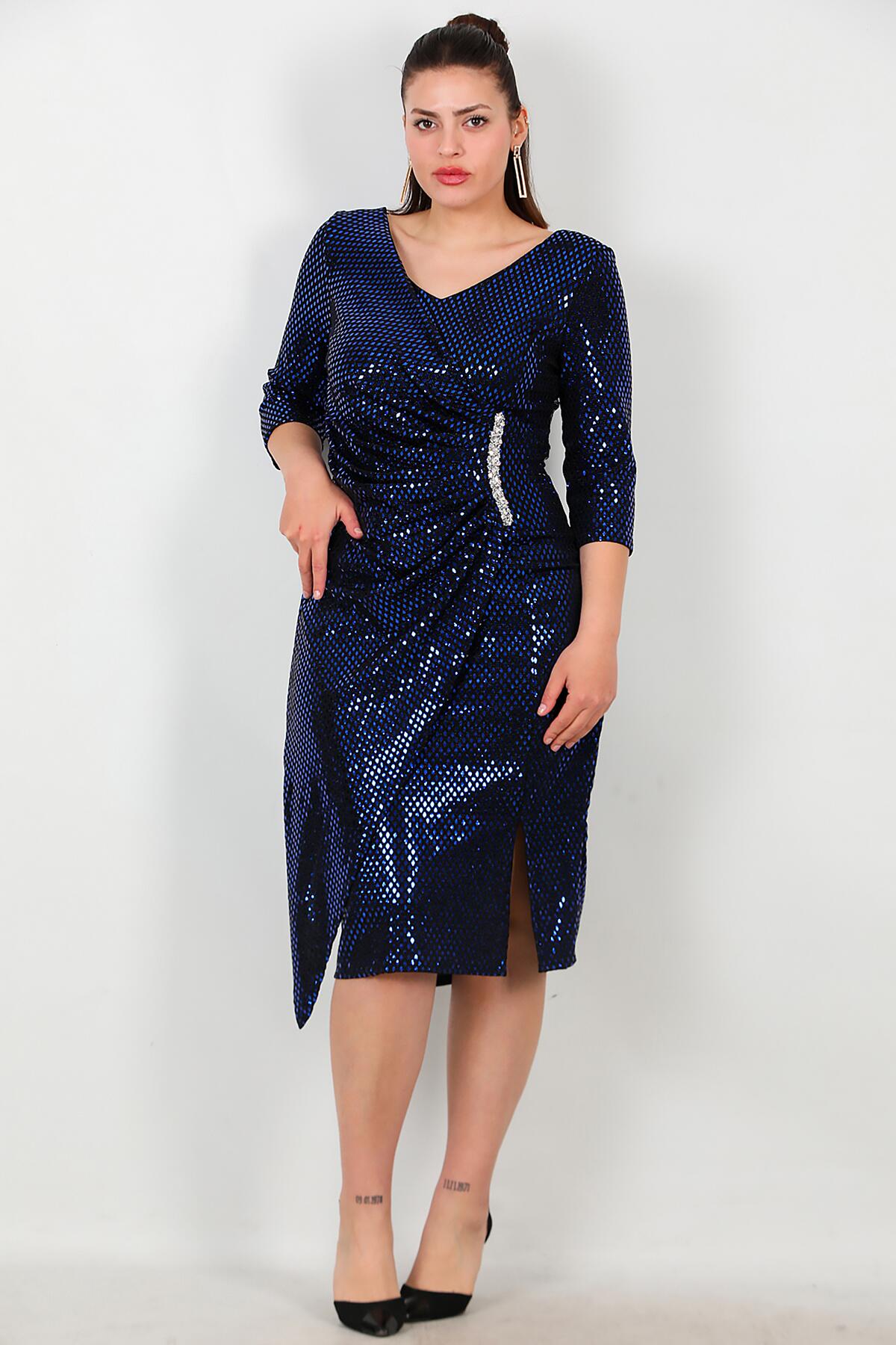 Büyük Beden Kruvaze Yaka Simli Abiye