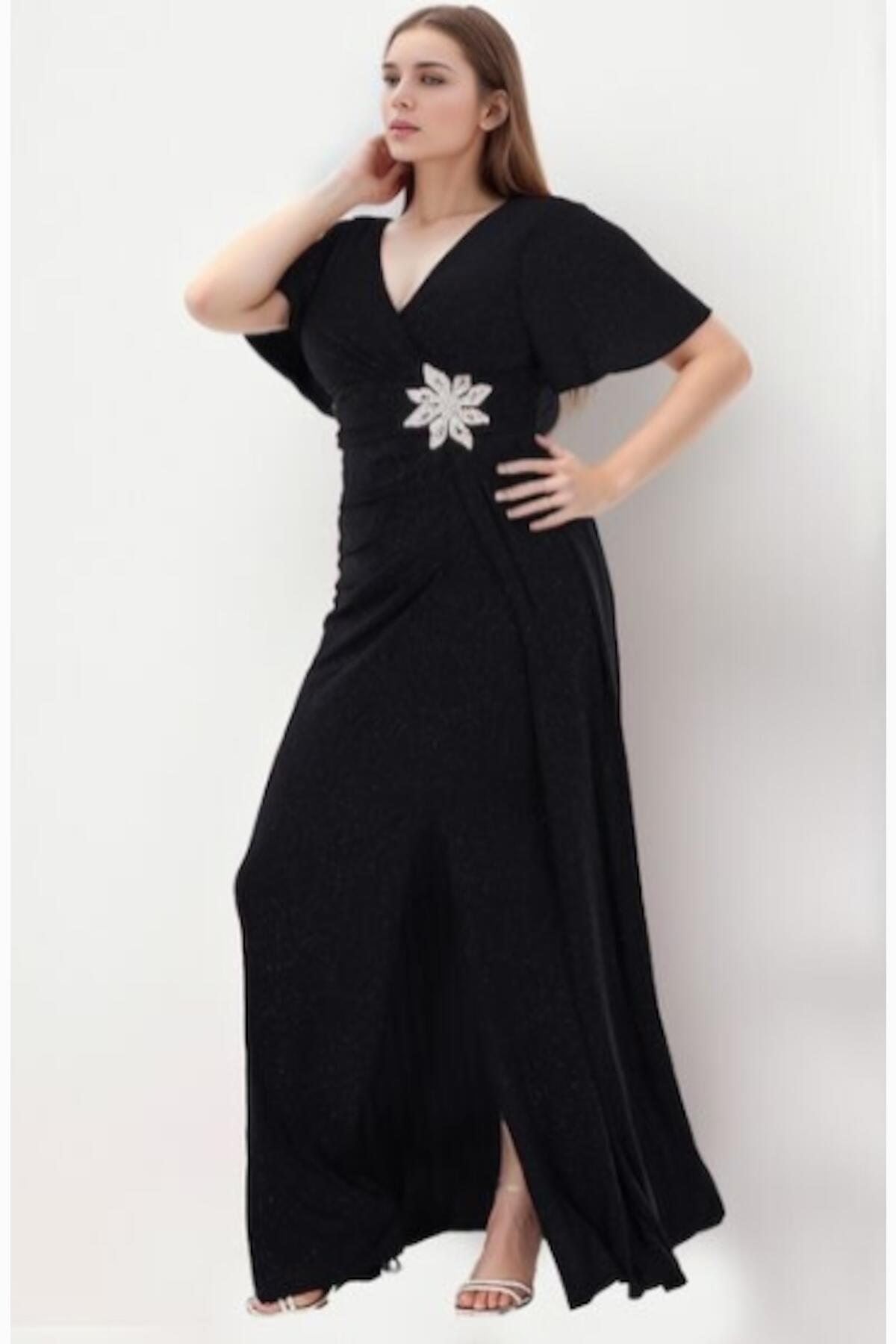 Büyük Beden Kruvaze Yaka Simli Abiye