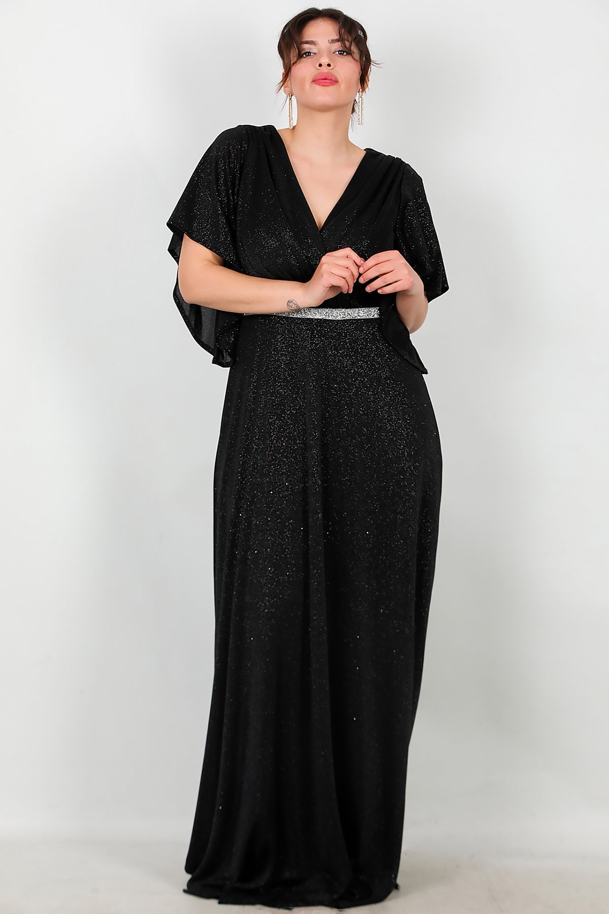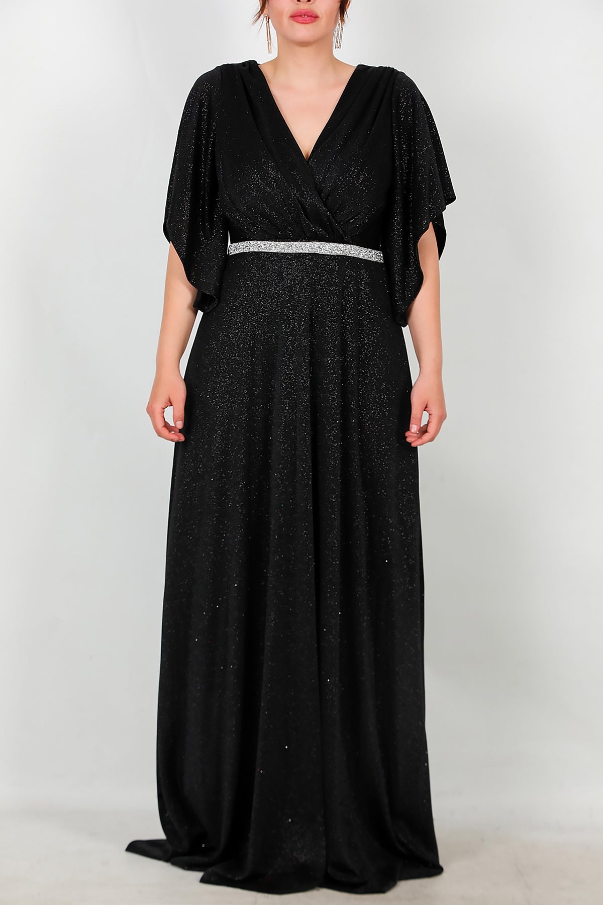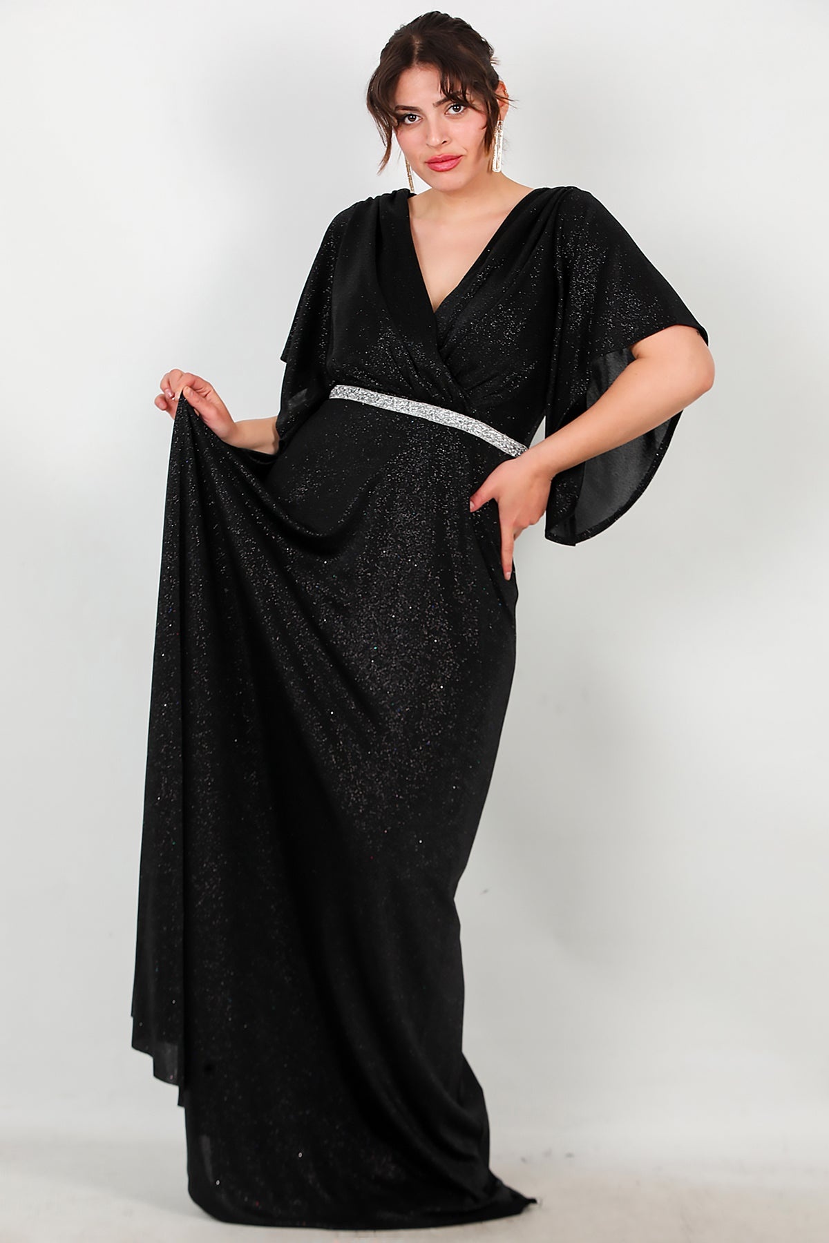 Büyük Beden Beli Taş Şeritli Uzun Abiye Siyah