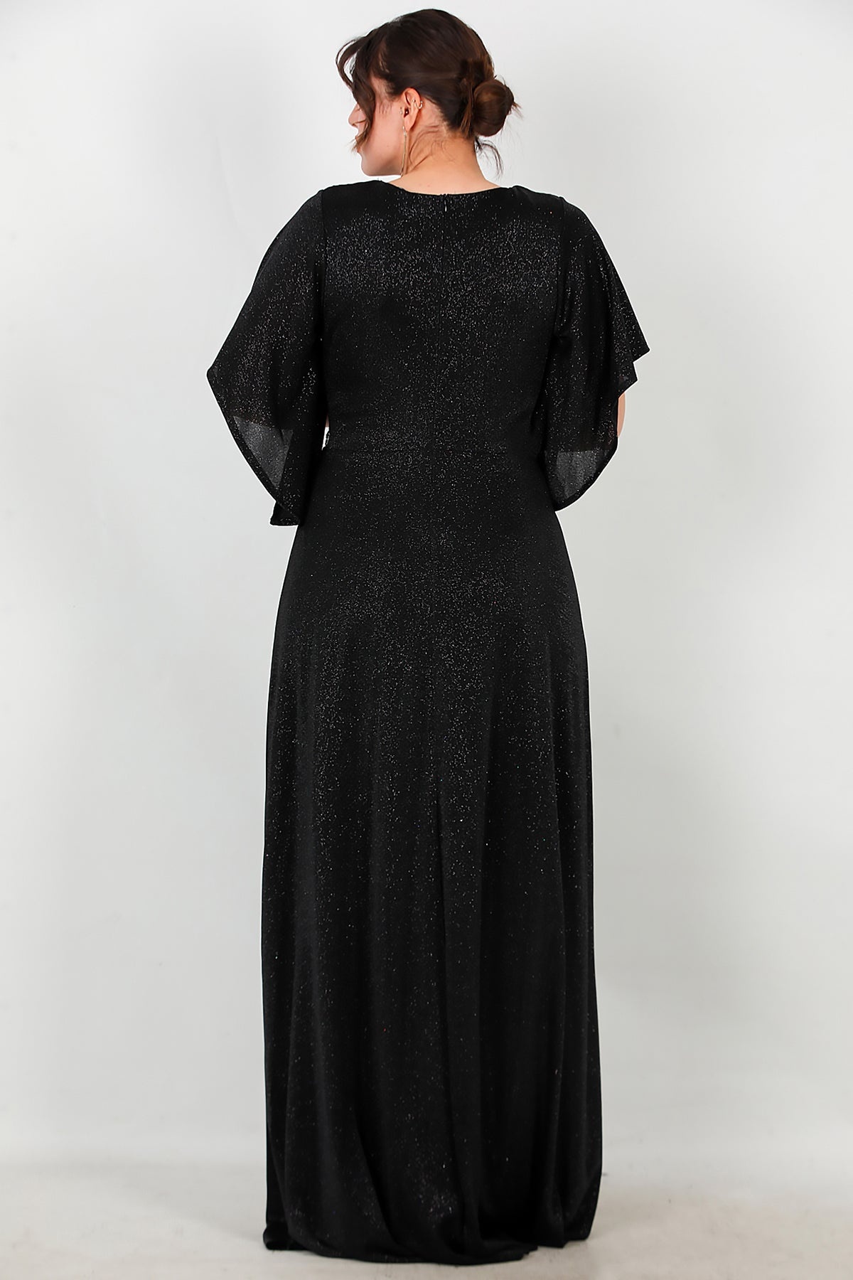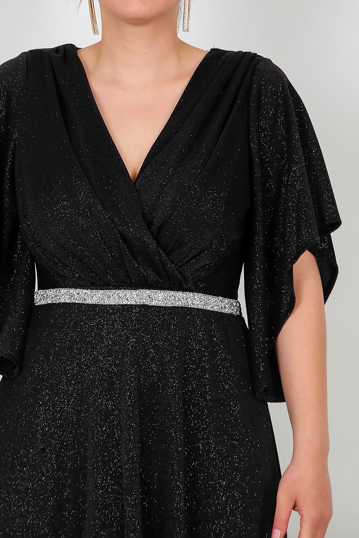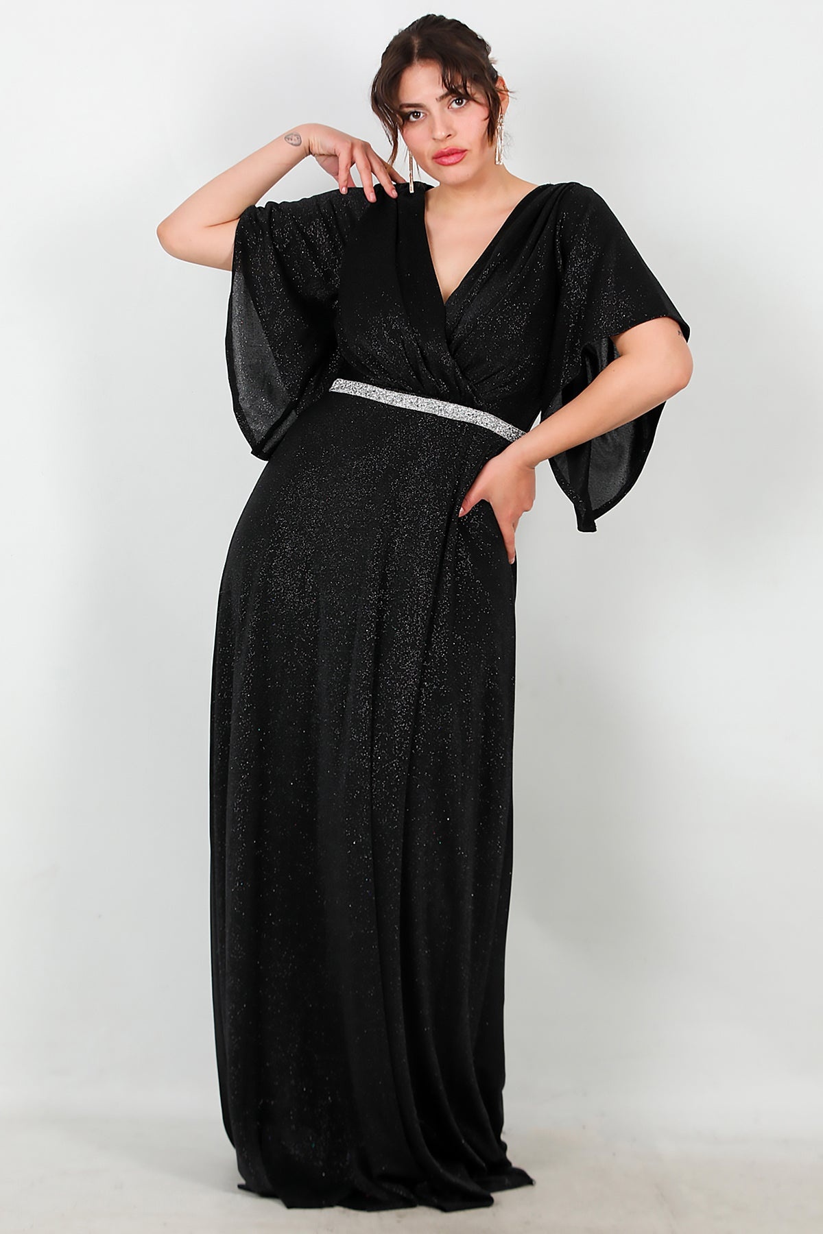 Büyük Beden Beli Taş Şeritli Uzun Abiye Siyah