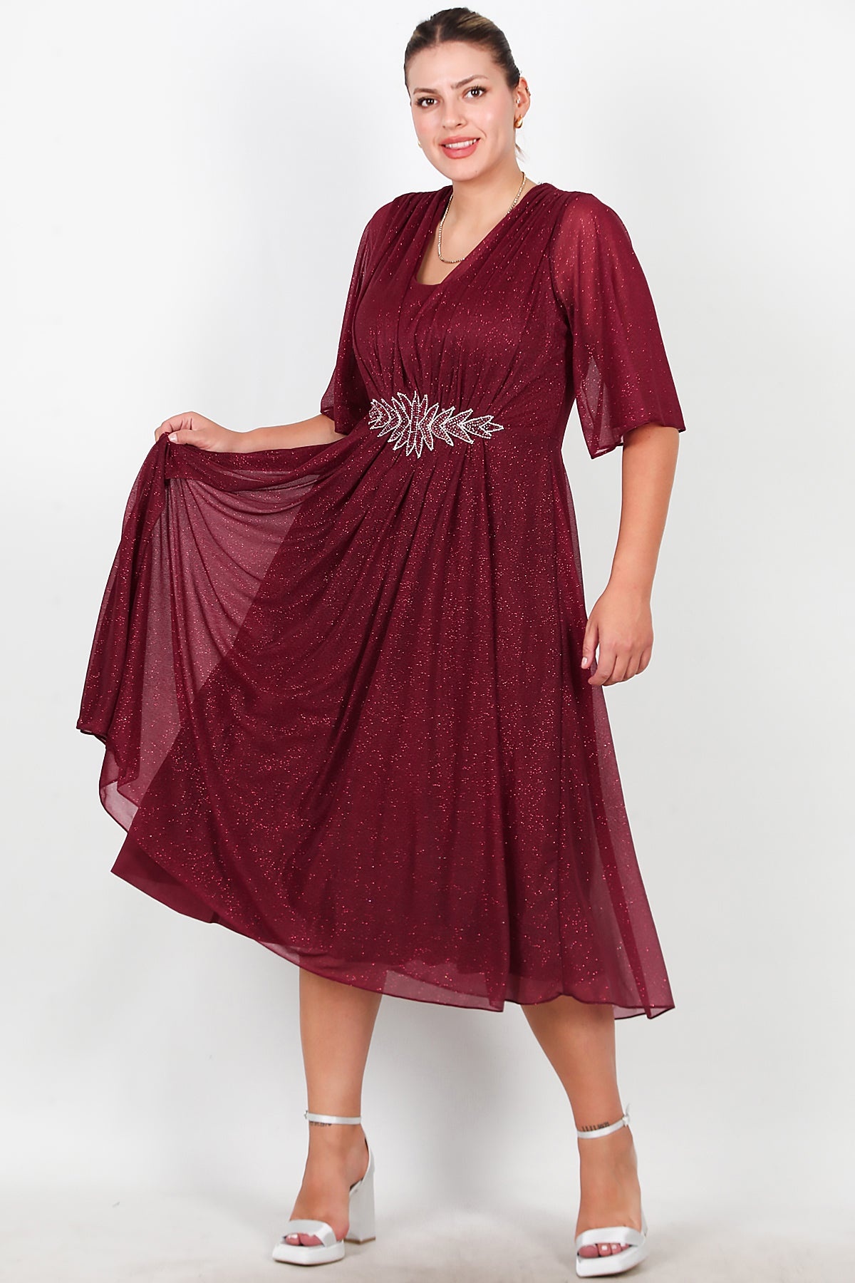 Büyük Beden Beli Taşlı Midi Boy Simli Tül Elbise Bordo