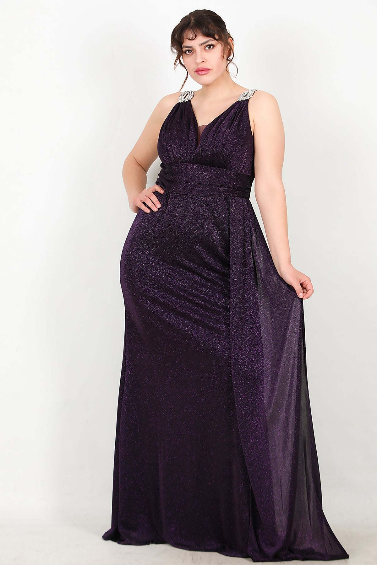 Büyük Beden Omuz Aksesuarlı Uzun Simli Abiye Mor