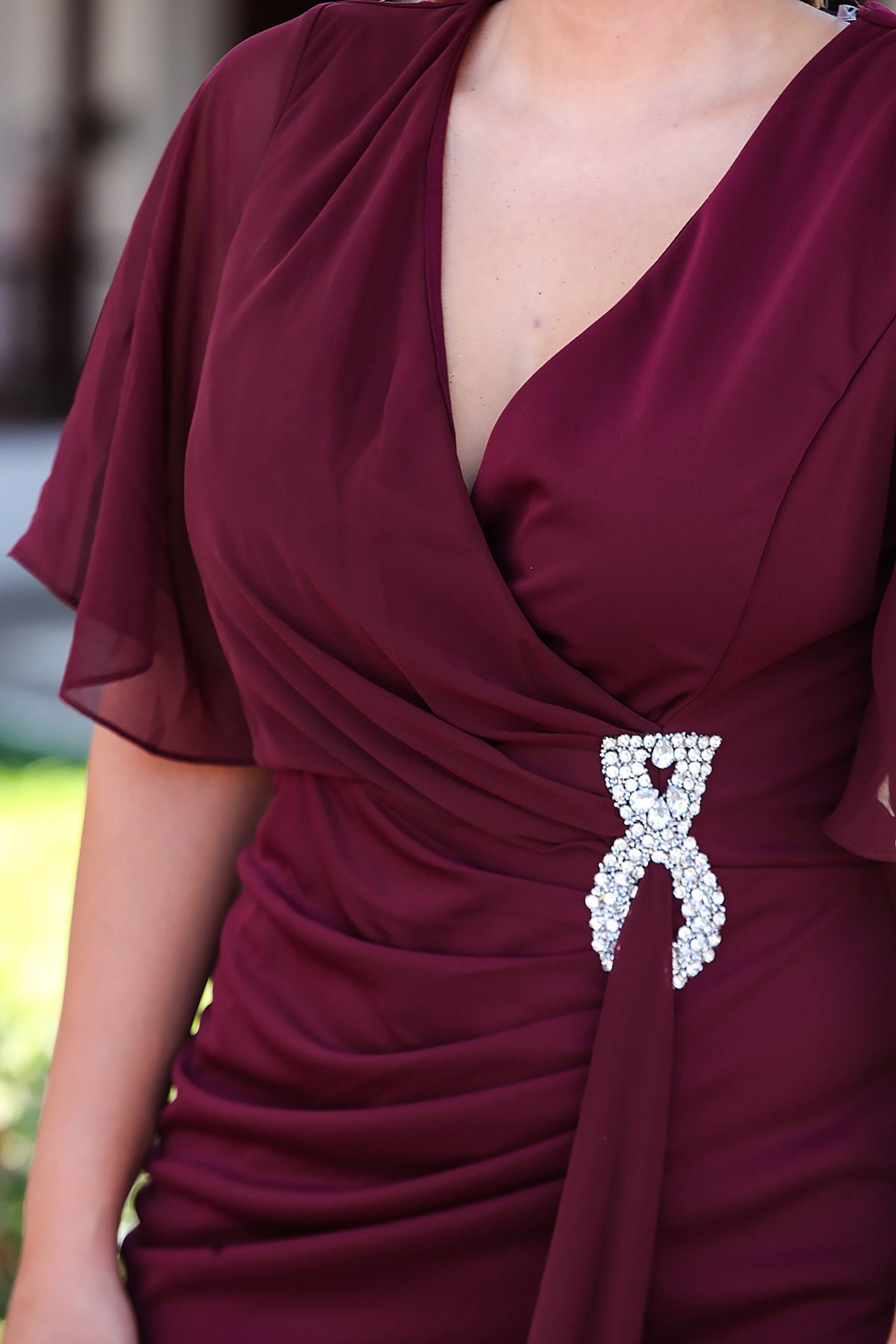 Kadın Büyük Beden Bel Aksesuar Şifon Kısa Abiye Bordo