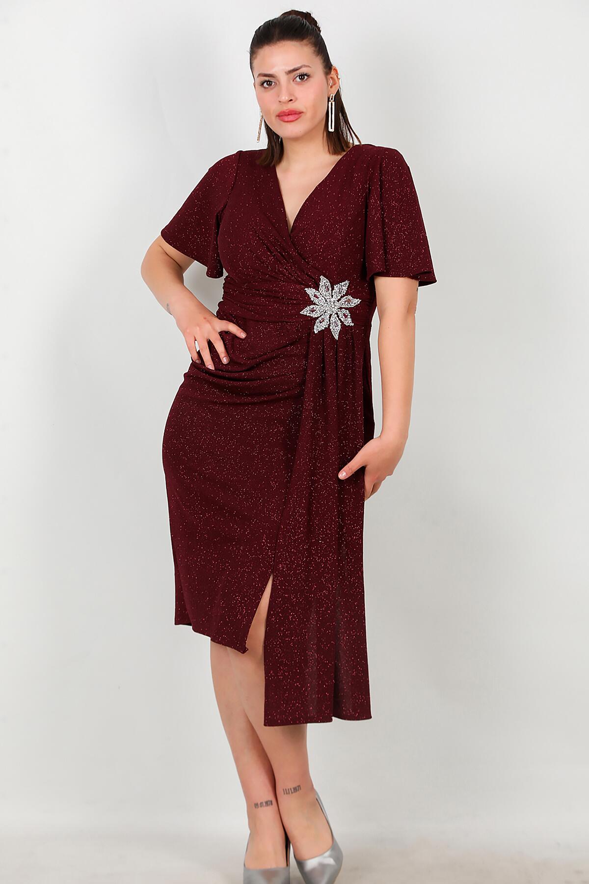 Büyük Beden Beli Çicek Taşlı Midi Boy Abiye Bordo
