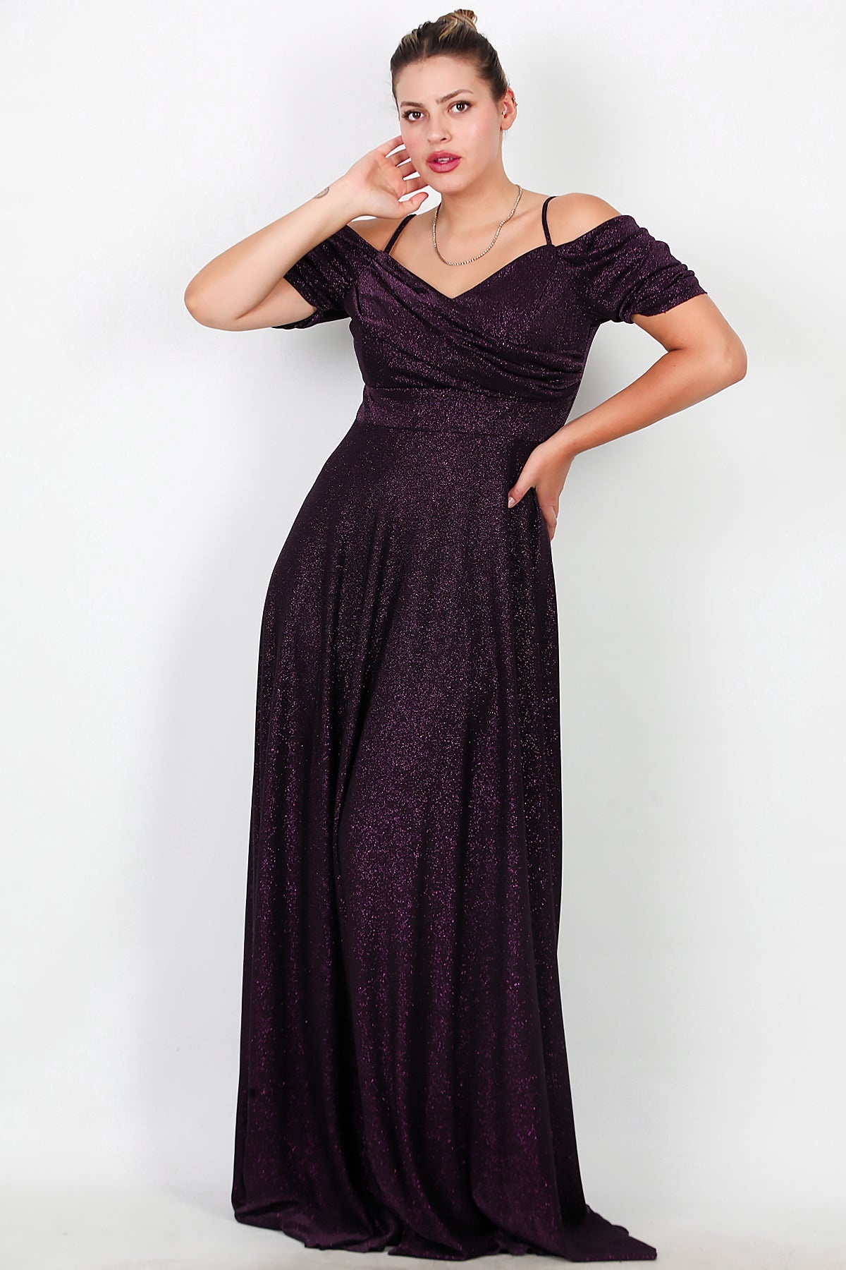 Büyük Beden Düşük Omuz Simli Uzun Abiye Mor