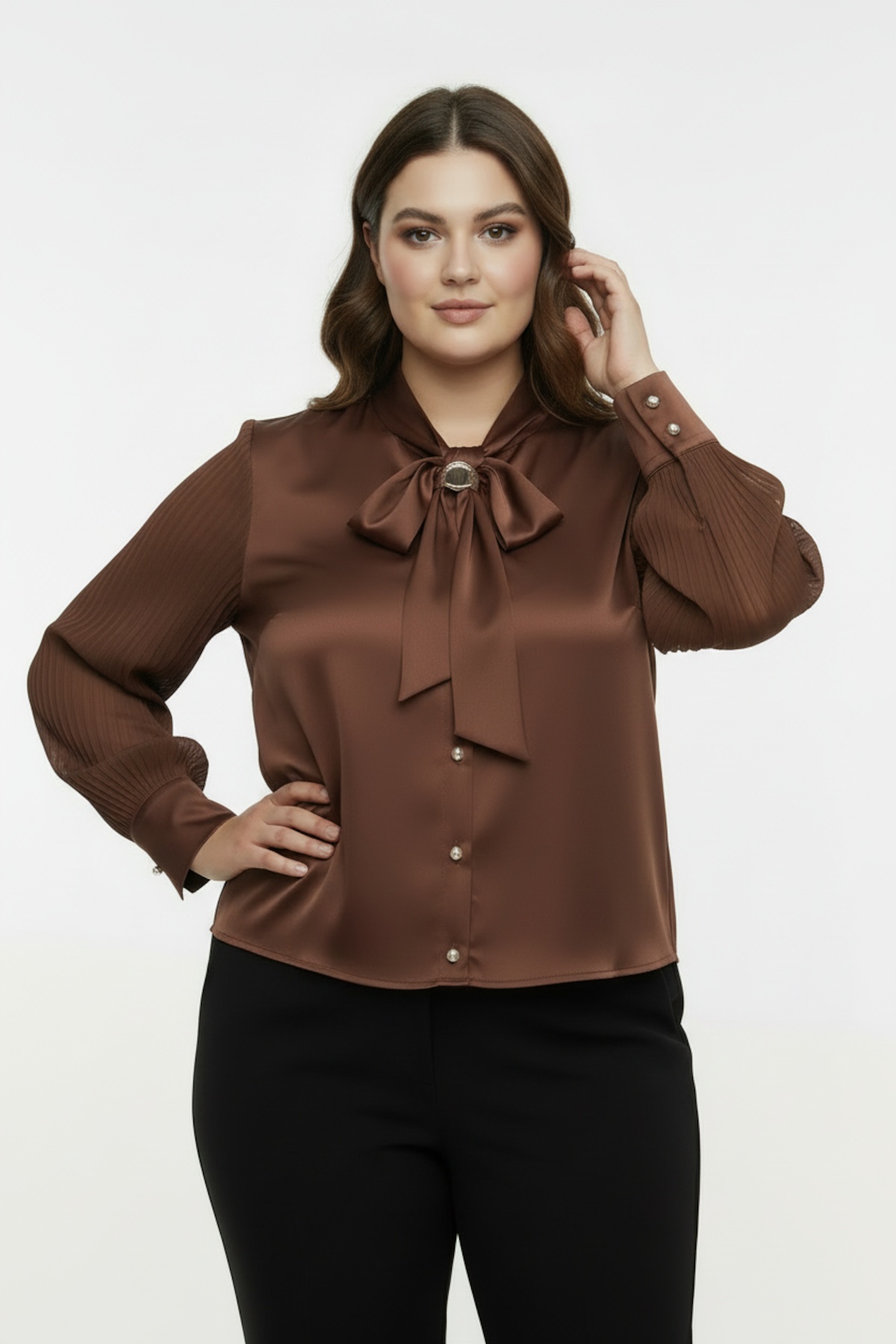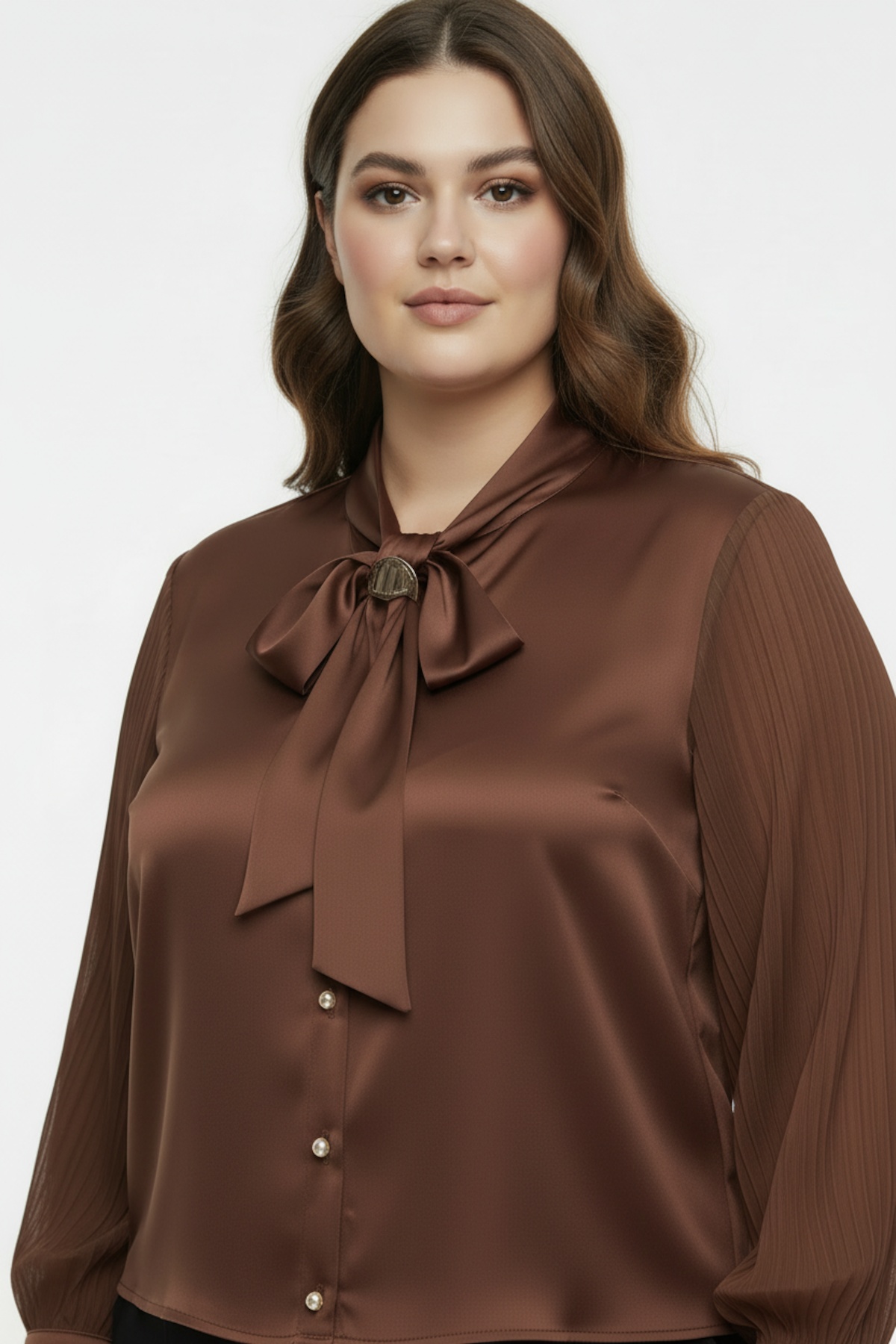 Gardırobunuzu şık bir dokunuşla tamamlayın! Beyaz saten kumaştan üretilen bu zarif gömlek, yakasındaki fular detayı ve altın rengi halka aksesuarıyla göz alıcı bir tasarıma sahip. İnci düğmeleri ve lüks saten kumaşı ile hem iş hayatında hem de özel davetlerde rahatlıkla kullanabileceğiniz çok yönlü bir parça. Zamansız şıklığı modern zarafetle buluşturan bu ürün, stilinize sofistike bir hava katacak.