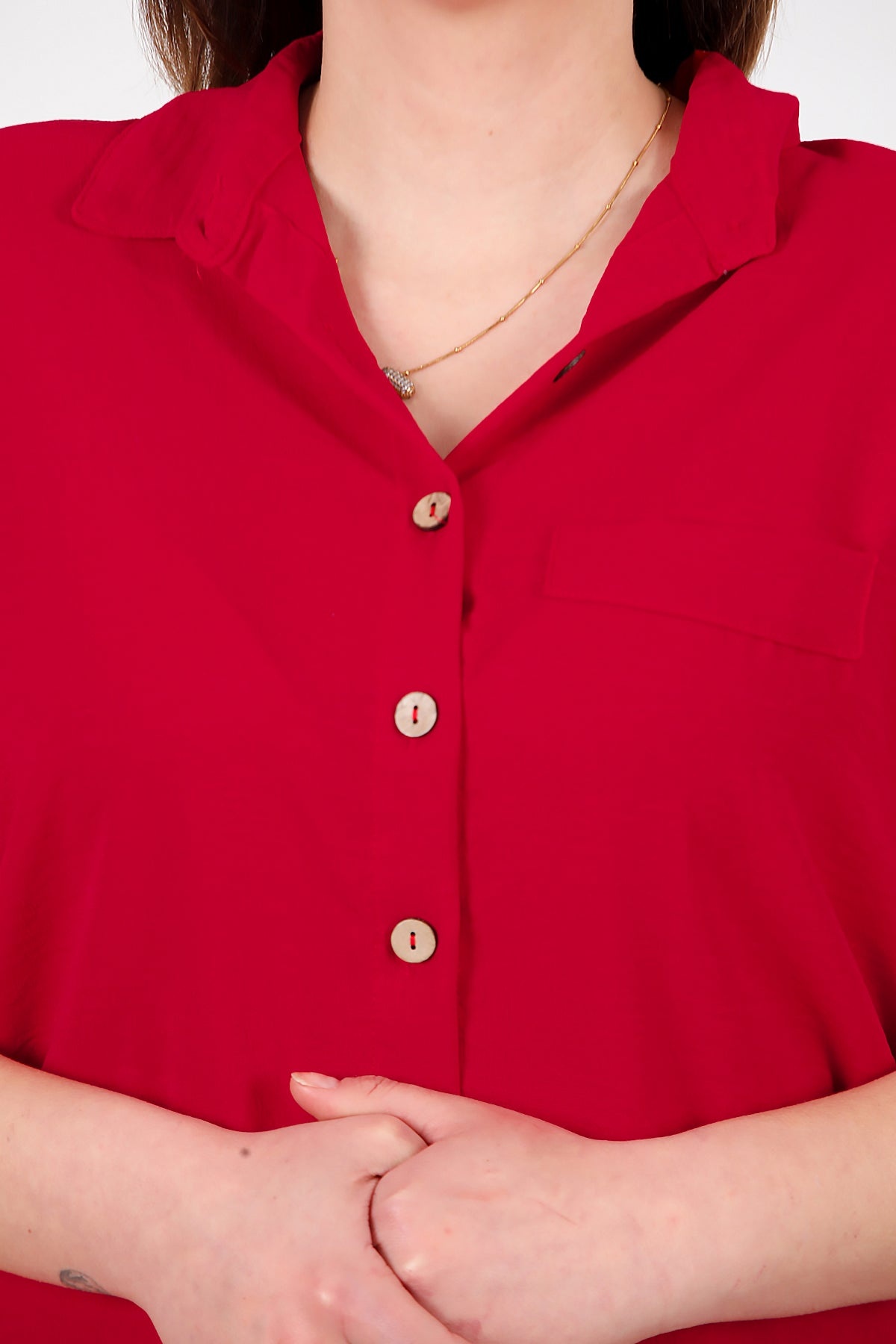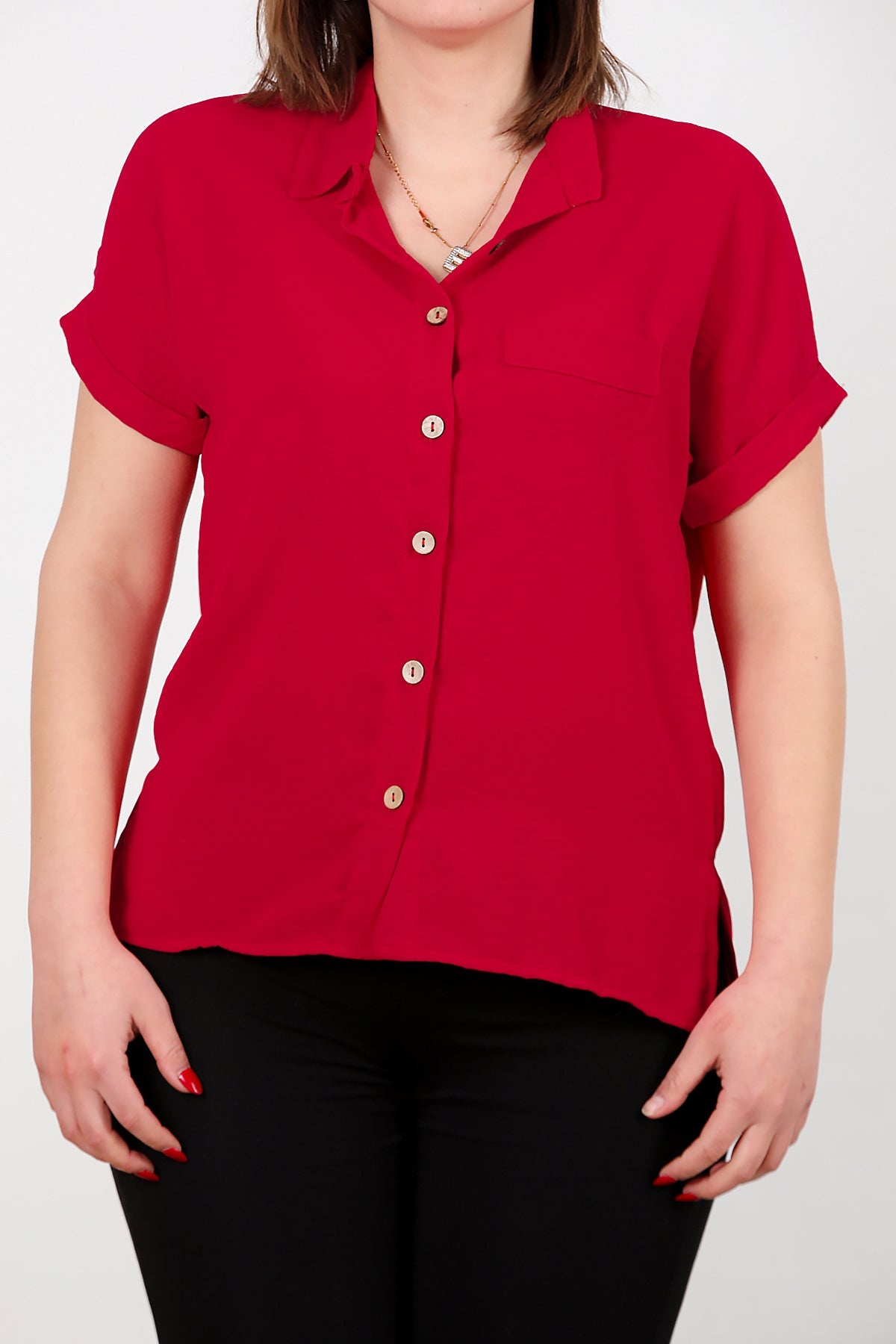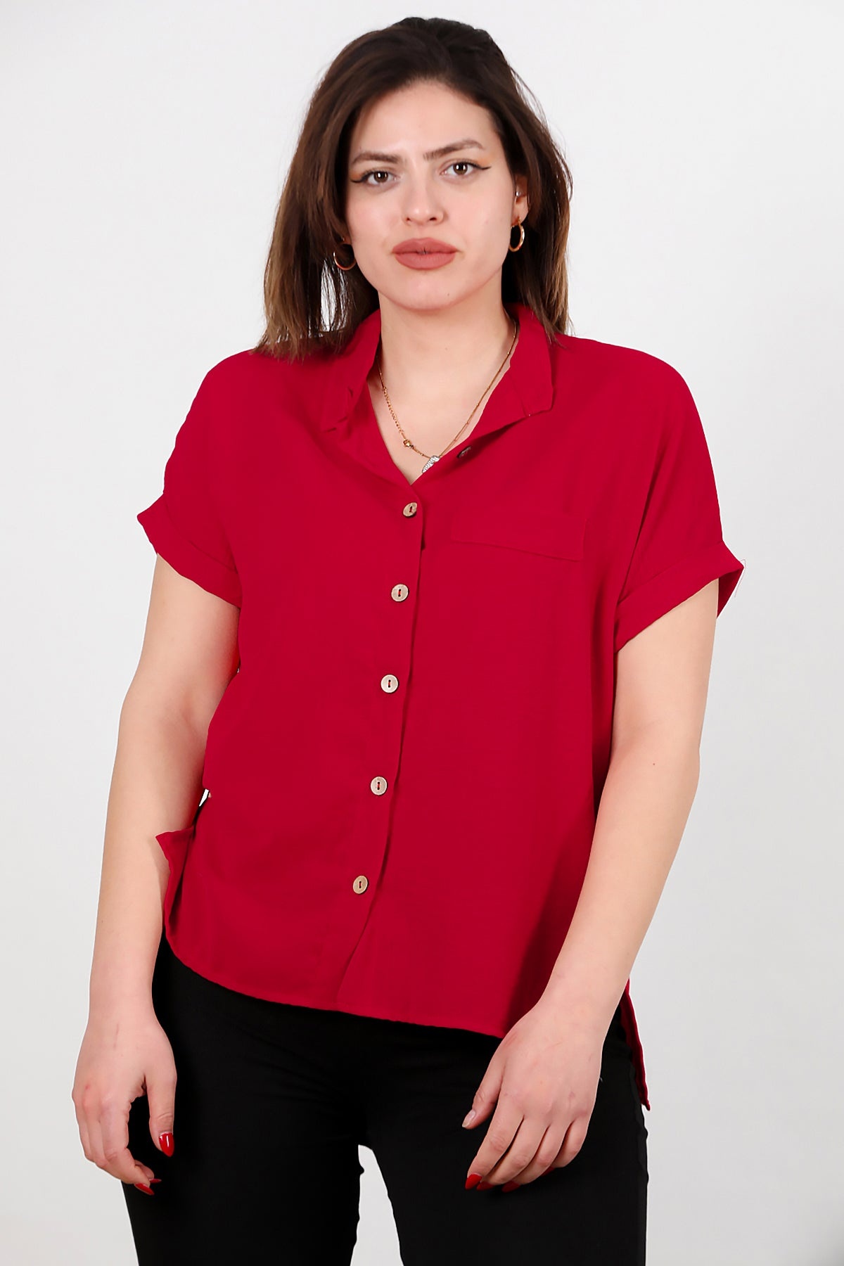 Büyük Beden Gömlek Yaka Tahta Düğmeli Bluz Kırmızı