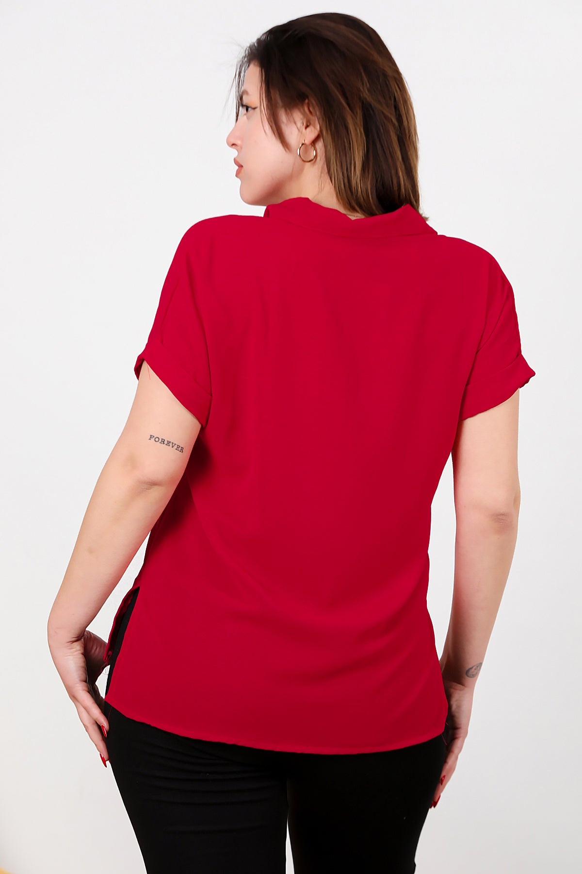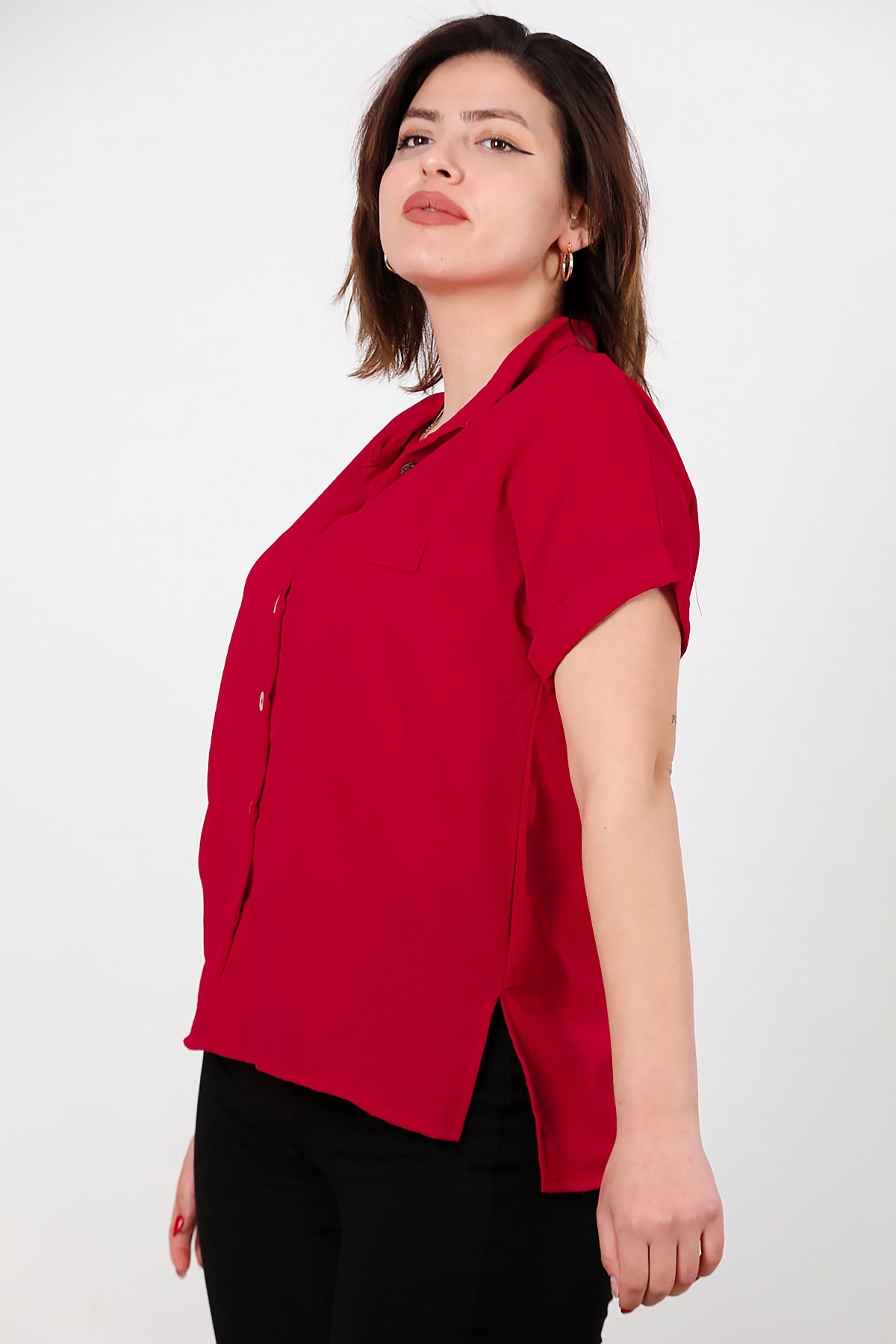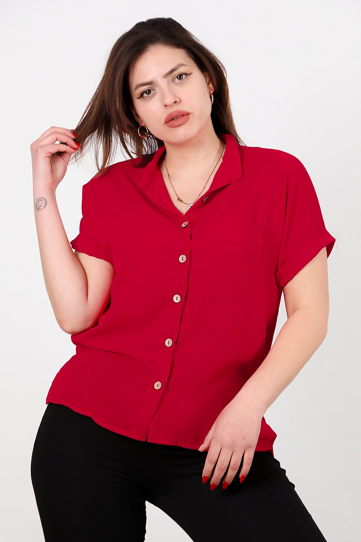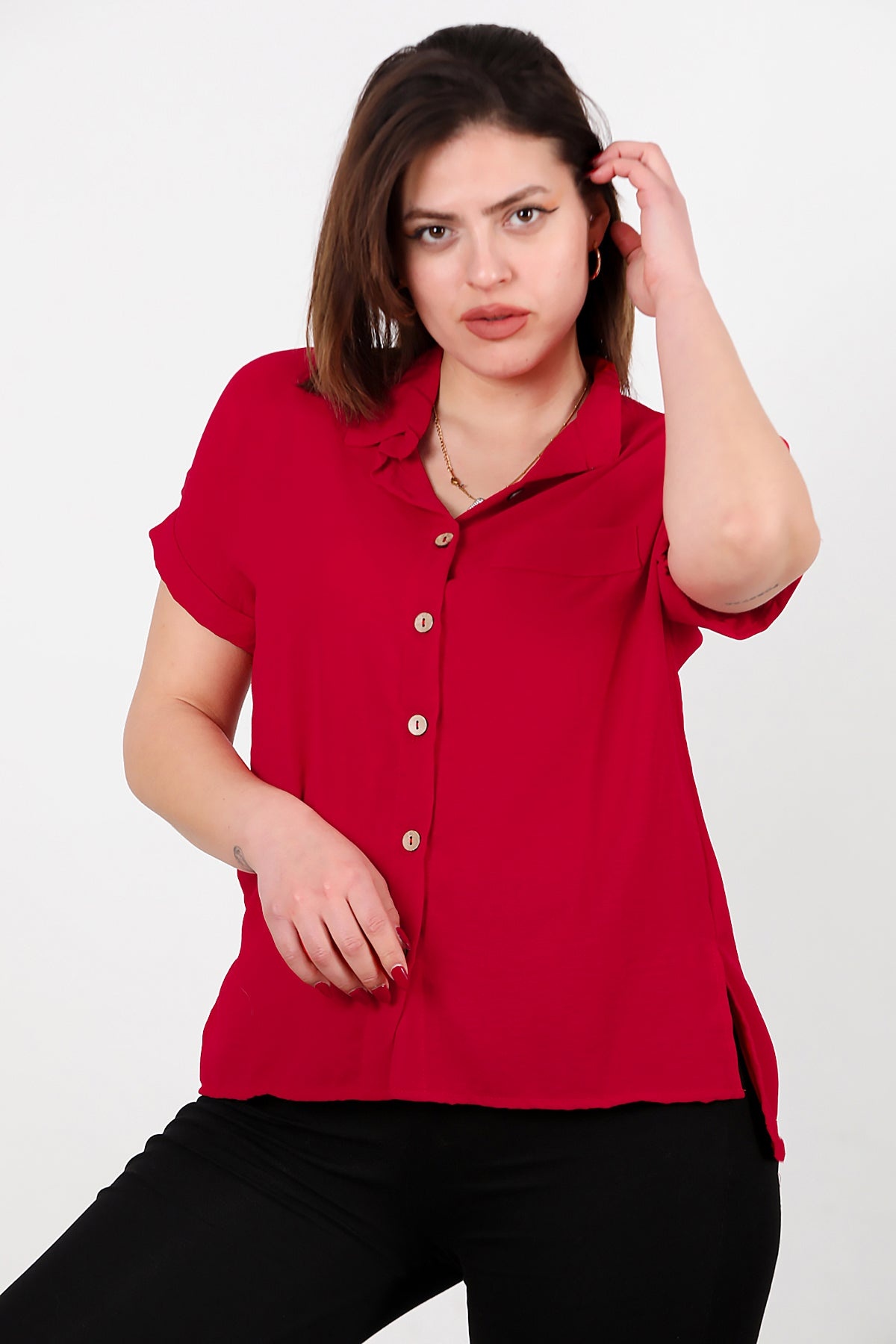 Büyük Beden Gömlek Yaka Tahta Düğmeli Bluz Kırmızı