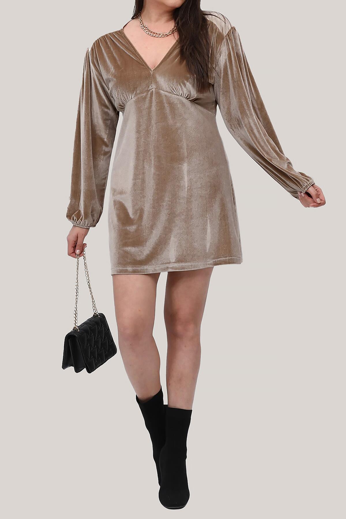 Büyük Beden Kadife Mini Elbise Bej