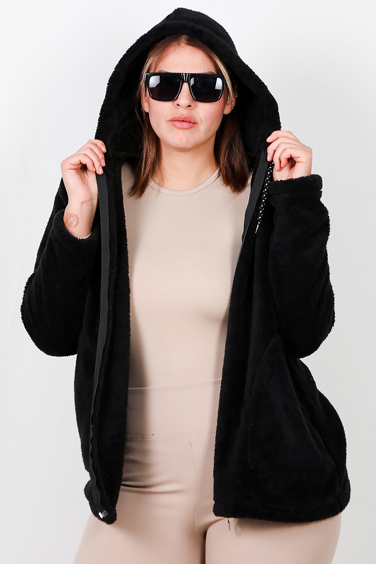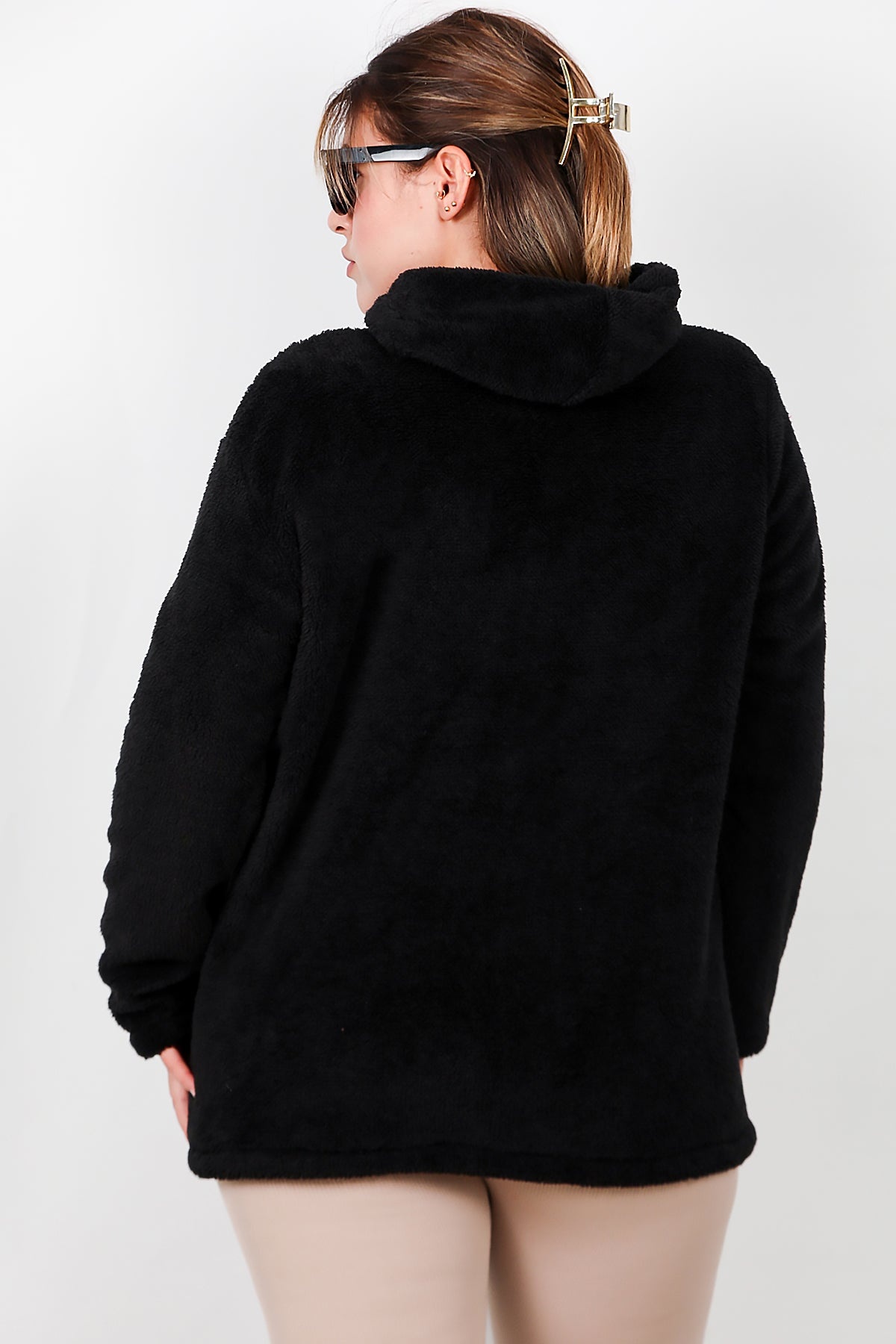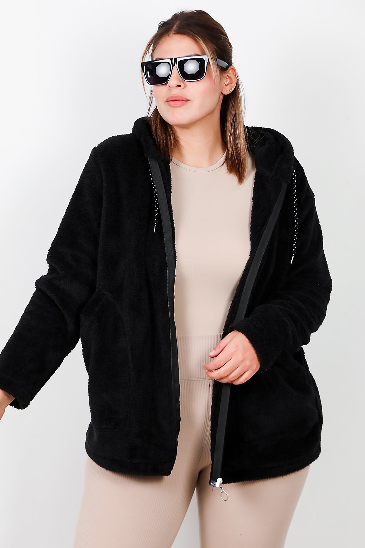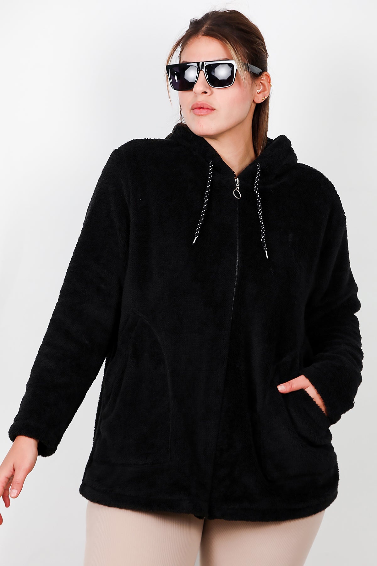 Büyük Beden Kapşonlu Fermuarlı Peluş Ceket Siyah